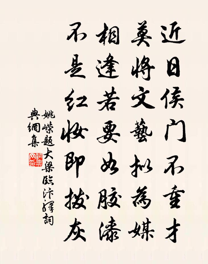 詩詞名句歷史字典書法欣賞書法字典國語詞典說文解字康熙字典古漢語字典標 題 作 者 詩 句 題大梁臨汴驛作者:姚嶸 朝代:唐代題大梁臨汴驛原文近日侯門不重才,莫將文藝擬為媒。相逢若要如膠漆,不是紅妝即撥灰。詩詞問答問:題大梁臨汴驛的作者是誰?答:姚嶸問:題大梁臨汴驛寫於哪個朝代?答:唐代問:題大梁臨汴驛是什麼體裁?答:七絕姚嶸題大梁臨汴驛書法欣賞題大梁臨汴驛書法作品注釋全唐詩:卷870-39詩詞推薦蝶戀花陳允平〔宋代〕牆外鞦韆花影后。環獸金懸,暗綠籠朱牖。為怯輕寒猶殢酒。同心共結懷縴手。粉袖盈盈香淚透。蹙損雙眉,懶畫當置酒曹勛〔宋代〕置酒臨芳觀,張筵繼落暉。選妓調絲竹,迎賓奉酒卮。月影移歌扇,花光照舞衣。霞觴飛白羽,高論吐虹霓。人生和王德和知縣謁蕭千岩韻二首袁說友〔宋代〕詩工解窮人,詞苦乃見意。味公千岩篇,粗了瑟僩義。平生師友念,正爾金蘭契。毋使我回還,執炙不知味。點絳唇(內子生日)周紫芝〔宋代〕人道長生,算來世上何曾有。玉尊長倒。早是人間少。四十年來,歷盡閒煩惱。如今老。大家開口。贏得花前笑。南歌子(端午二首)王之道〔宋代〕角簟橫龜枕,蘭房掛艾人。一尊菖歜泛清醇。好在佳人如玉、映長春。冰徹杯盤瑩,香和笑語薰。蓮花衫子入時新鄭宋用前韻見示因亦和答四首韓元吉〔宋代〕振廩縻金氣自和,政聲誰為勒嵯峨。牛羊壠上饑民絕,鵝鴨池邊勇士多。菊強至〔宋代〕花濃新出黃金礦,枝軟輕垂綠玉條。正色逢人何太晚,清香到酒亦終期。籬邊此意同蕭瑟,霜後無言對寂寥。凡卉園林范成大〔宋代〕園林隨分有清涼,走遍人間夢幾場。鐵硯磨成雙鬢雪,桑弧射得一繩麻。光陰畫紙為棋局,事業看題檢藥囊。受用沁園春佚名〔宋代〕昨夜南京,今朝北*岳,倏焉忽然。遇洞中有酒,渴來好飲,君山作枕,醉後高昵。出入無跡,往來不定,半似痴二十三日大雪彌甚方回〔宋代〕壓船塞戶路迷迷,絮帽氈衣馬緩驅。一夜遽然三尺許,萬家歡謂幾年照。美觀頓覺湖山改,生意潛回草木枯。面賤舜廟懷古劉熊渠〔兩漢〕游湘有餘怨,豈是聖人心。竹路猿啼古,祠宮蔓草深。素風傳舊俗,異跡閉荒林。巡狩去不返,煙雲怨至今。江城夜泊陸龜蒙〔唐代〕漏移寒箭丁丁急,月掛虛弓靄靄明。此夜離魂堪射斷,更須江笛兩三聲。虹縣嚴孝子墓劉灣〔唐代〕至性教不及,因心天所資。禮聞三年喪,爾獨終身期。下由骨肉恩,上報父母慈。禮聞哭有卒,汝獨哀無時。前有白蘋洲新樓曰溪山偉觀釋居簡〔宋代〕溪頭煙暖蘋花春,豈獨滿渚亦滿汀。春城綺繡艷溪曲,柔玉摻摻歌采蘋。采采芳鮮日將暮,玉盌瓊盂旋分貯。水晶題妙覺寺朱利賓〔宋代〕有民增吏役,無事愛僧家。不憚山頭路,來煎飯後茶。鍾魚雖闃寂,松竹自交加。掃榻須盤薄,吾生會有涯。奉和聖製上元晏殊〔宋代〕風掖千門迥,金缸四照然。市圜通夜闕,歌肆與雲連。疊鼓迷清漏,游車際曉天。泛膏仍潔祀,蠶麥佇登年。春意漸深送客至山麓田舍來往道中復逢法上人釋正覺〔宋代〕隔年相逢瘦驚許,風立溪頭少時語。緘情客上釣魚磯,四面垂雲一蓑雨。宮詞王珪〔唐代〕兩班齊賀玉關清,新奏熙州曲破成。畫鼓連聲催攧遍,內人多半未知名。好事近(春暮)趙善括〔宋代〕風雨做春愁,桃杏一時零落。是處綠肥紅瘦,怨東君情薄。行 * 倚望江樓,雙燕度簾幕。回首故園應在,誤鞦韆贈淨土嵩長老強至〔宋代〕林泉久安住,心境兩無塵。禪外牽餘想,詩中老此身。虛懷延海眾,雄辯服談賓。偉特如師少,相逢悟宿因。名句推薦落日照大旗,馬鳴風蕭蕭。杜甫《後出塞五首》 縱被無情棄,不能羞。韋莊《思帝鄉·春日游》 走馬西來欲到天,辭家見月兩回圓。岑參《磧中作》 銀箭金壺漏水多,起看秋月墜江波。李白《烏棲曲》 晨昏滾滾水東流,今古悠悠日西墜。錢福《明日歌》 月到東南秋正半。雙闕中間,浩蕩流銀漢。王國維《蝶戀花·月到東南秋正半》 古之史也辯道,今之史也耀文。王通《中說·卷三·事君篇》 綠兮絲兮,女所治兮。我思古人,俾無訧兮!佚名《綠衣》 粉黛暗愁金帶枕,鴛鴦空繞畫羅衣,那堪辜負不思歸!顧敻《浣溪沙·雲淡風高葉亂飛》 千里搭長棚,沒有不散的筵席。曹雪芹《紅樓夢·第七十二回》