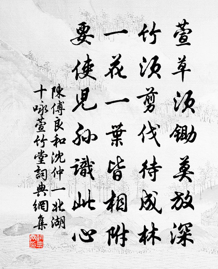詩詞名句歷史字典書法欣賞書法字典國語詞典說文解字康熙字典古漢語字典標 題 作 者 詩 句 和沈仲一北湖十詠萱竹堂作者:陳傅良 朝代:宋代和沈仲一北湖十詠萱竹堂原文萱草須鋤莫放深,竹須剪伐待成林。一花一葉皆相附,要使兒孫識此心。詩詞問答問:和沈仲一北湖十詠萱竹堂的作者是誰?答:陳傅良問:和沈仲一北湖十詠萱竹堂寫於哪個朝代?答:宋代陳傅良和沈仲一北湖十詠萱竹堂書法欣賞和沈仲一北湖十詠萱竹堂書法作品詩詞推薦楊柳枝詞裴夷直〔唐代〕已作綠絲籠曉日,又成飛絮撲晴波。隋家不合栽楊柳,長遣行人春恨多。答謝諮議謝靈運〔南北朝〕古人善身。實畏斯名。緣督何貴。卷耀藏馨。九言之贈。實由未冥。片音或重。璵璠可輕。鵲橋仙韋驤〔宋代〕歲華將暮,寒林蕭索,極目凍雲垂地。官梅忽見一枝芳,便頓覺、新春情味。小筵開處,歌喉清婉,舞態蹁躚爭媚九日烹二雞終不得酒方回〔宋代〕長女近歸寧,念母省所患。臨別無可烹,僅餘一老雁。茲辰遂重九,空庖絕芻豢。伏雌劣足膳,時醪靡由辦。平生謝京師故人元絳〔宋代〕丹荔黃甘北苑茶,勞君誘我向天涯。爭如太液樓邊看,池北池南總是春。又和韓偓〔唐代〕櫻桃花下會親賢,風遠銅烏轉露盤。蝶下粉牆梅乍坼,蟻浮金斝酒難乾。雲和緩奏泉聲咽,珠箔低垂水影寒。狂簡水運行王建〔唐代〕西江運船立紅幟,萬棹千帆繞江水。去年六月無稻苗,已說水鄉人餓死。縣官部船日算程,暴風惡雨亦不停。在生偈頌七十六首釋師範〔宋代〕指月與話月,檐雪共填井。玩月與捧月,未免弄光影。月聻仿佛似鹽官扇子,元來始是雲門胡餅。浣溪沙張孝祥〔宋代〕樓下西流水拍堤。樓頭日日望春歸。雪晴風靜燕來遲。留得梅花供半額,要將楊葉畫新眉。莫教辜負早春時。無心釋文珦〔宋代〕出本無心倦即歸,悠悠天地一支離。此真難與時人說,惟有山雲乃得知。詠史詩博浪沙胡曾〔唐代〕嬴政鯨吞六合秋,削平天下虜諸侯。山東不是無公子,何事張良獨報仇。閒居書事魏野〔宋代〕無才動聖君,養拙住山村。臨事知閒貴,澄心覺道尊。成家書滿屋,添口鶴生孫。仍喜多時雨,經春免灌園。漁家傲(病中未及過毗陵)張炎〔宋代〕門掩新陰孤館靜。楊花卻解來相趁。幾日方知因酒病。無憀甚。脫巾掛壁將書枕。見說紅堆滿徑。不知何處遊人盛汾山驚秋蘇廷碩〔唐代〕北風吹白雲,萬里渡河汾。心緒逢搖落,秋聲不可聞。途中寄懷羅隱〔唐代〕不知何處是前程,合眼騰騰信馬行。兩鬢已衰時未遇,數峰雖在病相攖。塵埃鞏洛虛光景,詩酒江湖漫姓名。試哭寄題翠侍軒顧逢〔宋代〕華軒居地隱,塵世總相忘。白髮坐來久,青山立在旁。兩峰如拱手,一鶴自升堂。唯諾疑相應,松琴奏羽商。奉寄韋太守陟王維〔唐代〕荒城自蕭索,萬里山河空。天高秋日迥,嘹唳聞歸鴻。寒塘映衰草,高館落疏桐。臨此歲方晏,顧景詠悲翁。故人山居雜詩九十首曹勛〔宋代〕閒居必家釀,不以空乏廢。小槽壓春碧,渾含揖和氣。三杯御客寒,一卮款仆意。寧論有賢聖,且復供村醉。和陳天予見寄真字韻吳芾〔宋代〕前賢惟有太丘真,豈謂於今見後身。雖是一時為逐客,不妨千古作全人。自從別從心如渴,卻喜詩來句絕塵。無計金州陳昉〔宋代〕湘中惟此郡,地接五溪蠻。楚水波長碧,堯時竹尚斑。昔曾行樂處,今在夢魂間。橋墩是先建,休言我涕潸。名句推薦蘭葉春葳蕤,桂華秋皎潔。張九齡《感遇十二首·其一》 九日登高處,群山入望賒。趙時春《原州九日》 賢能不待次而舉,罷不能不待須而廢。荀子《荀子·王制》 冰合大河流,茫茫一片愁。納蘭性德《菩薩蠻·白日驚飈冬已半》 柳葉雙眉久不描,殘妝和淚污紅綃。江采萍《謝賜珍珠》 獨立雕欄,誰憐枉度華年。王沂孫《高陽台·殘萼梅酸》 馬思邊草拳毛動,雕眄青雲睡眼開。劉禹錫《始聞秋風》 春水碧於天,畫船聽雨眠。韋莊《菩薩蠻·人人盡說江南好》 無肉令人瘦,無竹令人俗。蘇軾《於潛僧綠筠軒》 今我來思,雨雪載途。佚名《出車》