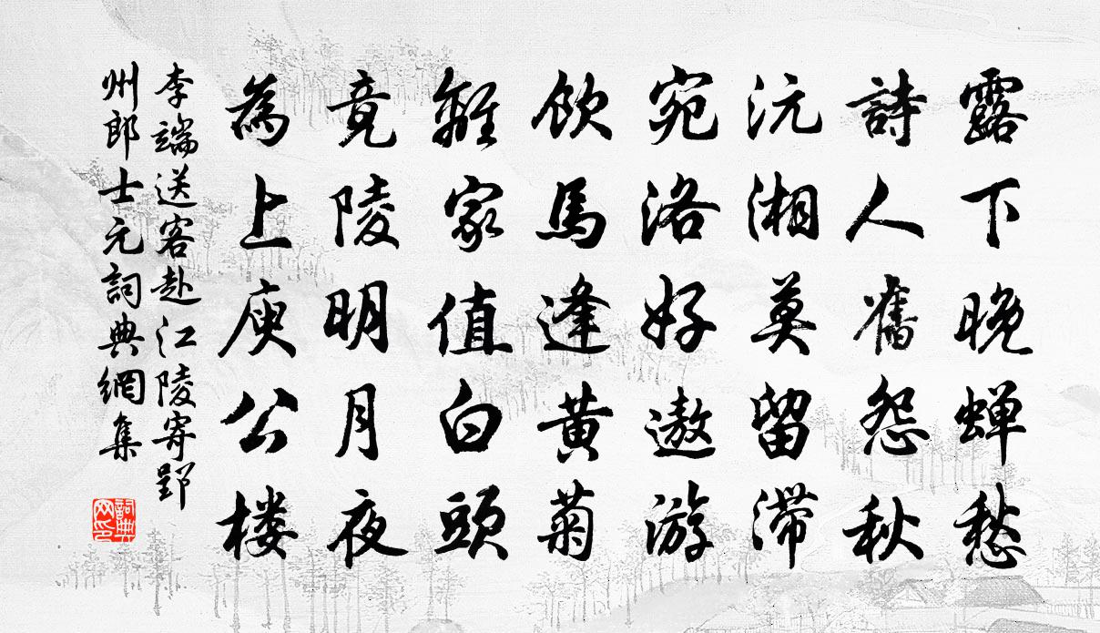 詩詞名句歷史字典書法欣賞書法字典國語詞典說文解字康熙字典古漢語字典標 題 作 者 詩 句 送客赴江陵寄郢州郎士元作者:李端 朝代:唐代送客赴江陵寄郢州郎士元原文露下晚蟬愁,詩人舊怨秋。沅湘莫留滯,宛洛好遨遊。飲馬逢黃1/1菊,離家值白頭。竟陵明月夜,為上庾公樓。詩詞問答問:送客赴江陵寄郢州郎士元的作者是誰?答:李端問:送客赴江陵寄郢州郎士元寫於哪個朝代?答:唐代問:送客赴江陵寄郢州郎士元是什麼體裁?答:五律李端送客赴江陵寄郢州郎士元書法欣賞送客赴江陵寄郢州郎士元書法作品注釋全唐詩:卷285_52詩詞推薦句高似孫〔宋代〕沙泠雁三二,天長帆有無。尋白石山真禪師舊草堂劉長卿〔唐代〕惆悵雲山暮,閒門獨不開。何時飛杖錫,終日閉蒼苔。隔嶺春猶在,無人燕亦來。誰堪暝投處,空復一猿哀。利路提刑亡伯郎中輓詞二首蘇轍〔宋代〕晚歲官仍困,終身恥自言。廉明漢循吏,仁愛鄭公孫。赤縣朝稱理,衡山德共尊。遠人應罷市,處處有遺恩。崖邊積雪取食清甚賦此張栻〔宋代〕陰崖積雪射寒光,入齒清甘得味嘗。應是山神知客意,故將瓊液沃詩腸。東皋十首晁補之〔宋代〕新植青桐小逕成,兩行萱草一時榮。春風百卉芳菲盡,長夏幽花卻稱情。鶯出谷劉莊物〔唐代〕幸因辭舊谷,從此及芳晨。欲語如調舌,初飛似畏人。風調歸影便,日暖吐聲頻。翔集知無阻,聯綿貴有因。喜遷宿石壁山館郭忠謨〔宋代〕斜陽在山客在船,片帆點破澄江天。攜筇上踏籠頭月,釣篷穩擊蘆花雪。夜深野鶴穿雲歸,正是山房酒醒時。羽衣一念陳起〔宋代〕一念無塵雜,三更有夢回。同他石橋老,過水探寒梅。七夕宋之問〔唐代〕傳道仙星媛,年年會水隅。停梭借蟋蟀,留巧付蜘蛛。去晝從雲請,歸輪佇日輸。莫言相見闊,天上日應殊。哭秘書包大監孟郊〔唐代〕哲人臥病日,賤子泣玉年。常恐寶鏡破,明月難再圓。文字未改素,聲容忽歸玄。始知知音稀,千載一絕弦。舊館送同少野赴華藏寺二首陳著〔宋代〕落花流水去帆孤,風雨交情奈老夫。詩屋知誰共雲月,笑圖和我入江湖。千山遮眼夢自到,萬笠傳聲書可無。家有題伍員廟徐凝〔唐代〕千載空祠雲海頭,夫差亡國已千秋。浙波只有靈濤在,拜奠青山人不休。有所思於石〔宋代〕君在南山南,水闊雲漫漫。我在北山北,木落天地寬。所思不可見,孤峰碧巑屼。片雲遙相望,脈脈一水間。水流贈史昭王昌齡〔唐代〕東林月未升,廓落星與漢。是夕鴻始來,齋中起長嘆。懷哉望南浦,渺然夜將半。但有秋水聲,愁使心神亂。握中涼軒柳說〔宋代〕瀟灑幽軒好,清間令尹才。庭虛走泉響,門靜對山開。夏可捐班扇,風如到楚台。羨君成吏隱,終日遠紛埃。春秋戰國門趙簡子周曇〔唐代〕簡子雄心蓄霸機,賢愚聊欲試諸兒。假言藏寶非真寶,不是生知焉得知。隆興書堂自警三十五首陳淳〔宋代〕古人用功處,步步最縝密。胡爾大闊疏,踐履無其實。燈花梅堯臣〔宋代〕灼灼生寒燼,終朝照席明。從教占有驗,燃滅本無情。和洪秀才八首胡寅〔宋代〕杖策紛紛是,誰能志大猷。{牧去攵加角}衣與糲飯,長夏及清秋。辯論輕三耳,齋明見兩眸。聖門多要妙,文藝翠微山居八首趙彥端〔宋代〕閒來石上臥長松,百衲袈裟破又縫。今日不愁明日飯,生涯只在缽杯中。名句推薦蝸角虛名,蠅頭微利,算來著甚乾忙。蘇軾《滿庭芳·蝸角虛名》 孤客傷逝湍,徒旅苦奔峭。謝靈運《七里瀨》 半溪流水綠,千樹落花紅。車萬育《聲律啟蒙·上卷·一 東》 惱他香閣濃睡,撩亂有啼鶯。晏殊《訴衷情·東風楊柳欲青青》 顧此耿耿存,仰視浮雲白。文天祥《正氣歌》 尚想舊情憐婢僕,也曾因夢送錢財。元稹《遣悲懷三首·其二》 落日無人松徑里,鬼火高低明滅。薩都剌《念奴嬌·登石頭城次東坡韻》 高齋今夜雨,獨臥武昌城。徐禎卿《在武昌作》 行人刁鬥風沙暗,公主琵琶幽怨多。李頎《古從軍行》 坐看黑雲銜猛雨,噴灑前山此獨晴。崔道融《溪上遇雨二首》