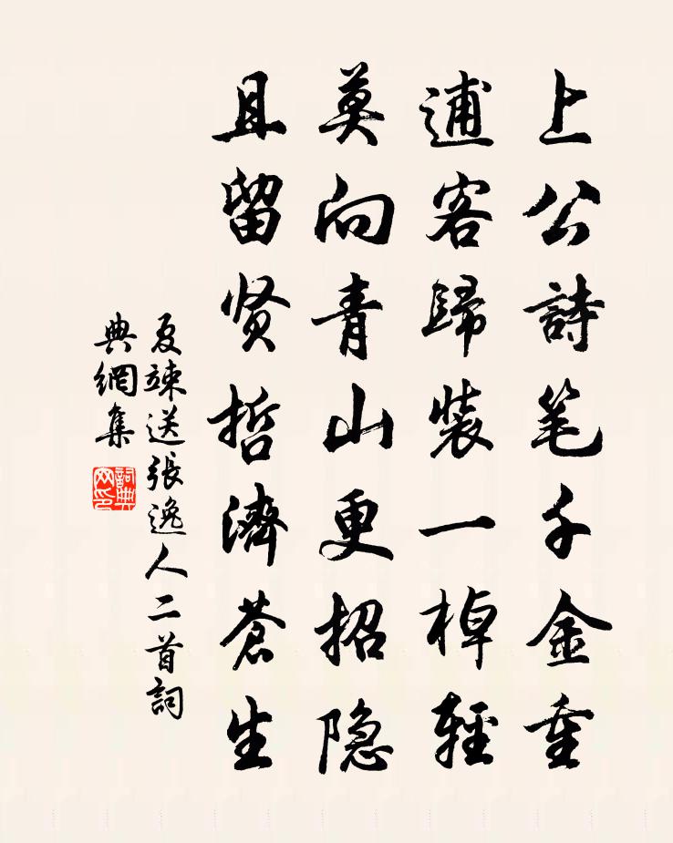 詩詞名句歷史字典書法欣賞書法字典國語詞典說文解字康熙字典古漢語字典標 題 作 者 詩 句 送張逸人二首作者:夏竦 朝代:宋代送張逸人二首原文上公詩筆千金重,逋客歸裝一棹輕。莫向青山更招隱,且留賢哲濟蒼生。詩詞問答問:送張逸人二首的作者是誰?答:夏竦問:送張逸人二首寫於哪個朝代?答:宋代夏竦送張逸人二首書法欣賞送張逸人二首書法作品詩詞推薦放船杜甫〔唐代〕送客蒼溪縣,山寒雨不開。直愁騎馬滑,故作泛舟回。青惜峰巒過,黃知橘柚來。江流大自在,坐穩興悠哉。題壁趙善括〔宋代〕平蕪行盡又青山,水繞寒堤綠一灣。征客紅塵自來去,碧林鳴鳥獨幽閒。日本照禪者欲得數徑以述懷贈之釋智愚〔宋代〕世路多巘險,無思不研窮。平生見諸老,今日自成翁。認字眼猶綻,過譚耳尚聾。【仙呂】醉中天_花木相思樹劉時中〔元代〕花木相思樹,禽鳥折枝圖。水底雙雙比目魚,岸上鴛鴦戶,一步步金廂翠鋪。世間好處,休沒尋思,典賣了西湖。贈篆書吳全仲古風歐陽光祖〔宋代〕黃帝史倉初作書,依類象形書亦疏。獸蹄鳥跡頗奇怪,乾端坤倪微發舒。周籀大篆十五篇,體制漸與蒼史殊。秦兼快倚亭胡仲弓〔宋代〕築得危亭倚太空,品題曾屬考亭翁。著身高處不知快,多少池台在下風。寄楊協律韋應物〔唐代〕吏散門閣掩,鳥鳴山郡中。遠念長江別,俯覺座隅空。戰掉醜奴兒馬鈺〔元代〕三冬設粥當周急,飢者堪憐。美事堪傳。他處人聞此善緣亦如然。濟貧拔苦慈悲福,功德無邊。勝*沉箋。定是將送望之赴臨江王安石〔宋代〕黃雀有頭顱,長行萬里余。想因君出守,暫得免包苴。登真觀遺履池張嵲〔宋代〕古柏參天鶴不歸,空餘池水澹清暉。當時遺舄今安在,應作雙鳧過水飛。偈頌一百零二首釋紹曇〔宋代〕西子湖邊泛渺茫,一堤寒綠看垂楊。誰知業債難逃避,開眼堂堂入鑊湯。題畫帳二首遠帆皇甫冉〔唐代〕朝見巴江客,暮見巴江客。雲帆儻暫停,中路陽台夕。和厲玄侍御題戶部相公廬山草堂劉得仁〔唐代〕白雲居創畢,詔入鳳池年。林長雙峰樹,潭分並寺泉。石溪盤鶴外,岳室閉猿前。柱史題詩後,松前更肅然。曾總乾以乃尊侍郎二詩見示和韻李曾伯〔宋代〕別公知閱幾桑陰,玉筍山中舊隱尋。郾暮聯鑣來自舊,涇舟共楫繼由今。一門翁季芝蘭味,四海弟兄金石心。塞上拜明招二先生墓有感王柏〔宋代〕竹輿侵曉出山阿,宿露清圓憶舊喔。當日解衣盤礴意,明明分付一池荷。漢詔郡縣行鄉飲酒禮頌詩洪遵〔宋代〕先聖嚴嚴,拜跪薦祭。冠纓莘莘,鱗差櫛比。甘州(為小玉梅賦,並柬韓竹閒)張炎〔宋代〕見梅花、斜倚竹籬邊。休道北枝寒。□□□翠袖,情隨眼盼,愁接眉彎。一串歌珠清潤,綰結玉連環。蘇小無尋處夜宴詞四錫〔宋代〕天如瑟瑟盤,恢廓億萬里。古稱天傾西北半在地,夜轉繁星磨海水。逡巡轉上星彩高,北斗未定光飄飄。楚王夜入題上皇觀章孝標〔唐代〕煙霞星蓋七星壇,想像先朝駐禁鑾。輦路已平栽藥地,皇風猶在步虛寒。樓台瑞氣晴蕭索,杉檜龍身老屈蟠。翻感贈從弟弘元時為中軍功曹住京詩謝靈運〔南北朝〕於穆冠族。肇自有姜。峻極誕靈。伊源降祥。貽厥不已。歷代流光。邁矣夫子。允迪清芳。名句推薦唯仁者能好人,能惡人。孔子弟子《論語·雍也篇》 尊前只恐傷郎意,閣淚汪汪不敢垂。夏竦《鷓鴣天·鎮日無心掃黛眉》 明年此會知誰健?醉把茱萸仔細看。杜甫《九日藍田崔氏莊》 閒鷺棲常早,秋花落更遲。錢起《谷口書齋寄楊補闕》 晨興理荒穢,帶月荷鋤歸。陶淵明《歸園田居·其三》 故人何處。帶我離愁江外去。呂本中《減字木蘭花·去年今夜》 窮年憂黎元,嘆息腸內熱。杜甫《自京赴奉先縣詠懷五百字 / 自京赴奉先詠懷五百字》 歲寒,然後知松柏之後凋也。孔子弟子《論語·子罕篇》 新秋逢閏,鵲橋重駕,兩度人間乞巧。顧太清《鵲橋仙·雲林矚題閏七夕聯吟圖》 想今宵、也對新月,過輕寒、何處小橋。趙汝茪《戀繡衾·柳絲空有千萬條》