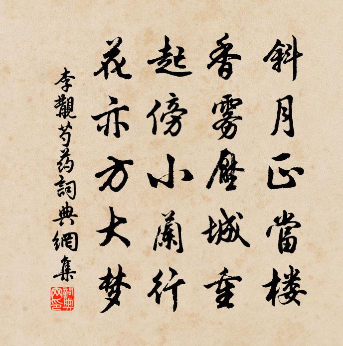 詩詞名句歷史字典書法欣賞書法字典國語詞典說文解字康熙字典古漢語字典標 題 作 者 詩 句 芍藥作者:李覯 朝代:宋代芍藥原文斜月正當樓,香霧壓城重。起傍小蘭行,花亦方大夢。詩詞問答問:芍藥的作者是誰?答:李覯問:芍藥寫於哪個朝代?答:宋代李覯芍藥書法欣賞芍藥書法作品詩詞推薦古意舒岳祥〔宋代〕客從南方來,遺我薰風琴。薰風未易致,且奏易水吟。高浪忽起立,四顧變愁陰。征馬立踟躇,旁人淚沾襟。壯士送人出城同過周少府贈行者張舜民〔宋代〕欲解舟維岸,將行客倚欄。主人夸意厚,親起具盤飧。溪柳低含雨,山桃重怯寒。何時浮小艇,同訪橘洲灘。偈頌二十五釋智遇〔宋代〕流虹七載夤儘是,又向天寧理倩窠。脫得驢胎人馬腹,皮毛輕重不爭多。贈高效士劉克莊〔宋代〕季鹹莫測壺丘子,詹尹安知屈大夫。老子即今無可卜,問君活得幾年無。游蒲澗呈周師蔡漕張舶楊萬里〔宋代〕勝日從公蒲澗游,萬岳聲滿千崖秋。一逕如蛇三百曲,繞盡山腹到山頭。穹岩千仞欹欲裂,仰看飛泉瀉雲窟。鏘成杜沂游武昌,以酴醾花菩薩泉見餉,二首蘇軾〔宋代〕酴醾不爭春,寂寞開最晚。青蛟走玉骨,羽蓋蒙珠幰。不妝艷已絕,無風香自遠。淒涼吳宮闕,紅粉埋故苑。至今再過幾先侄齋中方翥〔宋代〕樹連平野濶,深夜易高風。星月迷濛外,乾坤鼓盪中。山窗寒未白,宿炭曉能紅。袍被論詩句,長長與子同。困坐窮山無以娛日用隨齋問訊韻寄莘夫並呈隨趙蕃〔宋代〕少陵苦憶將廉頗,才似淮陰亦奈何。豈待秋風方憶膾,不堪夏日況揮戈。分當鹿鹿終隨後,言敢譊譊取屢訶。世事鷓鴣天佚名〔宋代〕巧匠園縫異樣花。身輕體健實堪夸。能令公子精神爽,善誘王孫禮義加。宜富貴,逞奢華。一團和氣遍天涯。宋祖聞楊和卿在館中讀易不去手贈以詩家鉉翁〔宋代〕人人讀醫經,知尊黃與岐。楊子讀醫經,乃以羲文周孔而為歸。易中有妙義,醫中之奧與易相表里。六十四卦字字絕句童翰卿〔唐代〕大朴逐物盡,哀我天地功。爭得榮辱心,洒然歸西風。和蔡生胡寅〔宋代〕吾生慚松獨,天賦比樗散。學道才窺藩,聖門未容款。老來憂患集,鵻草經濕嘆。衣帶垂有餘,樗腹無可坦。跫然十五夜雪項安世〔宋代〕幸自封姨不敢嗔,放教月姊伴遊人。不知滕六來奇許,忽與天官競此辰。蓮焰撲殘惟種李,金波卷盡只鋪銀。玉皇勉牛生、夏侯生呂岩〔唐代〕二秀才,二秀才兮非秀才,非秀才兮是仙才。中 * 里親遭遇,仰面觀天笑眼開。鶴形兮龜骨,龍吟兮虎顏。我有喜遷鶯毛文錫〔唐代〕芳春景,曖晴煙,喬木見鶯遷。傳枝偎葉語關關,飛過綺叢間錦翼鮮,金毳軟,百轉千嬌相喚。碧紗窗曉怕聞聲,送石太尉移鎮許昌魏野〔宋代〕厭居棠樹遠京師,新自飛章白玉墀。許郡虎符依口得,涼州龍節逐身移。離聲銀字調家樂,行李金函鎖御詩。想到古意耿湋〔唐代〕雖言千騎上頭居,一世生離恨有餘。葉下綺窗銀燭冷,含啼自草錦中書。題資福院石井潘閬〔宋代〕炎炎畏日樹將焚,卻恨都無一點雲。強跨蹇驢來得到,皆疑渴殺老參軍。題鄭谷江畔桐齋(鄭生好琴,性達,兼寡慾)皎然〔唐代〕客齋開別住,坐占綠江濆。流水非外物,閒雲長屬君。浮榮未可累,曠達若為群。風起高梧下,清弦日日聞。冬日示楊季若梁天機鄭獬〔宋代〕天河忽側飛雹傾,丁丁屋瓦相敲鳴。撲衣寫下白玉粒,腳底踏碎真珠聲。官舍高屋苦濩落,此時不易孤客情。潁侯名句推薦莫辭盞酒十分勸,只恐風花一片飛。程顥《郊行即事》 酌酒會臨泉水,抱琴好倚長松。王維《田園樂七首·其七》 相逢不飲空歸去,洞口桃花也笑人。佚名《增廣賢文·上集》 淺把涓涓酒,深憑送此生。杜甫《水檻遣心二首》 昨日屋頭堪炙手,今朝門外好張羅白居易《放言五首·其四》 若教眼底無離恨,不信人間有白頭。辛棄疾《鷓鴣天·晚日寒鴉一片愁》 無奈朝來寒雨,晚來風。李煜《相見歡·林花謝了春紅》 晝成淒黯,雁飛過、垂楊轉青。吳文英《慶 * ·秋感》 遙想獨游佳味少,無方騅馬但鳴嘶。蘇轍《懷澠池寄子瞻兄》 一番桃李花開盡,惟有青青草色齊。曾鞏《城南·雨過橫塘水滿堤》