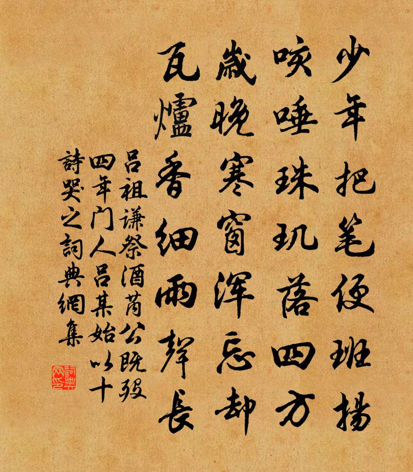 詩詞名句歷史字典書法欣賞書法字典國語詞典說文解字康熙字典古漢語字典標 題 作 者 詩 句 祭酒芮公既歿四年門人呂某始以十詩哭之作者:呂祖謙 朝代:宋代原文少年把筆便班揚,咳唾珠璣落四方。歲晚寒窗渾忘卻,瓦爐香細雨聲長。詩詞問答問:《祭酒芮公既歿四年門人呂某始以十詩哭之》的作者是誰?答:呂祖謙問:該詩寫於哪個朝代?答:宋代書法欣賞祭酒芮公既歿四年門人呂某始以十詩哭之書法作品詩詞推薦送相里燭方乾〔唐代〕相逢未作期,相送定何之。不得長年少,那堪遠別離。泛湖乘月早,踐雪過山遲。永望多時立,翻如在夢思。謝張學士惠靈壽杖許志仁〔宋代〕和疑連綿青未了,郴江擘出蛟龍吼。雷公霹靂搜岩比,化為鬱律黃蛇走。飛電迸火出奇節,黃蛇起立僵如鐵。攜看久無暇近書卷慨然有作陸游〔宋代〕少年喜讀書,事業期不朽,致君頗自許,書卷常在手。白頭乞鍾釜,坐使此心負。朝衙有達午,夕坐或過酉。文符夜直聞御溝聲范祖禹〔宋代〕銀河秋瀉月明中,雲捲風吹下碧空。終夕玉堂魂夢冷,蜀江聲繞水晶宮。送僧潘鹹〔唐代〕闕下僧歸山頂寺,卻看朝日下方明。莫道野人尋不見,半天雲里有鐘聲。青玉案(坐上和趙智夫瑞香)朱敦儒〔宋代〕芝房並蒂空稱瑞。幾曾見、香旎旎。也不論蘭休比蕙。王孫高韻,說得的當,不減唐諸李。今朝影落瓊杯里。共才登般若台趙彥齡〔宋代〕撥置文書強作閒,佩壺聊得共躋攀。歸雲不識遊人意,遮盡江南一帶山。觀獵騎(一作公子行)司空曙〔唐代〕纏臂繡綸巾,貂裘窄稱身。射禽風助箭,走馬雪翻塵。金埒爭開道,香車為駐輪。翩翩不知處,傳是霍家親。偶見(黃州作)杜牧〔唐代〕朔風高緊掠河樓,白鼻騧郎白罽裘。有個當壚明似月,馬鞭斜揖笑回頭。義寧產蓴菜中秋大熟副以六絕送楊伯子曾豐〔宋代〕蟹肥鱸腯未多夸,橘綠橙黃正自嘉。左手把蓴右持酒,何當共醉木犀花。贈鄭國莊穆公主輓歌二首權德輿〔唐代〕追飾崇湯沐,遺芳藹禁闈。秋原森羽衛,夜壑掩容輝。睿藻悲難盡,公宮望不歸。笳簫向煙霧,疑是彩鸞飛。舊館依韻次同年張曙先輩見寄之什杜荀鶴〔唐代〕天上詩名天下傳,引來齊列玉皇前。大仙錄後頭無雪,至藥成來灶絕煙。笑躡紫雲金作闕,夢拋塵世鐵為船。九華梅雨初霽陸游〔宋代〕梅雨忽已過,松風來颯然。吟多錦囊富,影瘦角巾偏。客祝加餐飯,兒憂少睡眠。衰骸累人久,撫事感餘年。再吟三首蘇泂〔宋代〕菱角雞頭薦晚杯,詩成不受片雲催。青裙自約彌明喜,更上西樓看月來。悼楊休甫陳傅良〔宋代〕袖手旁觀一世余,元非親物亦非疎。酒邊每事如人意,燈下通宵讀我書。學到莊騷才止此,生逢周流定何如。西州和仲巽過古北口楊無敵廟蘇頌〔宋代〕漢家飛將領熊羆,死戰燕山護我師。威信仇方名不滅,至今奚虜奉遺祠。閒出白居易〔唐代〕身外無羈束,心中少是非。被花留便住,逢酒醉方歸。人事行時少,官曹入日稀。春寒游正好,穩馬薄綿衣。冬日過良坑見岡東望滄海隱隱見漁村有感時避舒岳祥〔宋代〕平陸人煙險,漁舟家口肥。青天圍篛笠,白雨澣蓑衣。靜釣鷗分石,寒歸雪滿扉。磻溪有恨事,嚴瀨本忘機。方孚若真□宅堂前池上作淮南小山題詠者甚多戴復古〔宋代〕妙手能移造化功,壺中幻出九華峰。山雖雲小能棲鳳,水不求深貴有龍。事紀淮南千古勝,記成嘉泰八年冬。先生天陰欲雪項安世〔宋代〕仰天再拜乞冬晴,十縣租人要入城。些子中間私意處,此身方在客中行。名句推薦若教眼底無離恨,不信人間有白頭。辛棄疾《鷓鴣天·晚日寒鴉一片愁》 吾以為古之善者則述之,今之善者則作之,欲善之益多也。墨子《墨子·46章 耕柱》 簾外雨潺潺,春意闌珊。李煜《浪淘沙令·簾外雨潺潺》 紫萸一枝傳賜,夢誰到、漢家陵。姚雲文《紫萸香慢·近重陽》 千尺陰崖塵不到,惟有層冰積雪。辛棄疾《賀新郎·用前韻送杜叔高》 東風吹我過湖船。楊柳絲絲拂面。張孝祥《西江月·問訊湖邊春色》 不見南師久,謾說北群空。陳亮《水調歌頭·送章德茂大卿使虜》 吳台直下,緗梅無限,未放野橋香度。吳文英《永遇樂·探梅次時齋韻》 問汝平生功業,黃州惠州儋州。蘇軾《自題金山畫像》 怕歌愁舞懶逢迎。妝晚托春酲。陸游《朝中措·代譚德稱作》