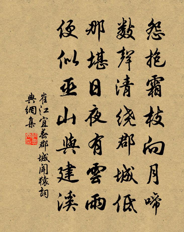 詩詞名句歷史字典書法欣賞書法字典國語詞典說文解字康熙字典古漢語字典標 題 作 者 詩 句 宜春郡城聞猿作者:崔江 朝代:唐代宜春郡城聞猿原文怨抱霜枝向月啼,數聲清繞郡城低。那堪日夜有雲雨,便似巫山與建溪。詩詞問答問:宜春郡城聞猿的作者是誰?答:崔江問:宜春郡城聞猿寫於哪個朝代?答:唐代問:宜春郡城聞猿是什麼體裁?答:七絕崔江宜春郡城聞猿書法欣賞宜春郡城聞猿書法作品注釋全唐詩:卷775-1詩詞推薦寄台教王吉甫陳著〔宋代〕直溪之水清且洌,可以沃我老枯渴。直溪之風空且闊,可以舒我窮鬱結。自聞西來飛霞佩,使我南望片雲隔。苦無送黃叔向歸永嘉王遂〔宋代〕傳聞索米向長安,疏影寒香得細看。檄羽風生常事急,舉頭霜滿致身難。五湖莫辦鴟夷計,四壁誰憐范叔寒。今代雪李洞〔唐代〕迢迢來極塞,連闕謂風吹。禪客呵金錫,征人擘凍旗。細填蟲穴滿,重壓鶴巢欹。有影晴飄野,無聲夜落池。正繁江神子(父生日)曹勛〔宋代〕南豐詩將駐靈江。下明光,惹天香。十雨五風,連歲致豐穰。初夏清和才四日,開壽席、宴華堂。嚴宸已奏二南章鶯武衍〔宋代〕柳外飛來恰弄聲,瞥然流去一梭輕。分明啼斷春愁處,風不驚花午院晴。送游大冶歸建陽王炎〔宋代〕震澤黃柑熟,苕溪紫蟹肥。天寒留客舍,歲晚念親闈。抱負須時用,行藏與志違。臨分話情愫,衰謝亦謀歸。送本如上人歸四明釋尚能〔宋代〕隨緣離舊隱,秋後卻思歸。古寺山光滿,重城海氣圍。道孤愁作客,年長重忘機。此去何人見,雲根掩竹扉。答宇文文學高似孫〔宋代〕無能應欲苦皇皇,詩不驚人筆事荒。天下無山如怕顆,人間有水自滄浪。左杯右蟹一舟足,早韭晚菘三畝強。莫謂滿江紅 次韻壽雪澗兄張伯淳〔元代〕七日新秋,還又記、生申初度。清夢到、小橋流水,翔蓬深處。去歲灤京猶望遠,今年談宴知誰與。想荷翻、翠蓋大江東去·用東坡先生韻趙秉文〔金代〕秋光一片,問蒼蒼桂影,其中何物?一葉扁舟波萬頃,四顧粘天無壁。叩枻長歌,嫦娥欲下,萬里揮冰雪。京塵千論螻蟈形賈似道〔宋代〕螻蟈之形最難相,牙長腿短頭尖亮。尾豁過肩三二分,正是雌頭拖肚樣。梁雅樂歌 獻雅沈約〔南北朝〕神宮肅肅。天儀穆穆。禮獻既同。膺茲厘福。我有馨明。無愧史祝。江館王建〔唐代〕水面細風生,菱歌慢慢聲。客亭臨小市,燈火夜妝明。游城南十六首風折花枝韓愈〔唐代〕浮艷侵天難就看,清香撲地只遙聞。春風也是多情思,故揀繁枝折贈君。偶題蔡沈〔宋代〕作書與蜀客,止為求知音。不料緣素絲,卻與多黃金。今情既已異,古意何由尋。一笑陶靖節,雅趣無弦琴。惜舟劉克莊〔宋代〕生世誰令抱百憂,點黃不肯上眉頭。江邊風雨飄蓬箬,愛惜扁舟一夜愁。題畢直合翻經圖三首陳造〔宋代〕伯圖無繼昧尊王,獨抱殘經析渺茫。地下威文應吐氣,人間宋李解升堂。送王汝之江西二首趙蕃〔宋代〕君行應到郁孤台,惆悵登臨記昔孩。別酒尚遲三徑菊,歸鞍好待一枝梅。將軍揖客能增價,幕府群賢定挽才。我亦楊柳騷艾性夫〔宋代〕縷縷柔條不奈春,為誰憔悴把眉顰。年來江上多離別,不信垂楊管得人。癸卯元日方岳〔宋代〕遠色蒼茫草際煙,春風也到雪崖邊。不知最後屠蘇酒,增一年歟減一年。名句推薦松葉堪為酒,春來釀幾多。張九齡《答陸澧》 人不閒,勿事攪。人不安,勿話擾。李毓秀《弟子規·泛愛眾》 微風起,清芬醞藉,不減酴醿。李清照《多麗·詠白菊》 見侮而不鬥,辱也!公孫龍《公孫龍子·跡府》 落木蕭蕭,琉璃葉下瓊葩吐。王十朋《點絳唇·素香丁香》 黃雞白酒,君去村社一番秋。辛棄疾《水調歌頭·送楊民瞻》 待把酒送君,恰又清明後。何夢桂《摸魚兒·記年時人人何處》 嘆息老來交舊盡,睡來誰共午甌茶。陸游《幽居初夏》 只言啼鳥堪求侶,無那春風欲送行。高適《夜別韋司士》 翻空白鳥時時見,照水紅蕖細細香。蘇軾《鷓鴣天·林斷山明竹隱牆》