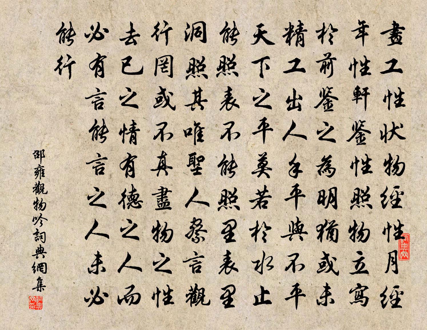 詩詞名句歷史字典書法欣賞書法字典國語詞典說文解字康熙字典古漢語字典標 題 作 者 詩 句 觀物吟作者:邵雍 朝代:宋代觀物吟原文畫工性狀物,經性月經年性。軒鑒性照物,立寫於前。鑒之為明,猶或未精。工出人手,平與不平。天下之平,莫若於水。止能照表,不能照里。表里洞照,其唯聖人。察言觀行,罔或不真。盡物之性,去已之情。有德之人,而必有言。能言之人,未必能行。詩詞問答問:觀物吟的作者是誰?答:邵雍問:觀物吟寫於哪個朝代?答:宋代邵雍觀物吟書法欣賞觀物吟書法作品詩詞推薦雨後舒邦佐〔宋代〕積雨洗殘暑,翛然窗戶涼。蠅蚊不須驅,時至自退藏。琤然一葉下,梧桐隕秋黃。仰視天宇闊,賓鴻初南翔。兒時玉樓春毛滂〔宋代〕泥銀四壁盤蝸篆。明月一庭秋滿院。不知陶菊總開無,但見杜苔新雨遍。去年醉倒云為簟。未盡百壺驚日短。小雲文登蓬萊閣下石壁千丈為海浪所戰時有碎裂淘蘇軾〔宋代〕蓬萊海上峰,玉立色不改。孤根捍滔天,雲骨有破碎。陽侯殺廉角,陰火發光彩。累累彈丸間,瑣細成珠琲。閻浮送道虔上人遊方(一作方乾詩)戴叔倫〔唐代〕律儀通外學,詩思入禪關。煙景隨緣到,風姿與道閒。貫花留靜室,咒水度空山。誰識浮雲意,悠悠天地間。和汪子淵桂花一絕杜范〔宋代〕姮娥剪彩壓群芳,一夜秋風入酒囊。薰徹醉魂清入骨,敢言天下更無香。歲晚有感張耒〔宋代〕疏梅點點柳毿毿,殘臘新春氣候參。天靜秋鴻來塞北,雲收片月出江南。青霄雨露將回律,白首江湖尚避讒。未信和江西王倉中秋賞月韻黃榦〔宋代〕明晦從渠造物慳,好天佳月靜時看。一輪天外長明徹。萬象胸中自屈盤。星逐使來隨處見,霜巡台迥逼人寒。休觀錦瑟清商引汪元量〔宋代〕玉窗夜靜月流光。拂鴛弦、先奏清商。天外塞鴻飛呼,群夜渡瀟湘。風回處,戛玉鏗金,翩翩作新勢,聲聲字字,人間任希夷〔宋代〕人間無處著東風,萬紫千紅掃地空。寂寞園林晴日永,柳花零落綠蔭中。暑布送王廷舉用蕭敬夫韻文天祥〔宋代〕平生涼薄資,埏陶誤大窰。誰知此石怪,愈沃乃愈焦。崑崙織火鼠,頓易鶉衣飄。榮我絲蘇附,免此蒲柳凋。服之淳熙七年春帖子壽聖齊明廣慈太上皇后合六崔敦詩〔宋代〕花邊破日紅千疊,柳際勻煙翠一層。閱盡風光長不老,綠車當見從雲仍。浪淘沙劉禹錫〔唐代〕八月濤聲吼地來,頭高數丈觸山回。須臾卻入海門去,捲起沙堆似雪堆。偈頌二百零五首釋正覺〔宋代〕靜沉沉,明蕩蕩,雪滿十方,雲迷四向。一色影里是誰坐著功勳,百尺竿頭阿你變通伎倆。恁麽時須辨幾微,恁麽思歸顧況〔唐代〕不能經綸大經,甘作草莽閒臣。青瑣應須長別,白雲漫與相親。閒題家池寄王屋張道士白居易〔唐代〕有石白磷磷,有水清潺潺。有叟頭似雪,婆娑乎其間。進不趨要路,退不入深山。深山太獲落,要路多險艱。不如端午日楓亭道中陳宓〔宋代〕百里青松五月涼,千年忠惠有餘芳。後人繼此非難事,不為公家慮久長。八陣磧孫應時〔宋代〕江近瞿唐急,沙從魚腹磺。千秋應有恨,八陳竟難平。望斷青煙晚,愁邊白鳥明。身微定何補,且復老躬耕。喜雪二首舒邦佐〔宋代〕光入疏欞曉色添,開門猶認蝶飛簾。千山陡失青絲障,萬戶橫拖白玉檐。壓竹重時疑綠折,著花輕處露紅尖。自慚和詹守二首吳芾〔宋代〕一日相逢喜有餘,對談勝讀十年書。歡聲已溢枌榆社,和氣還蒸蓬蓽居。敢道主標攀靖節,或疑勝致到華胥。願言秋日感事吳融〔唐代〕一葉飄然夕照沈,世間何事不經心?幾人慾話雲台峻,獨我方探禹穴深。雞檄固應無下策,鶴書還要問中林。自憐名句推薦日暮漢宮傳蠟燭,輕煙散入五侯家。韓翃《寒食》 浮生只合尊前老。雪滿長安道。舒亶《虞美人·寄公度》 明妃一朝西入胡,胡中美女多羞死。李白《于闐採花》 菀菀黃柳絲,濛濛雜花垂。常建《春詞二首》 亦知合被才名折,二十三年折太多。白居易《醉贈劉二十八使君》 安得千尋橫鐵鎖,截斷煙津。陸游《浪淘沙·丹陽浮玉亭席上作》 子規啼徹四更時,起視蠶稠怕葉稀。謝枋得《蠶婦吟》 壯年何事憔悴,華發改朱顏。蘇舜欽《水調歌頭·滄浪亭》 青山綠水,白草紅葉黃花。白樸《天淨沙·秋》 拆桐花爛漫,乍疏雨、洗清明。柳永《木蘭花慢·拆桐花爛漫》