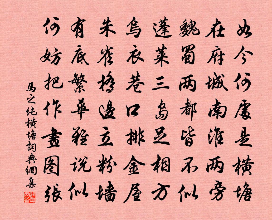 詩詞名句歷史字典書法欣賞書法字典國語詞典說文解字康熙字典古漢語字典標 題 作 者 詩 句 橫塘作者:馬之純 朝代:宋代橫塘原文如今何處是橫塘,在府城南淮兩旁。魏蜀兩都皆不似,蓬萊三島足相方。烏衣巷口排金屋,朱雀橋邊立粉牆。有底繁華難說似,何妨把作畫圖張。詩詞問答問:橫塘的作者是誰?答:馬之純問:橫塘寫於哪個朝代?答:宋代馬之純橫塘書法欣賞橫塘書法作品詩詞推薦游西湖釋紹嵩〔宋代〕西湖招提三百六,佳處如春有眉目。一番雨過吞青空,萬頃無波鴨頭綠。望湖樓閣獨自登,煙霏向背攢寒玉。想見罷武功縣將入城姚合〔唐代〕乍拋衫笏覺身輕,依舊還稱學道名。欲泥山僧分屋住,羞從野老借牛耕。妻兒盡怕為逋客,親故相邀遣到城。無奈雜興四首蘇泂〔宋代〕滿地秋聲鼓吹同,草根無賴更寒蛩。情知萬事終搖落,忍見霖林一葉紅。日高臥白居易〔唐代〕怕寒放懶日高臥,臨老誰言牽率身。夾幕繞房深似洞,重裀襯枕暖於春,小青衣動桃根起,嫩綠醅浮竹葉新。未裹丙午寒食題淨土寺一首王阮〔宋代〕方見繁紅繡小園,已隨流水泛前村。人於醽醁真無分,雨共鞦韆似有冤。投老故應諸事懶,問春能得幾分存。不須送友人之永嘉項斯〔唐代〕長貧知不易,去計擬何逃。相對人愁別,經過幾處勞。城連沙岫遠,山斷夏雲高。猶想成詩處,秋燈半照濤。寄滑州李副使員外皮日休〔唐代〕兵繞臨淮數十重,鐵衣才子正從公。軍前草奏旄頭下,城上封書箭簳中。圍合只應聞曉雁,血腥何處避春風。故人送李致遠安遠簿二首洪咨夔〔宋代〕與我迭知已,喜君初得官。時來寧論晚,身健莫辭難。訪雪牽魂夢,停雲寄肺肝。斯文元氣在,努力好加餐。綠珠劉克莊〔宋代〕畏死仕新室,輕生謝季倫。細評投閣者,大愧墜樓人。題延慶院章得象〔宋代〕碧澗連龍穴,層巒倚括蒼。無時似風雨,繞院盡松篁。路僻人難到,僧間日自長。勝游應不負,三度屆雲房。游普向十首陳造〔宋代〕虀鹽未必劣僧蔬,塵里光陰易破除。他日摩肩霄漢上,卻須此室與藏書。洞仙歌(次韻斯遠所賦清溪一曲)韓淲〔宋代〕溪山好處,贏得題新曲。待足人生甚時足。問臨流情味,倚遍斜暉,應似畫、小景生綃一幅。漁舟聲欸乃,岩上雲絕句六十四首張伯端〔宋代〕禍福由來互倚伏,還如影響相隨逐。若能轉此生殺機,返掌之間災變福。奉使契丹二十八首其二十二學士院端午帖子二蘇轍〔宋代〕決獄初迎雨,開倉旋取陳。青黃今接夏,飢疫免憂春。和楊子聰會薰尉家梅堯臣〔宋代〕薰生方好雅,茲日為掃扉。森爾延嘉賓,歡然去塵機。有客振雙袂,敢言陽春暉。聊停玉麈尾,為歌金縷衣。古辭送新酒糟蟹與賈之奇五首曹勛〔宋代〕企詠公才綠漲醅,我方破器不成罍。詞源端並流三峽,薪火何能救一杯。偈頌九十三首釋梵琮〔宋代〕一切即一,一即一切。者也之乎,雞豚狗彘。驀忽擘破麵皮,喝退德山臨濟。黃檗施財,甘贄密契。財法二施,等九日登玉山錢起〔唐代〕霞景青山上,誰知此勝游。龍沙傳往事,菊酒對今秋。步石隨雲起,題詩向水流。忘歸更有處,松下片雲幽。送閻中孚郎中知磁州梅堯臣〔宋代〕簫管梁王台,風雪邯鄲道。君行守趙城,我向夷門老。持麾邦寄重,歌褲民欣早。重岡古獵場,驚兔離衰草。贈沈沅陵趙蕃〔宋代〕紹聖同年今幾家,泛然遊宦偶天涯。先因避賊來江左,身欠看山到永嘉。世祿相期會騰踏,束書寧復漫咨嗟。我今名句推薦寒波淡淡起,白鳥悠悠下。元好問《潁亭留別》 只恐夜深花睡去,故燒高燭照紅妝。蘇軾《海棠》 春城無處不飛花,寒食東風御柳斜。韓翃《寒食 / 寒食日即事》 泥落畫梁空,夢想青春語。吳文英《生查子·秋社》 洞房昨夜停紅燭,待曉堂前拜舅姑。朱慶餘《近試上張籍水部 / 近試上張水部 / 閨意獻張水部》 少室眾峰幾峰別,一峰晴見一峰雪。李頎《少室雪晴送王寧》 善為吏者樹德,不善為吏者樹怨。韓非及後人《韓非子·外儲說左下》 惟德動天,無遠弗屆。佚名《尚書·虞書·大禹謨》 滿目飛花萬點,回首故人千里,把酒沃愁腸。葛長庚《水調歌頭·江上春山遠》 忍淚佯低面,含羞半斂眉。韋莊《女冠子·四月十七》