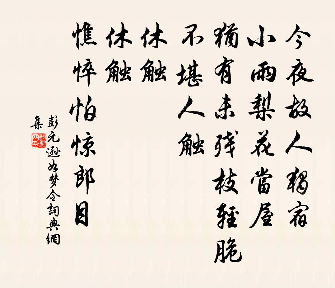 詩詞名句歷史字典書法欣賞書法字典國語詞典說文解字康熙字典古漢語字典標 題 作 者 詩 句 如夢令作者:彭元遜 朝代:宋代如夢令原文今夜故人獨宿。小雨梨花當屋。猶有未殘枝,輕脆不堪人觸。休觸。休觸。憔悴怕驚郎目。詩詞問答問:如夢令的作者是誰?答:彭元遜問:如夢令寫於哪個朝代?答:宋代問:如夢令是什麼體裁?答:詞彭元遜如夢令書法欣賞如夢令書法作品詩詞推薦己酉赴桂過撫州樟原得雨李曾伯〔宋代〕夜來一雨洗驕陽,軋軋籃輿趁曉涼。過眼幾多山應接,轉頭二十里相望。煙橫夾道松交翠,水拍連疇稻半黃。轍跡奉和御製中秋翫月歌寇準〔宋代〕戒井銅龍漏水平,玉輪初滿物華清。光連 * 輝正,影泛中天帝宇明。風來蘋末披輕霧,香濕蘭叢浥零露。絳河淮南遇梵才告上人因悼謝南陽疇昔之游梅堯臣〔宋代〕久已厭宦旅,故茲歸江南。始時遽辭邑,不及事春蠶。殘臘猶在道,險阻固所諳。扁舟次淮海,喜遇釋子談。契闊林子中以詩寄文與可及余與可既歿追和其韻蘇軾〔宋代〕斯人所甚厭,投畀每不受。欲其少須臾,奪去惟恐後。雲誰屍此職,無乃亦假守。賦才有巨細,無異斛與斗。胡不次韻楊宰汲泉浸梔子花陳造〔宋代〕山行不識小人羹,但有清寒餉瓦罌。想見雪膚陪獨夜,世間無比長官清。賀喬丞相厲寺正〔宋代〕孔山民具瞻,位高心愈謙。待人冬日暖,持己曉霜嚴。善類藉培植,賢材無滯淹。更栽椿百本,歲歲綠陰添。三月十四日汝州夢梅堯臣〔宋代〕我歸十九年,飲不負升斗。昨夕夢見之,謂須多置酒。雖慰魂來言,定不復入口。俟當返吾廬,且為貯甖缶。夢寐詠史黨奴張玉孃〔宋代〕江雪寒連酒思豪,歌傅錦帳醉烹羔。爭如取水陶承旨,茗碗清新與味高。送鄧漢卿趙師秀〔宋代〕我亦將歸者,先行極羨君。惟因交已久,頗覺意難分。江滿帆侵樹,山高燒入雲。他年有書札,彼此訪耕耘。古意薛馧〔唐代〕昨夜巫山中,失卻陽台女。朝來香閣里,獨伴楚王語。醉蓬萊趙磻老〔宋代〕記青蛇感異,後日扶顛,太平人瑞。壯歲彈冠,有經邦高志。晚上文墀,載嚴霜簡,便雲龍交際。紫極旋樞,金蟬句蕭曰復〔宋代〕民得食天全命脈,令從心地起根芽。答婦兄林公遇四首劉克莊〔宋代〕自笑如窮鬼,相從不記年。每煩詩餞送,不止辦車船。宛丘二詠蘇轍〔宋代〕旱湖堤上柳空多,倚岸輕舟奈汝何。秋雨連渠添積潤,春風吹凍忽生波。蟲魚便爾來無數,鳧雁猶疑未肯過。持詫游寶應寺游酢〔宋代〕崒嵂三帶帶白灣,誰開蘭若翠微間。竹林雲懶禪心定,草徑苔荒屐齒斑。天入碧嵐成玉宇,鳥飛青嶂出塵寰。此中中旬休日呈岩老鞏豐〔宋代〕近見東郊出土牛,燒燈已過又旬休。酸風鱗面慵開眼,細雨毛空怯上樓。百歲光陰真蟻穴,一年寒燠未鴻溝。偷閒答卜者白居易〔唐代〕病眼昏似夜,衰鬢颯如秋。除卻須衣食,平生百事休。知君善易者,問我決疑不。不卜非他故,人間無所求。用前韻再和霍大夫蘇軾〔宋代〕文字先生飲,(謂劉執中。)江山清獻游。典刑傳父老,樽俎繼風流。度嶺逢梅雨,還家指麥秋。自慚鴻雁侶,爭送殷堯藩侍御赴同州姚合〔唐代〕吟詩擲酒船,仙掌白樓前。從事關中貴,主人天下賢。此生無了日,終歲踏離筵。何計因歸去,深山恣意眠。句馮去非〔宋代〕茶疏緣睡少。名句推薦海內風塵諸弟隔,天涯涕淚一身遙。杜甫《野望》 籬落疏疏一徑深,樹頭花落未成陰。楊萬里《宿新市徐公店》 同聲相應,同氣相求。佚名《易傳·乾文言》 幸非一人,專固害。來俊臣《羅織經·治下卷第三》 村北村南,穀雨才耕遍。秀麥連岡桑葉賤。范成大《蝶戀花·春漲一篙添水面》 大風起兮雲飛揚。威加海內兮歸故鄉。劉邦《大風歌》 長因送人處,憶得別家時張籍《薊北旅思/送遠人》 一枝紅杏出牆頭,牆外行人正獨愁。吳融《途中見杏花》 獨立揚新令,千營共一呼。盧綸《和張僕射塞下曲·其一》 傷高懷遠幾時窮。無物似情濃。張先《一叢花令·傷高懷遠幾時窮》