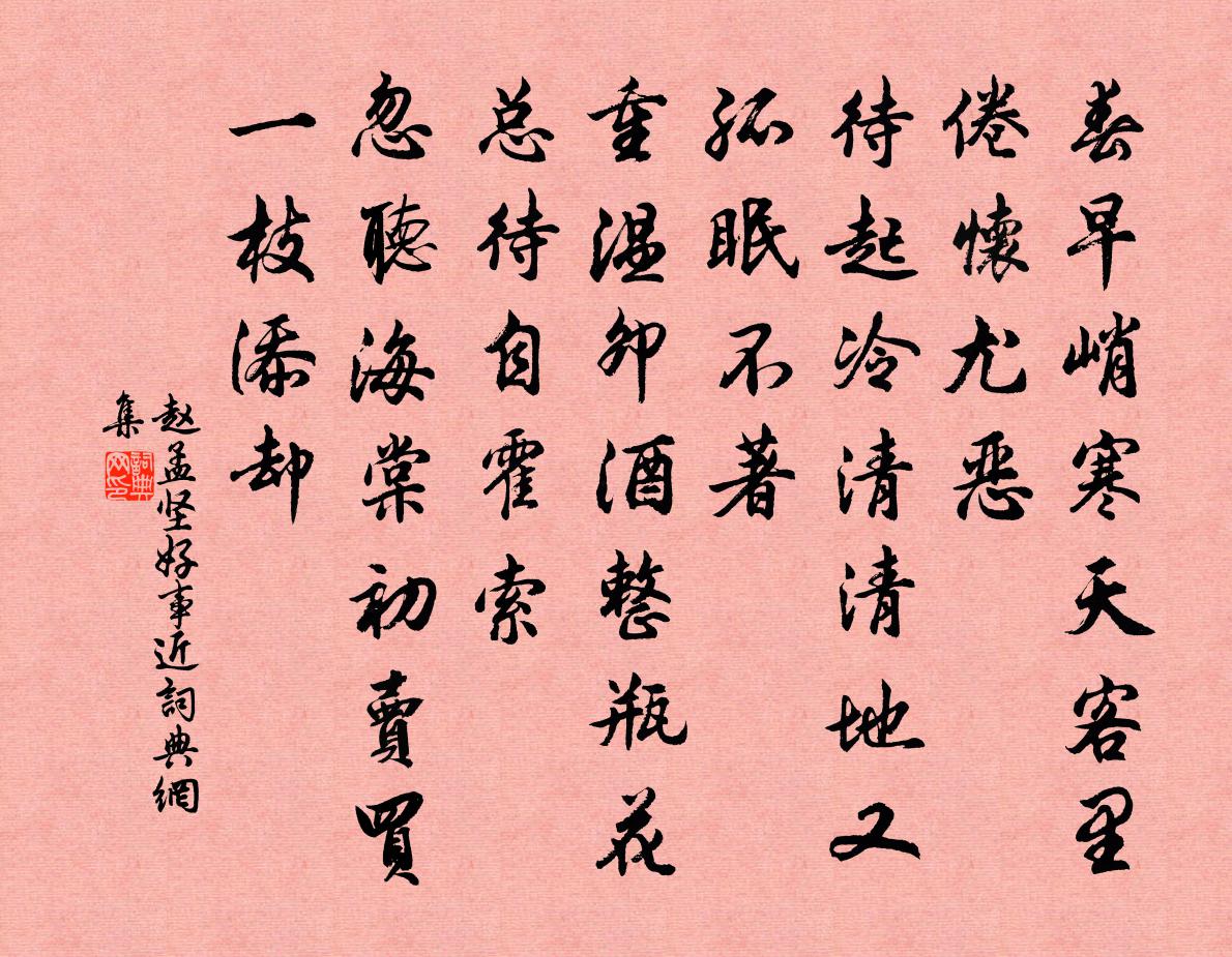 詩詞名句歷史字典書法欣賞書法字典國語詞典說文解字康熙字典古漢語字典標 題 作 者 詩 句 好事近作者:趙孟堅 朝代:宋代好事近原文春早峭寒天,客里倦懷尤惡。待起冷清清地,又孤眠不著。重溫卯酒整瓶花,總待自霍索。忽聽海棠初賣,買一枝添卻。詩詞問答問:好事近的作者是誰?答:趙孟堅問:好事近寫於哪個朝代?答:宋代問:好事近是什麼體裁?答:詞趙孟堅好事近書法欣賞好事近書法作品詩詞推薦擬古意乾隆〔清代〕中庭一樹碧桃花,東西飛落鄰人家。東鄰阿嬌貯金屋,畫眉夫婿金張族。退朝綺宴花拂筵,歡為簪花回曼睩。西鄰再次韻楊宰七首陳造〔宋代〕微吟長嘯強躋攀,愁斛多於庾子山。我亦豐凶關夢寐,秋成訊息待君還。敘倫五言二十首劉克莊〔宋代〕[以上題及詩均殘缺]少全。若論死生無愧怍,幅巾豈不勝貂蟬。讀史六首蘇轍〔宋代〕安石善談笑,揮塵卻苻秦。妄起併吞意,終殘吳越人。贈廨院主僧王洋〔宋代〕平生老信愛顛狂,覺子而今繼道場。坐斷前溪去來路,為誰辛苦為誰忙。賀程帥因任四首且言久缺詩筒之意陳造〔宋代〕先生一筆將詩壇,庋匱珠璣底坐慳。平日鷗盟當未憖,於今雁足每空還。傳抄可但聞平水,老瘦從知笑飯山。緩帶禪人並化主寫真求贊釋正覺〔宋代〕說得一尺,行得一尺。身非肉團,心如牆壁。用光眉十方,照世眼雙碧。諸塵三昧兮在我自然,萬像森羅兮與渠平偈六十九首釋道寧〔宋代〕風攬長空,春雲四起。六臂三頭,徒夸唇觜。匝地普天,全非伴侶。等閒拈出與君看,直下分明須薦取。贈許待制歲旦生日梅堯臣〔宋代〕天曆重更端,哲人茲命世。嘗聞月旦評,況是高陽裔。椒花作壽杯,爆火通爐桂。穹龜及蒼鶴,尚以千年系。曰惟寒食日寄諸弟韋應物〔唐代〕禁火曖佳辰,念離獨傷抱。見此野田花,心思杜陵道。聯騎定何時,予今顏已老。禪人並化主寫真求贊釋正覺〔宋代〕情謂之外兮言路那通,形殼之外兮模畫那同。一方明有月,萬簌嘯而風。其應而妙,其用而沖。圖星之拱兮周羅而送僧之江西釋了惠〔宋代〕一粒收成敵萬倉,可憐別甑不炊香。簸箕唇外打{左足右孛}跳,八十四人皆秕糠。端午帖子太上皇后閣周必大〔宋代〕赫奕蕤賓月,宮庭樂事頻。便從端午節,排當過天申。曉晴發蕪湖吳波亭二首楊萬里〔宋代〕八日川塗九雨風,船中出得入泥中。老夫強項誰能那,雨止風休伎自窮。山居二首陳與義〔宋代〕宅圖不必煩丘令,已卜坡東澗水邊。更與我為燒藥灶,只愁君要買山錢。藏春塢詩獻刁十四丈學士王安石〔宋代〕蒜山東渡得林丘,邂逅籃輿亦少留。今日更知萊氏隱,暮年長憶武陵游。欲營垣屋隨穿斸,尚嘆塵沙隔獻酬。遙約戲和淳詩卷樓鑰〔宋代〕山色藍初染,湖光鏡始磨。竹梢輕墜雨,花片亂隨波。麈尾揮東晉,龍舟吊汨羅。莫愁春易老,暢飲一春多。江樓晚眺景物鮮奇吟玩成篇寄水部張員外白居易〔唐代〕澹煙疏雨間斜陽,江色鮮明海氣涼。蜃散雲收破樓閣,虹殘水照斷橋粱。風翻白浪花千片,雁點青天字一行。好著許州送張中丞出臨潁鎮歐陽詹〔唐代〕心誦陰符口不言,風驅千騎出轅門。孫吳去後無長策,誰敵留侯直下孫。題畫帳二首山水皇甫冉〔唐代〕桂水饒楓杉,荊南足煙雨。猶疑黛色中,復是雒陽岨。名句推薦客子光陰詩卷里,杏花訊息雨聲中。陳與義《懷天經智老因訪之》 湖南為客動經春,燕子銜泥兩度新。杜甫《燕子來舟中作》 灞橋楊柳年年恨,鴛浦芙蓉葉葉愁。蘇庠《鷓鴣天·楓落河梁野水秋》 得寵思辱,居安思危。佚名《增廣賢文·上集》 提三尺劍以定四海吳兢《貞觀政要·卷八·論貢賦》 秉忠貞之誠,守退讓之實。陳壽《三國志·魏書·荀彧攸賈詡傳》 菩薩應如是布施。不住於相。鳩摩羅什譯《金剛經·妙行無住》 離多最是,東西流水,終解兩相逢。晏幾道《少年游·離多最是》 若待得君來向此,花前對酒不忍觸。蘇軾《賀新郎·夏景》 無情最是台城柳,依舊煙籠十里堤。韋莊《台城》