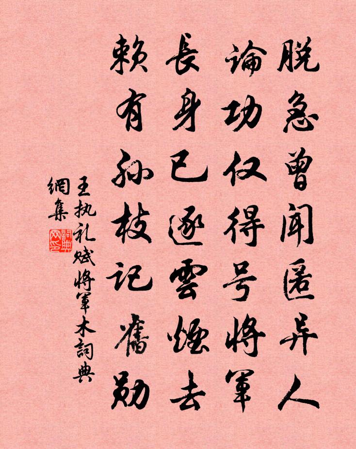 詩詞名句歷史字典書法欣賞書法字典國語詞典說文解字康熙字典古漢語字典標 題 作 者 詩 句 賦將軍木作者:王執禮 朝代:宋代賦將軍木原文脫急曾聞匿異人,論功僅得號將軍。長身已逐雲煙去,賴有孫枝記舊勛。詩詞問答問:賦將軍木的作者是誰?答:王執禮問:賦將軍木寫於哪個朝代?答:宋代王執禮賦將軍木書法欣賞賦將軍木書法作品詩詞推薦再和晁說之〔宋代〕何事謝玄暉,臨巒且悵齊。想非逢錦繡,應只見蒿藜。今日三千牘,昭天十六奎。煌煌鳴佩璐,燦燦動旌霓。服眾清平樂周紫芝〔宋代〕青春欲暮。柳下將飛絮。月到階前梅子樹。啼得杜鵑飛去。人歸不掩朱門。一成過了黃昏。只有瑣窗紅蠟,照人猶喜吉老甥見過張耒〔宋代〕西風吹藜藿,秋色滿環堵。悲蟲語窗月,陰蕊開夕露。門閒賓客少,鳥雀任散聚。楊甥時過我,論詩朝達暮。新茶別岳州項安世〔宋代〕五更鼉鼓忽逢逢,舟子聞晴上北江。推枕一兵辭畫戟,開門三騎到篷窗。鹿鳴厚意陳箱篚,伐木深情綴酒腔。小雅次韻新鄉諸公雪詩二首劉子翬〔宋代〕臘裹天公未得閒,重陰先殿晚來寒。數絲綽約流空際,一陣繽紛糝夜闌。已傍餘光窺蠹簡,更消清液試龍團。杜門春雨徐璣〔宋代〕柳著輕黃欲染衣,汀沙漠漠草菲菲。曉風吹斷寒煙碧,無數鴛鴦溪上飛。三月晦日登豐州故城司馬光〔宋代〕春盡蕪城天一涯,白榆生莢柳生花。滿川戰骨知誰罪,深屬來人戒覆車。述古白玉蟾〔宋代〕帝子珊瑚御飛龍,珊瑚鼎湖叫奚珊瑚為。玉京珊瑚郁崔嵬,銀河汎渺瀰。俯首視紅塵,萬蟻紛何知。乘雲遊八極,秋日詠樓感懷二首強至〔宋代〕搖落秋旻一望長,浮空顥氣白如霜。樓頭待月郡城晚,水底有天江國涼。卻恨人生如寄客,未容年少即衰郎。除非吳郡王冷泉圖贊宋高宗〔宋代〕富貴不驕,戚畹稱賢。掃除膏粱,放曠林泉。滄浪濯足,風度蕭然。國之元舅,人中神仙。野亭晁公溯〔宋代〕興發尋春去,寧知生路賒。檐牙啄清漢,屐齒散平沙。風偃陵陂麥,雲垂問道花。芳菲看即過,留滯改年華。陳先輩故居皮日休〔唐代〕杉桂交陰一里餘,逢人渾似洞天居。千株橘樹唯沽酒,十頃蓮塘不買魚。藜杖閒來侵徑竹,角巾端坐滿樓書。襄陽和文與可洋川園池三十首 荼蘼洞蘇軾〔宋代〕長憶故山寒食夜,野荼蘼發暗香來。分無素手簪羅髻,且折霜蕤浸玉醅。竹軒小睡曾幾〔宋代〕好竹迷時手自栽,一軒寒碧謝塵埃。清風政為我輩設,小睡忽從何許來。已用官茶麾得去,莫因家釀挽令回。呼兒望江南楊 * 〔宋代〕尋勝去,驅馬上南堤。信腳不知人遠近,醉眠猶勸玉東西。歸帽任沖泥。春雨過,農事在瓜蹊。野卉無名隨路滿,宮詞楊皇后〔宋代〕阿姊攜儂近紫薇,蕊官承寵斗芳菲。繡幃獨自裁新錦,怕見花開雙蝶飛。鐵山祠成二首李新〔宋代〕各嶺分崗一嶺西,一峰驤首萬峰低。仰看木杪樓台小,猶聽雲端甲馬嘶。暮角迴風吹落葉,曉暾籠樹轉寒霓。要知夜雨寄寇校書錢起〔唐代〕秋館煙雨合,重城鐘漏深。佳期阻清夜,孤興發離心。燭影出綃幕,蟲聲連素琴。此時蓬閣友,應念昔同衾。於秀才小池方乾〔唐代〕一泓瀲灩復澄明,半日功夫劚小庭。占地未過四五尺,浸天唯入兩三星。鷁舟草際浮霜葉,漁火沙邊駐小螢。才見清平樂令/清平樂吳城小龍〔宋代〕簾捲曲欄獨倚。江展暮天無際。淚眼不曾晴,家在吳頭楚尾。數點雪花亂委。撲漉沙鷗驚起。詩句欲成時,沒入蒼名句推薦江豚吹浪立,沙鳥得魚閒。薛時雨《臨江仙·大風雨過馬當山》 非信無以使民,非民無以守國。司馬光《資治通鑑·周紀·周紀二》 不畏浮雲遮望眼,只緣身在最高層王安石《登飛來峰》 深宮桃李無人問,舊愛玉顏今自恨。元好問《玉樓春·驚沙獵獵風成陣》 秋天一夜靜無雲,斷續鴻聲到曉聞。張仲素《秋閨思二首》 其言必信,其行必果,已諾必誠司馬遷《史記·七十列傳·遊俠列傳》 天下三分明月夜,二分無賴是揚州。徐凝《憶揚州》 雲外好呼南去雁,系書先為報江鄉。齊之鸞《九日登清水營城》 三顧頻煩天下計,兩朝開濟老臣心。杜甫《蜀相》 能令暫開霽,過是吾無求。韓愈《洞庭湖阻風贈張十一署·時自陽山徙掾江陵》