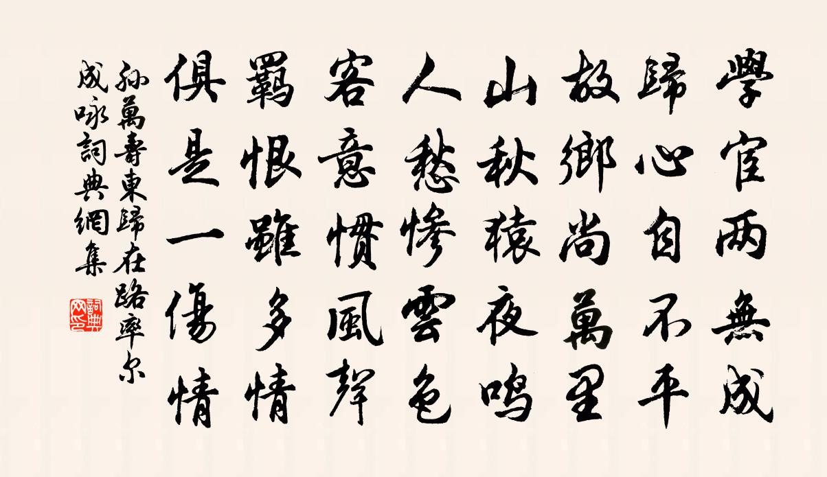 詩詞名句歷史字典書法欣賞書法字典國語詞典說文解字康熙字典古漢語字典標 題 作 者 詩 句 東歸在路率爾成詠作者:孫萬壽 朝代:隋代東歸在路率爾成詠原文學宦兩無成,歸心自不平。故鄉尚萬里,山秋猿夜鳴。人愁慘雲色,客意慣風聲。羈恨雖多情,俱是一傷情。詩詞問答問:東歸在路率爾成詠的作者是誰?答:孫萬壽問:東歸在路率爾成詠寫於哪個朝代?答:隋代孫萬壽東歸在路率爾成詠書法欣賞東歸在路率爾成詠書法作品詩詞推薦再用治橋韻奉送毅夫按部將行晁補之〔宋代〕降羌當有甲齊山,叛虜應無馬量谷。莫憂斗米千錢貴,自可航河一葦足。繡衣不但捕群偷,赦書蠲租亡者復。知君相和歌辭。短歌行聶夷中〔唐代〕八月木蔭薄,十葉三墮枝。人生過五十,亦已同此時。朝出東郭門,嘉樹郁參差。暮出西郭門,原草已離披。南鄰送楊孟容蘇軾〔宋代〕我家峨眉陰,與子同一邦。相望六十里,共飲玻璃江。江山不違人,遍滿千家窗。但苦窗中人,寸心不自降。子歸館中書懷陸游〔宋代〕流落逢明主,恩光集晚途。題名驚手戰,拜閣藉人扶。枉辱三華組,終歸一腐儒。庫書時取讀,猶足補東隅。石洲遇陳季申話舊戴復古〔宋代〕綠樹掛烏帽,清波照白頭。合隨秋燕去,那作賈胡留。紅吐檳榔唾,香薰茉莉球。樽前話疇昔,一笑不能休。釣車陸龜蒙〔唐代〕小輪輕線妙無雙,曾伴幽人酒一缸。洛客見詩如有問,輾煙沖雨過桐江。眠輕戴栩〔宋代〕眠輕夢不定,晨戶入疏風。清坐一遐想,古人皆大空。少言訓俗客,忍事付天公。只了此生足,不嗟吾道窮。二郎神(七夕)張孝祥〔宋代〕坐中客。共千里、瀟湘秋色。漸萬寶西成農事了,稏看、黃雲阡陌。喬□橘洲風浪穩,岳鎮聳、倚天青壁。追前送觀復機宜榮侍南遊二首蘇泂〔宋代〕友誼平生少,心期遠近同。略無時俗氣,信有古人風。幾諫知吾子,忠言在若翁。南州須趣召,先寄狀元紅。祥光寺朱京〔宋代〕山寺藏遺刻,塵埃字半昏。空揮峴首淚,誰起謝公門。白石千年像,蒼頭五世孫。他年想陳跡,卜築向雲根。小閣後薙草岳珂〔宋代〕當暑涼風愜北窗,半庭蒿棘礙支床。無共可繼陳朝曲,有草已成陶徑荒。幸可一縑供廄櫪,便容四坐接杯觴。醉歌鷓鴣天朱敦儒〔宋代〕草草園林作洛川。碧宮紅塔借風煙。雖無金谷花能笑,也有銅駝柳解眠。春似舊,酒依前。何妨倚杖雪垂肩。五陵伯中弟可休堂樓鑰〔宋代〕夫婦老相對,閨門貧甚安。六兒俱力學,一子幸先官。香火祠初奉,勛名鏡屢看。更當聯五桂,納祿尚何難。贈益陽成之主簿黃庭堅〔宋代〕兩祖門中種陰德,名塞四海世有人。諸兒莫斷詩書種,解有無雙聳搢紳。人間卿相何足道,胸次詩書要不忘。男兒夏秋之交小舟早夜往來湖中絕句陸游〔宋代〕河漢橫斜斗柄低,啼鴉掠水未成棲。怪生淒爽侵肌骨,船系秦皇酒瓮西。秦西巴縱麑佚名〔先秦〕孟孫獵而得麑,使秦西巴持歸烹之。麑母隨之而啼,秦西巴弗忍,縱而與之。孟孫歸,求麑安在。秦西巴對曰:“送梁士衡歸餘杭韓元吉〔宋代〕一水分他縣,音書近可傳。飄零俱北客。憔悴各中年。破屋春風裡,扁舟夜雪前。故人逢短簿,為話意茫然。浣溪沙蔡伸〔宋代〕窗外桃花爛熳開。年時曾伴玉人來。一枝斜插鳳皇釵。今日重來人事改,花前無語獨徘徊。淒涼懷抱可憐哉。呈陸嚴州二首趙蕃〔宋代〕一代詩盟孰主張,試探源委見深長。家聲甫里歸嚴瀨,句法茶山出豫章。千里寸心長炯炯,十年兩鬢漫蒼蒼。扁舟送元厚之待制知福州王安石〔宋代〕海隅山谷閒,人物最多處。平旦息相吹,連城黕如霧。閩王舊宮室,丹漆美無度。今為大帥府,千里來赴愬。元侯名句推薦尚想舊情憐婢僕,也曾因夢送錢財。元稹《遣悲懷三首·其二》 夫兵權者,是三軍之司命,主將之威勢。諸葛亮《將苑·卷一·兵權》 萬里辭家事鼓鼙,金陵驛路楚雲西。劉長卿《送李判官之潤州行營》 長風萬里送秋雁,對此可以酣高樓。李白《宣州謝朓樓餞別校書叔雲 / 陪侍御叔華登樓歌》 平沙芳草渡頭村。綠遍去年痕。洪咨夔《眼兒媚·平沙芳草渡頭村》 欲買桂花同載酒,終不似,少年游。劉過《唐多令·蘆葉滿汀洲》 田園寥落干戈後,骨肉流離道路中。白居易《望月有感》 醉里且貪歡笑,要愁那得工夫。辛棄疾《西江月·遣興》 寄言儔侶,莫負廣寒沈醉。文徵明《念奴嬌·中秋對月》 野雲萬里無城郭,雨雪紛紛連大漠。李頎《古從軍行》