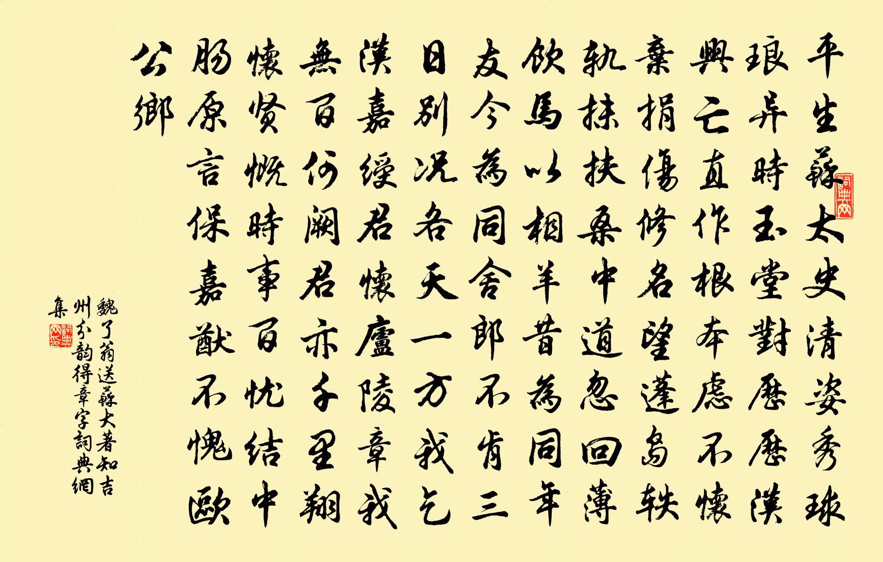 詩詞名句歷史字典書法欣賞書法字典國語詞典說文解字康熙字典古漢語字典標 題 作 者 詩 句 送蘇大著知吉州分韻得章字作者:魏了翁 朝代:宋代送蘇大著知吉州分韻得章字原文平生蘇太史,清姿秀球琅。異時玉堂對,歷歷漢興亡。直作根本慮,不懷棄捐傷。修名望蓬島,軼軌抹扶桑。中道忽回薄,飲馬以相羊。昔為同年友,今為同舍郎。不肯三日別,況各天一方。我乞漢嘉綬,君懷廬陵章。我無百何闕,君亦千里翔。懷賢慨時事,百憂結中腸。原言保嘉猷,不愧歐公鄉。詩詞問答問:送蘇大著知吉州分韻得章字的作者是誰?答:魏了翁問:送蘇大著知吉州分韻得章字寫於哪個朝代?答:宋代魏了翁送蘇大著知吉州分韻得章字書法欣賞送蘇大著知吉州分韻得章字書法作品詩詞推薦皇帝閣端午帖子許應龍〔宋代〕卑服即康功,君王儉德隆。卻頒羅與葛,恩渥被群工。次韻徐審知寄贈古句趙蕃〔宋代〕倦遊歷落三載中,重來觸事多不同。舊交雲散隔山嶽,在者一二莫我從。新知喜獲徐孺子,年少已有諸老風,譬之送杜郎中入茶山修貢楊夔〔唐代〕一道澄瀾徹底清,仙郎輕棹出重城。采蘋虛得當時稱,述職那同此日榮。劍戟步經高障黑,綺羅光動百花明。謝公送廬陵李宰養直之官兼呈劉寺簿四首彭龜年〔宋代〕理財非鑿空,簡訟在謹始。林繁去冗根,卮漏無溢水。此理容可觀,妙處要深體。豈惟宰一邑,天下亦如此。曉出東城陸游〔宋代〕聽徹清笳聽曉鍾,據鞍漏鼓尚冬冬。西樓落月徑三尺,北嶺亂雲生半峰。蒼磴幽尋過古寺,綠疇小駐勞春農。煙村上裴晉公李郢〔唐代〕四朝憂國鬢如絲,龍馬精神海鶴姿。天上玉書傳詔夜,陣前金甲受降時。曾經庾亮三秋月,下盡羊曇兩路棋。惆悵鷓鴣天晏幾道〔宋代〕清潁尊前酒滿衣。十年風月舊相知。憑誰細話當時事,腸斷山長水遠詩。金鳳闕,玉龍墀。看君來換錦袍時。姮娥敷文閣學士李仁甫輓詞十絕周必大〔宋代〕是是非非口即心,掃除人偽只天真。身全五福仍通貴,造物因公勸善人。夏享太廟攝事齋宮聞◇寄原甫歐陽修〔宋代〕四月田家麥穗稠,桑枝生椹鳥啁啾。鳳城綠樹知多少,何處飛來黃栗留。湖上方岳〔宋代〕今歲春風特地寒,百花無賴已摧殘。馬塍曉雨如塵細,處處筠籃賣牡丹。偈頌四十一首釋普寧〔宋代〕拆東籬,補西壁。從空架空,以楔出楔。佗時聳壑昂霄,須信不勞餘力。宮池產瑞蓮帖經日試王貞白〔唐代〕雨露及萬物,嘉祥有瑞蓮。香飄雞樹近,榮占鳳池先。驛日臨雙麗,恩波照並妍。願同指佞草,生向帝堯前。靜香軒釋慧空〔宋代〕種竹竹既立,藝蘭蘭亦芳。爐熏安用許,靜極自生香。十客九常在,古人今不忘。如何杜陵老,獨喜贊公房。恭和聞喜宴賜毛自知以下御製魏了翁〔宋代〕雲漢萬章新寵渥,鈞天張樂播和平。微臣置饋申規戒,賢綱雖恢用欲精。用簡齋建除體韻方岳〔宋代〕建旗凜大將,負弩紛前驅。除此兩不能,鋤荷則有餘。滿畦老菘韭,貧猶未飢虛。平生錯料事,不到齊王竽。定無親耕籍田七首佚名〔宋代〕方壇屹立,陛級而登。玉色下照,臨觀耦耕。萬目鹹睹,如日之升。成規成矩,百祿是膺。戊午元日二首劉克莊〔宋代〕過去光陰箭離弦,河清易俟鬢難玄。再加孔子從心歲,三倍周郎破賊年。耄齒阻陪鳩杖列,瞽言曾獻獸樽前。磻溪元真殿燒香觀太宗真宗御書仁宗飛白書並瑞穀夏竦〔宋代〕蘭炷薰琳殿,雪旄映綠莎。九青真蔭遠,三母睿慈多。閣道陪鑾往,唐中奉詔過。熙陵遺札啟,禰廟實文羅。繼志龍吟曲(陪節慾行留別社友)史達祖〔宋代〕道人越布單衣,興高愛學蘇門嘯。有時也伴,四佳公子,五陵年少。歌里眠香,酒酣喝月,壯懷無撓。楚江南,每次韻許大初見贈二首方回〔宋代〕相逢未覺道途難,把酒論詩數夕間。磊落胸襟開古誼,從容色笑借和顏。長年役役魚千里,末俗悠悠虎九關。賴是名句推薦漠漠水田飛白鷺,陰陰夏木囀黃鸝。王維《積雨輞川莊作 / 秋歸輞川莊作》 不知細葉誰裁出,二月春風似剪刀。賀知章《詠柳 / 柳枝詞》 桃花嫣然出籬笑,似開未開最有情。汪藻《春日·一春略無十日晴》 自伐者無功;自矜者不長。老子《老子·道經·第二十四章》 一曲危弦斷客腸。津橋捩柂轉牙檣。嚴仁《鷓鴣天·惜別》 此身合是詩人未?細雨騎驢入劍門。陸游《劍門道中遇微雨》 思悠悠,恨悠悠,恨到歸時方始休。白居易《長相思·汴水流》 帝王之道,以寬仁為大。令狐德棻《周書·本紀·卷四》 同來何事不同歸。賀鑄《半死桐·重過閶門萬事非》 透內閣香風陣陣,掩重門暮雨紛紛。王實甫《十二月過堯民歌·別情》