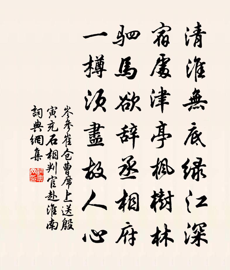 清淮無底綠江深,宿處津亭楓樹林。駟馬欲辭丞相府,一樽須盡故人心。