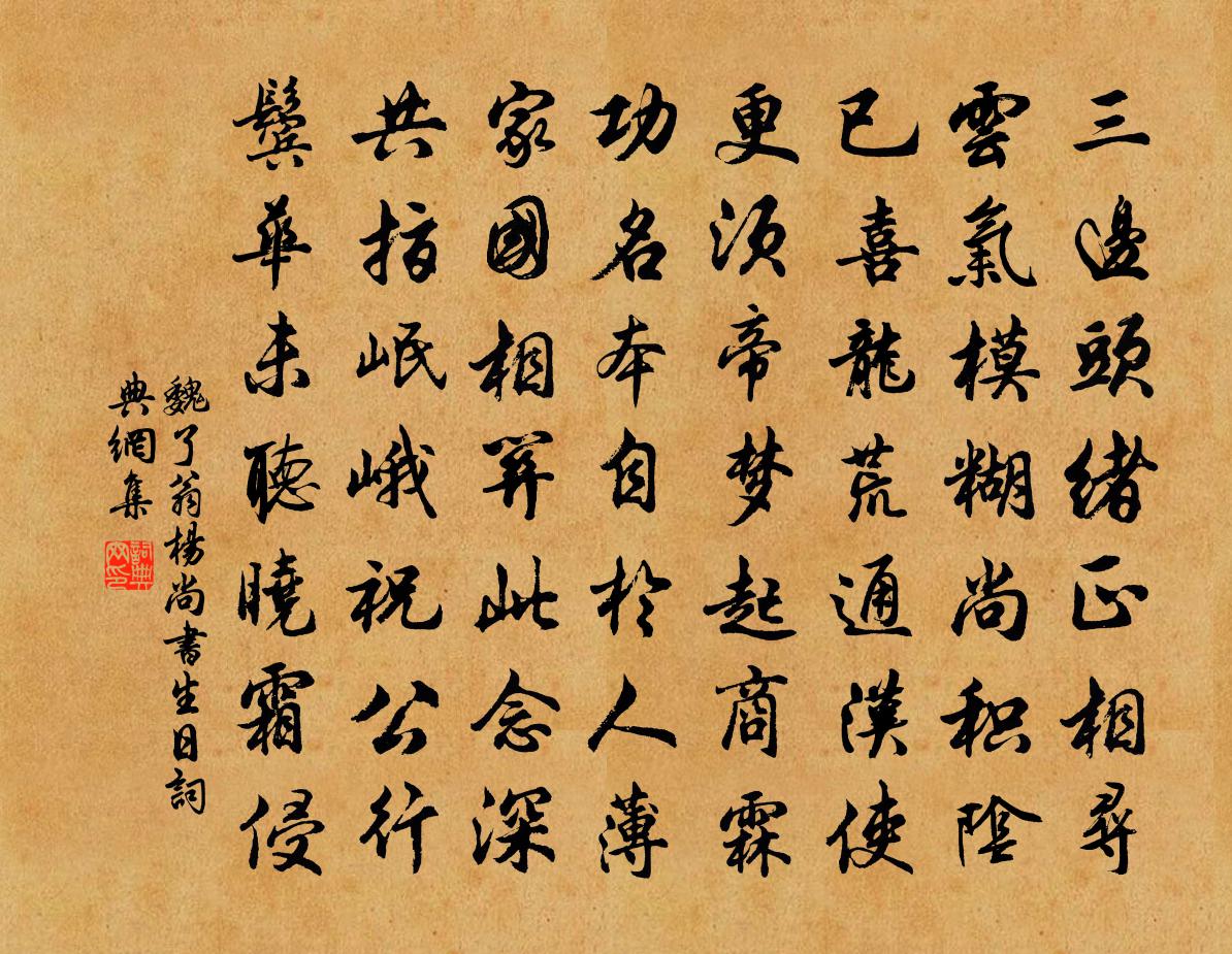 詩詞名句歷史字典書法欣賞書法字典國語詞典說文解字康熙字典古漢語字典標 題 作 者 詩 句 楊尚書生日作者:魏了翁 朝代:宋代楊尚書生日原文三邊頭緒正相尋,雲氣模糊尚積陰。已喜龍荒通漢使,更須帝夢起商霖。功名本自於人薄,家國相關此念深。共指岷峨祝公行,鬢華未聽曉霜侵。詩詞問答問:楊尚書生日的作者是誰?答:魏了翁問:楊尚書生日寫於哪個朝代?答:宋代魏了翁楊尚書生日書法欣賞楊尚書生日書法作品詩詞推薦水調歌頭程節齋〔宋代〕秋色正瀟灑,佳氣夜充閭。人傳好語,君家門左正垂弧。畢萬從來有後,釋氏果然抱送,丹穴鳳生雛。未作湯餅客頌古二十四首釋宗演〔宋代〕今朝十月十五,有誤諸人來此。山僧口似匾擔,說禪煩拄杖子。一擊忘所知,更不假修持。黑蛇當大路,獅子逞全送張少府錢起〔唐代〕愁雲破斜照,別酌勸行子。蓬驚馬首風,雁拂天邊水。寸晷如三歲,離心在萬里。南家桃元稹〔唐代〕南家桃樹深紅色,日照露光看不得。樹小花狂風易吹,一夜風吹滿牆北。離人自有經時別,眼前落花心嘆息。更待次韻遣懷洪咨夔〔宋代〕不用憂春雨,時來百草芳。貓頭肥可臿,雀舌嫩堪囊。舊酒聞香烈,新詩索味長。櫻桃空落去,吾老白雲鄉。讀道藏蘇軾〔宋代〕嗟予亦何幸,偶此琳宮居。宮中復何有,戢戢千函書。盛以丹錦囊,冒以青霞裾。王喬掌關鑰,蚩尤守其廬。乘閒冬曉呈鄰里盧綸〔唐代〕終夜寢衣冷,開門思曙光。空階一叢葉,華室四鄰霜。望闕覺天迥,憶山愁路荒。途中一留滯,雙鬢颯然蒼。謝儀真諸公陳造〔宋代〕十幅擬掛東風蒲,眾賢好事爭挽裾。盍不一笑留斯須,咄嗟而具成燕胥。仙醴湛湛白玉壺,篆煙褭褭黃金爐。駢集暉仲惠梅花數枝韓元吉〔宋代〕賸買青春不費錢,眼明江靜月爭妍。詩人每負梅花債,屈指今年第一篇。憶故園李新〔宋代〕杖藜出北郭,山阿延餘暉。屏營立高原,霜飈吹我衣。牛羊稍絕跡,聚落燈火稀。顧我豈無家,廢置不得歸。大田烏夜啼·石榴劉鉉〔宋代〕垂楊影里殘紅。甚匆匆。只有榴花、全不怨東風。暮雨急。曉鴉濕。綠玲瓏。比似茜裙初染、一般同。絕句楊簡〔宋代〕淨幾橫琴曉寒,梅花落在弦間。我欲清吟地句,轉煩門外青山。兔梅堯臣〔宋代〕迷蹤在塵土,衣褐戀蓬蒿。有狡誰窮穴,中書惜拔毫。獵從原上脫,靈向月邊逃。死作功勳戒,良弓合自弢。阮郎歸徐照〔宋代〕綠楊庭戶靜沈沈。楊花吹滿襟。晚來閒向水邊尋。驚飛雙浴禽。分別後,忍登臨。暮寒天氣陰。妾心移得在君心。題李上謨壁李商隱〔唐代〕舊著思玄賦,新編雜擬詩。江庭猶近別,山捨得幽期。嫩割周顒韭,肥烹鮑照葵。飽聞南燭酒,仍及撥醅時。嘉禾沈園吳龍翰〔宋代〕景物何其異,虛岩人力成。清池沈鳥影,高樹落蟬聲。花日樓台麗,香風簾幕輕。我來一吟賞,不惜買杯傾。獨立陸游〔宋代〕白髯蕭颯一愚公,獨立濛濛細雨中。羊踏寒蔬新少夢,魚生空釜久諳窮。殘編幸有聖賢對,閒話豈無鄰曲同?衒鬻村舍小酌陸游〔宋代〕野性安衡茅,傑屋愁耽耽。上不補縣官,下有肉食慚。雖非策雲驥,實鄙作繭蠶。失計不容悔,漁蓑換朱藍。少壯賜緋魚梅堯臣〔宋代〕蹉跎四十七,腰間始懸魚。茜袍雖可貴,發短齒已疏。兒女眼未識,競來牽人裾。不知外朝眾,君恩慚有餘。南真觀謝諤〔宋代〕人煙一簇古溪頭,竹樹低昂映碧流。曳杖不知山路檢,南真觀里謁浮丘。名句推薦三杯吐然諾,五嶽倒為輕。李白《俠客行》 今夜送歸燈火冷,河塘,墮淚羊公卻姓楊。蘇軾《南鄉子·和楊元素時移守密州》 紅葉滿寒溪,一路空山萬木齊。納蘭性德《南鄉子·秋暮村居》 柳庭風靜人眠晝,晝眠人靜風庭柳。蘇軾《菩薩蠻·回文夏閨怨》 東風隨春歸,發我枝上花。李白《落日憶山中》 輔弼之臣瓦解,而邪諂之人並進班固《漢書·傳·東方朔傳》 舌為利害本,口是禍福門。馮夢龍《醒世恆言·卷二十九》 山高月小,水落石出。蘇軾《後赤壁賦》 謝公最小偏憐女,自嫁黔婁百事乖。元稹《遣悲懷三首·其一》 接漢疑星落,依樓似月懸。盧照鄰《十五夜觀燈》