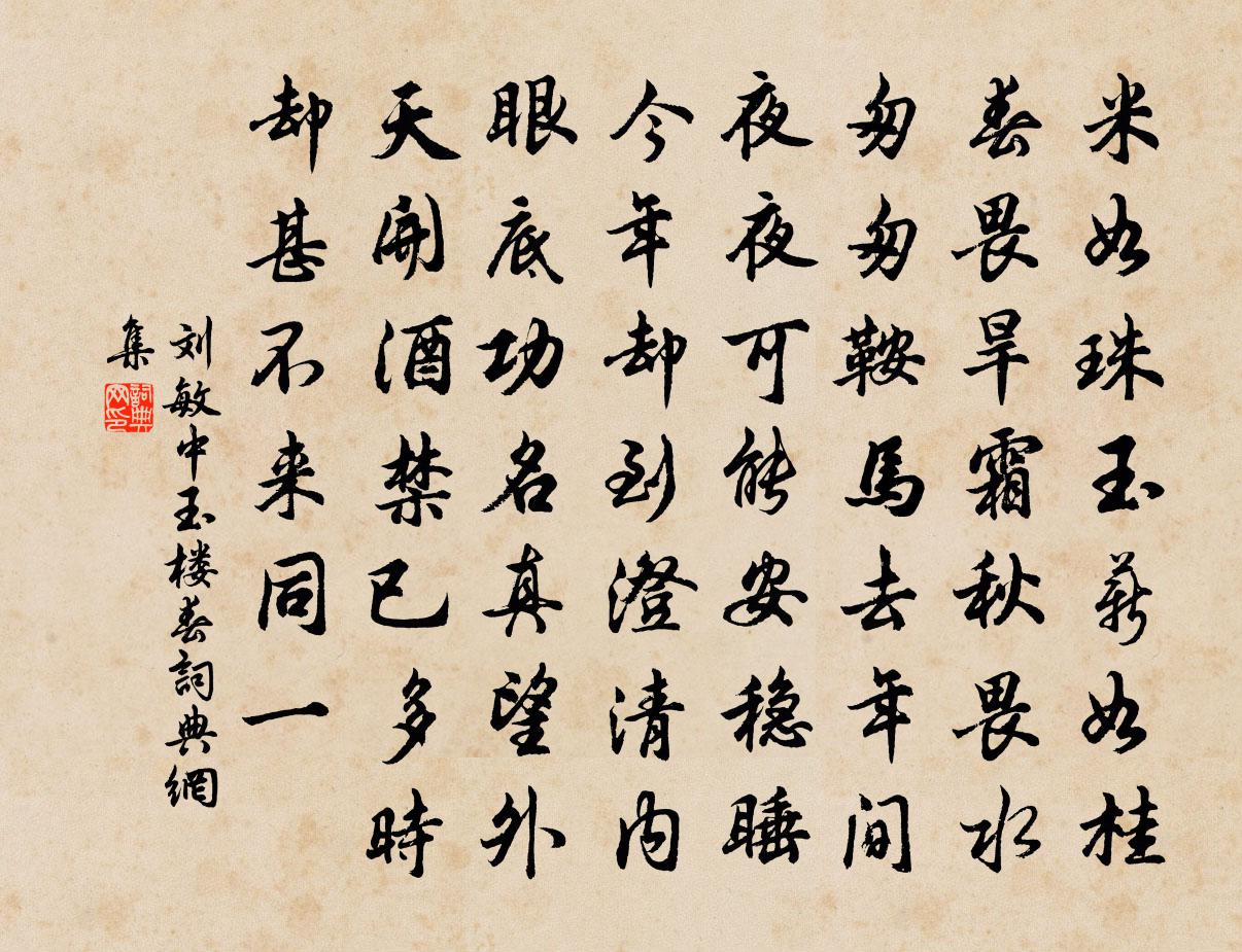 詩詞名句歷史字典書法欣賞書法字典國語詞典說文解字康熙字典古漢語字典標 題 作 者 詩 句 玉樓春作者:劉敏中 朝代:元代玉樓春原文米如珠玉薪如桂。春畏旱霜秋畏水。匆匆鞍馬去年間,夜夜可能安穩睡。今年卻到澄清內。眼底功名真望外。天開酒禁已多時,卻甚不來同一詩詞問答問:玉樓春的作者是誰?答:劉敏中問:玉樓春寫於哪個朝代?答:元代問:玉樓春是什麼體裁?答:詞劉敏中玉樓春書法欣賞玉樓春書法作品詩詞推薦陪侍知府待制丈巾山高設竊聞是日賡和去春林蘇籀〔宋代〕磴蘚梯飈最上頭,挈排犧象主觥籌。從容北海能延客,酣適東風詠倚樓。獻歲順成當大有,名儒過計與私憂。仰看風流子(行樂)謝懋〔宋代〕少年多行樂,方豪健、何處不嬉遊。記情逐艷波,暖香斜徑,醉搖鞭影,撲絮青樓。難忘是,笑歌偏婉娩,鄉號得佛日山榮長老方丈五絕蘇軾〔宋代〕日射迴廊午枕明,水沉銷盡碧煙橫。山人睡覺無人見,只有飛蚊繞鬢鳴。酬次道板橋晚望見寄司馬光〔宋代〕春來曾約醉河橋,深負垂楊千萬條。今日都門相望處,西風亂葉正蕭蕭。送淮陰孫令之官溫庭筠〔唐代〕隋堤楊柳煙,孤棹正悠然。蕭寺通淮戍,蕪城枕楚壖。魚鹽橋上市,燈火雨中船。故老青葭岸,先知儒子賢。贈風鑒曹老眼方逢辰〔宋代〕九重拊髀嘆才難,幣聘皇皇難未戡。老眼試尋天下看,豈無頗牧在東南。馬上見賣白蓮者三首陳造〔宋代〕東盪花百頃寬,花滿盪蓮結花。孤村蓮盪西,茅茨吾所家。年年紅紫盡,為春留芳華。酒船墮雲錦,歌棹凌瑞霞。頌一百則釋重顯〔宋代〕此錯彼錯,切忌拈卻。四海浪平,百川潮落。古策風高十二門,門門有路空蕭索。非蕭索,作者好求無病藥。蝶戀花(次韻張千里駒照花)葛勝仲〔宋代〕二月春遊須爛漫。秉燭看花,只為晨曦短。高舉蠟薪通夕看。紅光萬丈騰天半。寄語平時遊冶伴。不負分陰,勝事和六十叔二絕杜范〔宋代〕夕陽有意為人留,斜映寒江著小舟。遠目遙岑無限意,不須蕭瑟賦悲秋。送伊闕鄭著作宋祁〔宋代〕君年已艾服,沿牒困風塵。硎新始發刃,鳴晚逾驚人。毋辭滯下邑,姑欲慰斯民。此路塵車往,明年郊雉馴。恨乏郊行蔡士裕〔宋代〕無計遠塵囂,尋幽過野橋。風刀削林沙,雲帶束山腰。水抱孤村過,舟回斷岸遙。幾時忘俗虜,來此伴漁樵。北齋書志示兒輩陸游〔宋代〕初夏佳風日,頹然坐北齋。百年從落魄,萬事忌安排。鄉俗能尊老,君恩許賜骸。饑寒雖未免,何足系吾懷!送歸使絕句七首羅公升〔宋代〕目斷歸帆急,無身可得追。親庭如有問,依說鬢成絲。晚晴曹彥約〔宋代〕賸水浸秋碧,餘霞占晚紅。浩歌鳴鶴後,柔櫓泛鷗中。酒戒情難遣,詩吟老未工。懷哉真面目,助順企清風。理宗度宗第二文天祥〔宋代〕先帝弓劍遠,永懷侍芳茵。今朝漢社稷,為話涕沾巾。送臘梅與曾谹父曹勛〔宋代〕紫煙破萼綴蜂房,薇露濃薰冉冉香。寄與赤城賢太守,要知和氣入風光。有懷廣文俞同年虞儔〔宋代〕宦遊霜宿與風餐,環郭青山豈日盤。餘暇每思親丈席,新涼政喜入中單。交情老去才方見,世事年來亦飽看。顏色皇后廟十五首真宗〔宋代〕服章觀象,山龍是則。容止蹌蹌,威備翼翼。舊懸道中二首趙蕃〔宋代〕綠樹依平岸,平波映綠蕪。中分雖有路,四極卻成湖。艇子時三兩,漁村定有無。誰其為題作,東野覓詩圖。名句推薦夜闌風靜欲歸時,惟有一江明月碧琉璃。蘇軾《虞美人·有美堂贈述古》 夫因兵死守蓬茅,麻薴衣衫鬢髮焦。杜荀鶴《山中寡婦 / 時世行》 愛之不以道,適所以害之也。司馬光《資治通鑑·晉紀十八》 驛外斷橋邊,寂寞開無主。陸游《卜運算元·詠梅》 願隨孤月影,流照伏波營。沈如筠《閨怨二首·其一》 相識滿天下,知心能幾人?佚名《增廣賢文·上集》 東飛烏鵲西飛燕。盈盈一水經年見。陳師道《菩薩蠻·七夕》 天涯倦客,山中歸路,望斷故園心眼。蘇軾《永遇樂·彭城夜宿燕子樓》 零淚向誰道,雞鳴徒嘆息。沈約《夜夜曲》 風起,雪飛炎海變清涼。蘇軾《定風波·南海歸贈王定國侍人寓娘》