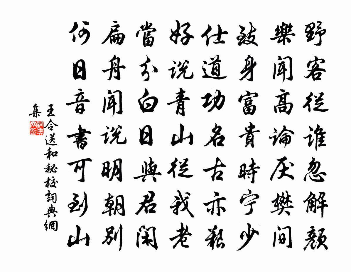 詩詞名句歷史字典書法欣賞書法字典國語詞典說文解字康熙字典古漢語字典標 題 作 者 詩 句 送和秘校作者:王令 朝代:宋代送和秘校原文野客從誰忽解顏,樂聞高論厭樊間。致身富貴時寧少,仕道功名古亦艱。好說青山從我老,當分白日與君閒。扁舟聞說明朝別,何日音書可到山。詩詞問答問:送和秘校的作者是誰?答:王令問:送和秘校寫於哪個朝代?答:宋代王令送和秘校書法欣賞送和秘校書法作品詩詞推薦閒中偶題陸游〔宋代〕久矣雲衢斂羽翰,退飛更覺一枝安。七千里外新閒客,十五年前舊史官。花底清歌春載酒,江邊明月夜投竿。痴頑重陽不見菊二絕范成大〔宋代〕冷蕊蕭疏蝶懶飛,商量何日是花時。重陽過後開無害,只恐先生不賦詩。留題天樂寓張氏湖亭陳起〔宋代〕沉水香銷一局棋,客來淺酌旋分題。畫欄占得春多少,簾卷東風日未西。寄王荊公憶江陰朱明之〔宋代〕城上城隍古鏡中,城邊山色翠屏風。魚是接海隨時足,稻米連湖逐歲豐。太伯人民堪教育,春申溝港可疏通。朱輪九月十六日夜夢駐軍河外遣使招降諸城覺而有陸游〔宋代〕殺氣昏昏橫塞上,東並黃河開玉帳。晝飛羽檄下列城,夜脫貂裘撫降將。將軍櫪上汗血馬,猛士腰間虎文韔。階前宮詞楊皇后〔宋代〕缺月流光入綺疏,金壺傅箭夢回初。秦台彩鳳無訊息,桂影空閒十二除。難老堂吳居厚為祖母作張子昭劉文叔史直翁賦唐仲友〔宋代〕風樹感親壽,忽若冬隕霜。以孫養祖母,惴惴駒隙光。無孫又繼絕,此意誠激昂。吳氏有純孝,業業含飴傍。延年夜讀王承家縣丞詩編樓鑰〔宋代〕向來深夜快揮犀,不聽清談又許時。淨洗昏眸爭呼燭,為君讀盡一編詩。喻子才提舉招昌源觀梅倦不克往蘇仁仲有詩次曾幾〔宋代〕問公何許看花回,賸說郊坰十里梅。樹雜古今他處少,枝分南北一齊開。昌源已辦行廚去,離渚猶須使節來。況復漁父 以上二首見大觀錄卷十七吳瓘〔元代〕野色山光水接天。雲煙縹緲思長川。收此景,老梅仙。萬頃湘江筆底送少微上人還鹿門顧況〔唐代〕少微不向吳中隱,為個生緣在鹿門。行入漢江秋月色,襄陽耆舊幾人存。上平西劉處玄〔元代〕戀恩情,恩生害,死難逃。氣不來、身臥荒郊。改頭換面,輪迴販骨幾千遭。世華非堅如石火,火宅囚牢。任雲水寄曹州李審言龍圖邵雍〔宋代〕向日所云是,如今卻是非。安知今日是,不起後來疑。說謎三絕吳儆〔宋代〕滿身珠翠間花鈿,舞到梁州最可憐。一捻宮腰如束素,清風明月畫堂前。頌古二十四首釋勝〔宋代〕先祖滔滔無固必,後人悱悱有雌雄。巨靈抬手無多子,分破華山千萬重。寄保寧無門講主釋雲岫〔宋代〕錦障桃花春色裹,白衣雪屋月明中。此時此意無人會,海上仙山第一峰。上元日紫極宮門觀州民然燈張樂羊士諤〔唐代〕山郭通衢隘,瑤壇紫府深。燈花助春意,舞綬織歡心。閒似淮陽臥,恭聞樂職吟。唯將聖明化,聊以達飛沉。雙荷葉/憶秦娥蘇軾〔宋代〕雙溪月。清光遍照雙荷葉。雙荷葉。紅心未偶,綠衣偷結。背風迎雨流珠滑。輕舟短棹先秋折。先秋折。煙鬟未上喜雨口號九首呈潘侯劉克莊〔宋代〕憂見鬚眉膳卻葷,分明上帝見忠勤。赤章夜徹通明殿,一縷煙生六合雲。次韻子由送趙幾歸覲錢塘遂赴永嘉蘇軾〔宋代〕歸舟轉河曲,稍見楚山蒼。候吏來迎客,吳音已帶鄉。言從謝康樂,先獻魯靈光。已擊三千里,何須四十強。風流名句推薦傷心重見,依約眉山,黛痕低壓姜夔《慶宮春·雙槳蓴波》 淮水東邊舊時月,夜深還過女牆來。劉禹錫《金陵五題·石頭城》 山中也有千年樹,世上難逢百歲人。佚名《增廣賢文·上集》 為政在人。取人以身。修身以道。修道以仁。子思《中庸·第二十章》 無論作何等人,總不可有勢利氣王永彬《圍爐夜話·第三五則》 拆桐花爛漫,乍疏雨、洗清明。柳永《木蘭花慢·拆桐花爛漫》 得之易,失之易。得之難,失之難。施耐庵《水滸傳·第一百一十六回》 四百年來成一夢,堪愁。王安石《南鄉子·自古帝王州》 菊花何太苦,遭此兩重陽?李白《九月十日即事》 醉後滿身花影、倩人扶。晏幾道《虞美人·疏梅月下歌金縷》