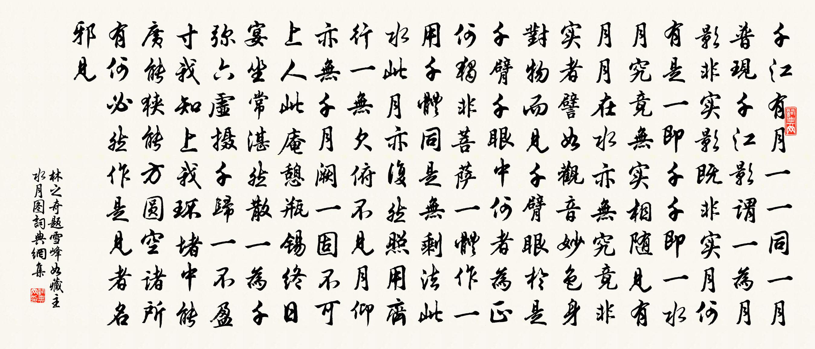 詩詞名句歷史字典書法欣賞書法字典國語詞典說文解字康熙字典古漢語字典標 題 作 者 詩 句 題雪峰如藏主水月圖作者:林之奇 朝代:宋代題雪峰如藏主水月圖原文千江有月一一同,一月普現千江影。謂一為月影非實,影既非實月何有。是一即千千即一,水月究竟無實相。隨見有月月在水,亦無究竟非實者。譬如觀音妙色身,對物而見千臂眼。於是千臂千眼中,何者為正何獨非。菩薩一體作一用,千體同是無剩法。此水此月亦復然,照用齊行一無欠。俯不見月仰亦無,千月闕一固不可。上人此庵憩瓶錫,終日宴坐常湛然。散一為千彌六虛,攝千歸一不盈寸。我知上我環堵中,能廣能狹能方圓。空諸所有何必然,作是見者名邪見。詩詞問答問:題雪峰如藏主水月圖的作者是誰?答:林之奇問:題雪峰如藏主水月圖寫於哪個朝代?答:宋代林之奇題雪峰如藏主水月圖書法欣賞題雪峰如藏主水月圖書法作品詩詞推薦程帥新作止戈堂索詩謹賦三首蘇籀〔宋代〕建州氓隸敢滔天,亂領妖腰伏乃愆。獻馘牙門森戟纛,解嚴後廡戢戈鋋。勞歸宣潤奇材客,勅賜番禺饋米船。勸課季夏有懷仲晦黃銖〔宋代〕六月苦炎蒸,山居晝方永。泠然南風至,蕭散荷氣騁。蜩鳴綠樹陰,魚躍橫塘淨。高蔓展修條,幽篁茁陰穎。良時臨江仙(望廬山)張輯〔宋代〕迢遞關山身歷遍,煙霞勝處曾游。九江江畔系孤舟。匡廬如畫裡,南望插天浮。瀑布香爐齊五老,層層爽氣陵秋。林知錄和余梅百詠劉克莊〔宋代〕一已為多況百哉,得君詩卷久驚猜。乍疑姑射山頭比,誰喚勾芒雪裡回。委壤可憐渠有命,傾城豈是子無媒。直須梅熟小雨楊萬里〔宋代〕風從獨樹忽然來,雨去前山遠卻回。留許枝間慰愁恨,兒童抵死打黃梅。授炙轂子歌二首希道〔唐代〕木津天魂,金液地魄。坎離運行寬無成,金木有數秦晉合。近效宜六旬,遠期三載闊。魄微入魂牝牡結,陽呴陰滋水調歌頭(遣懷)趙長卿〔宋代〕貪痴無了日,人事沒休期。白駒遇隙,百歲能得幾多時。自古腰金結綬,著意經營辛苦,回首不勝悲。名未能安穩望遠行李珣〔唐代〕春日遲遲思寂寥,行客關山路遙。瓊窗時聽語鶯嬌,柳絲牽恨一條條。休暈繡,罷 * ,貌逐殘花暗凋。同心猶結壺中天(壽陳碧山·十一月十五日)佚名〔宋代〕騎鯨直上,問姮娥何日,天生英傑。笑下瓊樓,還報導,甫近迎長佳節。萬里無雲,一天如水,擁出新團月。正當苦雨方回〔宋代〕擬勒移文問雨龍,麥秋忍不念吾農。黃雲萬頃成泥爛,偏與閒檐活瓦松。放魚李復〔宋代〕有客持巨魚,造門前自陳。敢致子產饋,可待姜侯賓。野人不知薄,但愧心美芹。橫盤五尺余,飛光生目輪。高鬣次韻漢卿舅臘梅范成大〔宋代〕垂垂瘦萼泫微霜,剪剪纖英鎖暗香。金雀釵頭金蛺蝶,春風傅得舊宮妝。古興二首沈徽〔唐代〕蔓草自細微,女蘿始夭夭。夤緣至百尺,榮耀非一朝。敷色高碧嶺,流芳薄丹霄。如何摧秀木,正為餘波漂。莖葉宴清都·連理海棠吳文英〔宋代〕繡幄鴛鴦柱。紅情密,膩雲低護秦樹。芳根兼倚,花梢鈿合,錦屏人妒。東風睡 * 枝,正夢枕、瑤釵燕股。障灩詠史詩即墨胡曾〔唐代〕即墨門開縱火牛,燕師營里血波流。固存不得田單術,齊國尋成一土丘。西江月李祁〔宋代〕雲觀三山清露,長生萬鬣青松。瓊璈珠珥下秋空。一笑滿天鸞鳳。霧鬢新梳紺綠,霞衣舊佩柔紅。更邀豪俊馭南風【南呂】玉交枝喬吉〔元代〕閒適二曲山間林下,有草舍蓬窗幽雅。蒼松翠竹堪圖畫,近煙村三四家。飄飄好夢隨落花,紛紛世味如嚼蠟。一任大暑憶靈隱寺冷泉一首蘇籀〔宋代〕我念熱客辭,懷哉冷泉游。此水暨此山,清便物殊尤。澄渟快一生,晶澈奪兩眸。青瑤碧玻瓈,三頃方能侔。澡雪偈二十二首釋子淳〔宋代〕大洪拂子,非有名,非無名,七佛前前本混成。非有相,非無相,淵而無下高無上。若論陰陽未兆時,卷舒俱在光襄陽行張潮〔唐代〕玉盤轉明珠,君心無定準。昨見襄陽客,剩說襄陽好無盡。襄漢水,峴山垂,漢水東流風北吹。只言一世長嬌寵,名句推薦千門開鎖萬燈明,正月中旬動帝京。張祜《正月十五夜燈》 南園春半踏青時,風和聞馬嘶。歐陽修《阮郎歸·南園春半踏青時》 冠必正,紐必結。襪與履,俱緊切。李毓秀《弟子規·謹》 紅旗捲起農奴戟,黑手高懸霸主鞭。 * 《七律·到韶山》 但從今、記取楚樓風,裴台月。辛棄疾《滿江紅·漢水東流》 竹喧歸浣女,蓮動下漁舟。王維《山居秋暝》 落葉滿空山,何處尋行跡。韋應物《寄全椒山中道士》 雪照山城玉指寒,一聲羌管怨樓間。劉著《鷓鴣天·雪照山城玉指寒》 去意徊徨,別語愁難聽。周邦彥《蝶戀花·早行》 長相思,長相思。晏幾道《長相思·長相思》