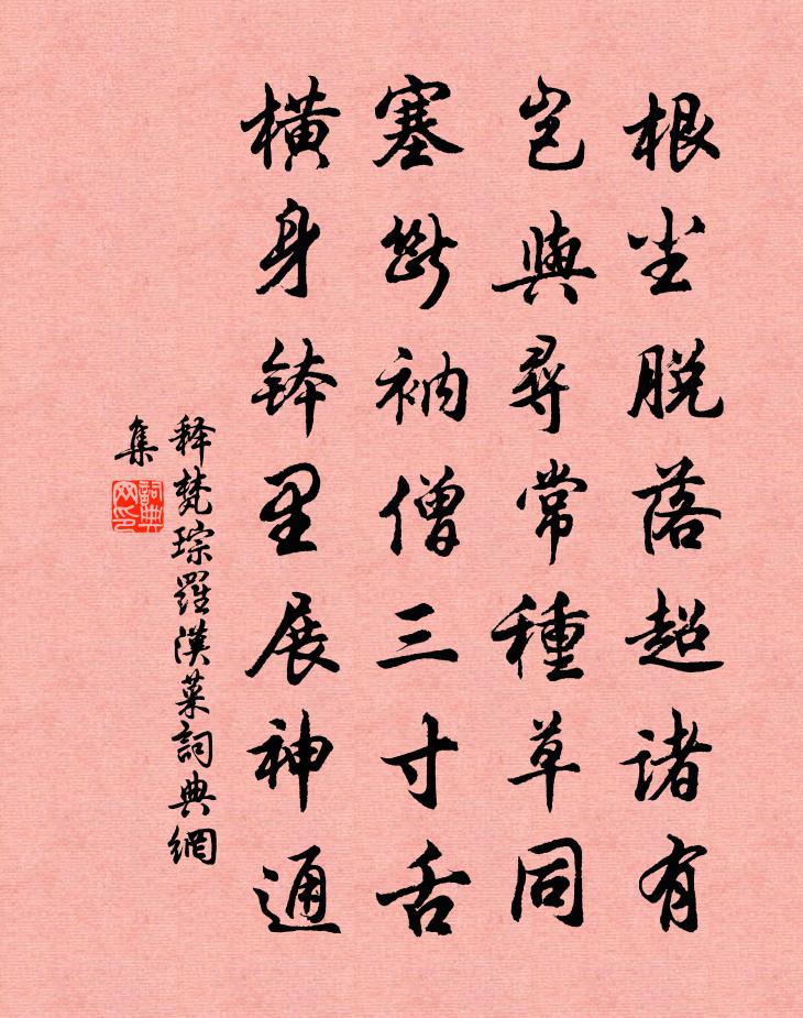 詩詞名句歷史字典書法欣賞書法字典國語詞典說文解字康熙字典古漢語字典標 題 作 者 詩 句 羅漢菜作者:釋梵琮 朝代:宋代羅漢菜原文根塵脫落超諸有,豈與尋常種草同。塞斷衲僧三寸舌,橫身缽里展神通。詩詞問答問:羅漢菜的作者是誰?答:釋梵琮問:羅漢菜寫於哪個朝代?答:宋代釋梵琮羅漢菜書法欣賞羅漢菜書法作品詩詞推薦愛蓮說周敦頤〔宋代〕水陸草木之花,可愛者甚蕃。晉陶淵明獨愛菊。自李唐來,世人盛愛牡丹。予獨愛蓮之出淤泥而不染,濯清漣而不次韻邵公濟尋梅三首郭印〔宋代〕素艷遙憐月色同,暗香披拂有無中。一枝已覺春光破,不恨南鄰笛里風。代吳守與趙侯為壽劉過〔宋代〕地蟠江漢節巋然,勁氣扶輿幾倍年。白玉丹砂浩無數,夜光隨處見山川。賀新郎佚名〔宋代〕父老持杯水。嘆世間、公論無情,是非易位。來餞花封賢令尹,籍籍攀轅耳語。留不住、青原撫字。驀地風波平地馬可卿棄家學道衲衣椎髻飄然有物外之思賦二徐瑞〔宋代〕我祖徐從事,君家馬自然。何曾絕倫誼,皆得列神仙。四百金丹字,參同鼎器篇。能通言外意,即此民單傳。題包虎張榘〔宋代〕正眎眈眈怒作威,西風搖毒上牙須。山翁祗作丹青看,馮婦從教自下車。戲題岸柳楊萬里〔宋代〕斫盡江邊楊柳梢,要教新歲換新條。老夫也鑷霜須鬢,鑷卻霜根出雪苗。楊柳歌庾信〔南北朝〕河邊楊柳百丈枝,別有長條踠地垂。河水衝激根株危,倏忽河中風浪吹。可憐巢里鳳凰兒,無故當年生別離。流槎嵩山十二首玉女窗歐陽修〔宋代〕玉女不可邀,蒼崖郁迢直。石乳滴空竇,仰見泬寥碧。徙倚難久留,桂樹含春色。句蕭德藻〔宋代〕稚子推窗窺過雁,數峰乘隙入西軒。真珠簾陸游〔宋代〕燈前月下嬉遊處。向笙歌、錦繡叢中相遇。彼此知名,才見便論心素。淺黛嬌蟬風調別,最動人、時時偷顧。歸去登南神光寺塔院(一本題作登南台僧寺)韓偓〔唐代〕無奈離腸日九回,強攄離抱立高台。中華地向城邊盡,外國雲從島上來。四序有花長見雨,一冬無雪卻聞雷。日宮頌古一百首釋智愚〔宋代〕真甚破沙盆,掀翻海岳昏。頂門真箇瞎,個古累兒孫。開元雜題七首繡嶺宮陸龜蒙〔唐代〕繡嶺花殘翠倚空,碧窗瑤砌舊行宮。閒乘小駟濃陰下,時舉金鞭半袖風。秋雨陸游〔宋代〕一秋風雨蔽白日,積水鬼神愁太陰。寒螿悲鳴草根濕,水鳥暝哭菰叢深。殘年不覺日月逝,病骨惟愁霜露侵。常有水輪詠梅堯臣〔宋代〕孤輪運寒水,無乃農者營。隨流轉自速,居高還復傾。利才畎澮間,功欲霖雨並。不學假混沌,亡機抱瓮罌。句陳天麟〔宋代〕紫芝秀出何年日,碧藕開成幾丈花。滿庭芳 書蟲馮惟敏〔明代〕蠶魚雖小,咬文嚼字,有甚才學。綿纏紙里書中耗,占定窩巢。俺看他一生怕了,你鑽他何日開交。聽吾道:輕身太孺人蔣氏輓詞樓鑰〔宋代〕潤屋惟純儉,居然法度循。松楸先壟下,風月舊湖濱。子婦皆知孝,孫曾亦可人。浦江如可贖,真欲百其身。登涼州尹台寺岑參〔唐代〕胡地三月半,梨花今始開。因從老僧飯,更上夫人台。清唱雲不去,彈弦風颯來。應須一倒載,還似山公回。名句推薦北山白雲里,隱者自怡悅孟浩然《秋登萬山寄張五/九月九日峴山寄張子容》 歌聲未盡處,先淚零周邦彥《綺寮怨·上馬人扶殘醉》 蕭蕭遠樹疏林外,一半秋山帶夕陽。寇準《書河上亭壁》 一番荷芰生池沼,檻前風送馨香。尹鶚《臨江仙·一番荷芰生池沼》 沙上並禽池上暝。雲破月來花弄影。張先《天仙子·水調數聲持酒聽》 誰言寸草心,報得三春暉。孟郊《遊子吟 / 迎母漂上作》 不知細葉誰裁出,二月春風似剪刀。賀知章《詠柳 / 柳枝詞》 我非生而知之者,好古,敏以求之者也。孔子弟子《論語·述而篇》 眼見的吹翻了這家,吹傷了那家,只吹的水盡鵝飛罷!王磐《朝天子·詠喇叭》 愁凝處,渺渺殘照紅斂吳文英《宴清都·秋感》