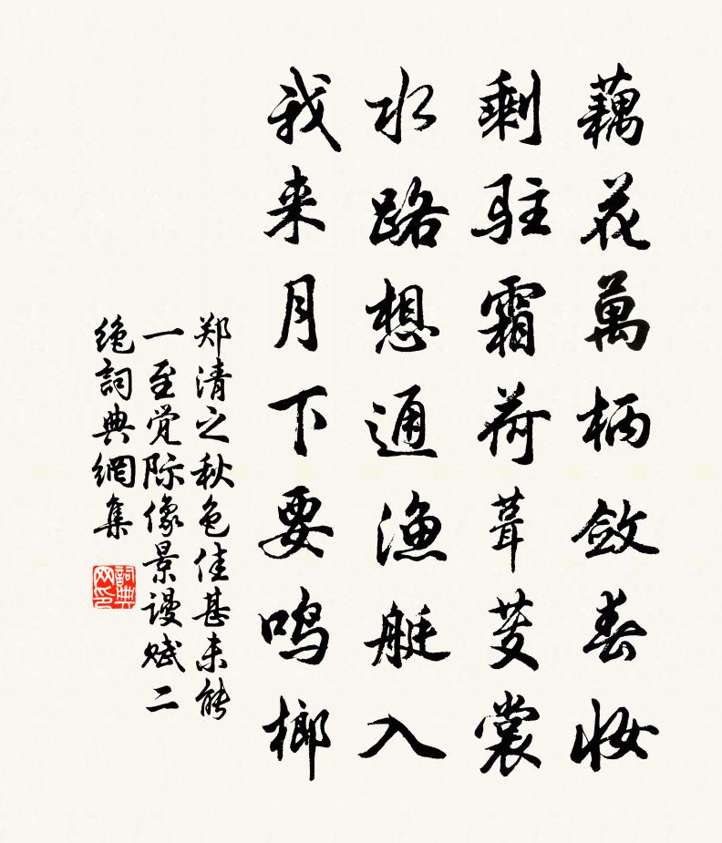 詩詞名句歷史字典書法欣賞書法字典國語詞典說文解字康熙字典古漢語字典標 題 作 者 詩 句 秋色佳甚未能一至覺際像景謾賦二絕作者:鄭清之 朝代:宋代原文藕花萬柄斂春妝,剩駐霜荷葺芰裳。水路想通漁艇入,我來月下要鳴榔。詩詞問答問:《秋色佳甚未能一至覺際像景謾賦二絕》的作者是誰?答:鄭清之問:該詩寫於哪個朝代?答:宋代書法欣賞秋色佳甚未能一至覺際像景謾賦二絕書法作品詩詞推薦清明前一日韓子華以靖節斜川詩見招游李園既歐陽修〔宋代〕少年喜追隨,老大厭諠嘩。◇愧二三子,邀我行看花。花開豈不好,時節亦云嘉。因病既不飲,眾歡獨成嗟。管弦女冠子(大石調)柳永〔宋代〕斷雲殘雨。灑微涼、生軒戶。動清籟、蕭蕭庭樹。銀河濃淡,華星明滅,輕雲時度。莎階寂靜無睹。幽蛩切切秋吟花想容/武陵春賀鑄〔宋代〕南國家人推阿秀,歌醉幾相逢。雲想衣裳花想容。春未抵情濃。津亭回首青樓遠,簾箔更重重。今夜扁舟淚不供。客江城歸期尚阻董嗣杲〔宋代〕晴坂桑麻綠,春溪苹藻香。家林方歉歲,身紀且殊鄉。澒洞時機密,淹留日計長。此生歸造物,不必殢行藏。史稿劉克莊〔宋代〕雖有隆乾手澤傳,空疏豈敢望談遷。春秋筆絕經誰續,光岳氣分材少全。老去汗顏慚巧斬,向來執手付遺編。文名十月十五早飯清都觀逍遙堂黃庭堅〔宋代〕心游魏闕魚千里,夢覺邯鄲黍一炊。蔬食菜羹吾亦飽,逍遙堂下葉辭枝。梅花喜神譜大蕊八枝宋伯仁〔宋代〕方深有制度,撞之以合樂。止樂戛以敔,始終知所覺。次韻王才少師雜花五首李彌遜〔宋代〕桃紅深淺漫成堆,猶喜霜葩綴舊枝。喚取張盧來共醉,莫隨風雨便分披。次申屠子迪韻 其一王冕〔元代〕荒城余古堞,登眺喜新晴。日淡山容靜,秋高海氣清。孤鳶隨鶴下,飢兕近人行。感物添惆悵,誰能會此情?寄題辰州沅陽館鄭獬〔宋代〕張侯守辰溪,作館清溪上。峻趾擁崇岡,跋海鰲足壯。石嶝盤山回,遊人出屏障。林壑互蔽虧,昏明各異狀。辰溪送顧朝陽還吳李頎〔唐代〕寂寞俱不偶,裹糧空入秦。宦途已可識,歸臥包山春。舊國指飛鳥,滄波愁旅人。開樽洛水上,怨別柳花新。五月二十一日風雨大作陸游〔宋代〕風雨縱橫夜徹明,須臾更覺勢如傾。出門已絕近村路,對面不聞高語聲。銜舳江關多蜀估,宿師淮浦飽吳粳。老民次韻權季玉枕上偶成方回〔宋代〕邇日屢聞親藥鼎,客懷沈鬱與誰論。細參素問心無病,勤剔青燈眼未昏。九折政思為孝子,七襄未用乞天孫。察君八聲甘州姚雲文〔宋代〕卷絲絲、雨織半晴天,棹歌發清舷。甚蒼虬怒耀,靈鼉急吼,雪涌平川。樓外榴裙幾點,描破綠楊煙。把畫羅遙指解連環劉克莊〔宋代〕懸弧之旦。憶爭騎竹馬,各懷金彈。恨歲月、去我堂堂,向酒畔愁生,鏡中顏換。灶壤丹飛,慢追悔、鄴侯婚宦。贈岩居僧齊己〔唐代〕石如騏驎岩作室,秋苔漫壇淨於漆。袈裟蓋頭心在無,黃猿白猿啼日日。夜吟方回〔宋代〕昔遇孫真人,授我服氣訣。幼讀先子書,亦嘗窺秘說。受持苦不堅,兩鬢忽已雪。謂當屏孥累,兼復斷葷血。千息次韻徐守宴新進士劉克莊〔宋代〕銀袍鵠立帝當陽,曾看天待馬綴行。一鼓諸君俱作氣,七襄吾老不成章。先賢肯靠三場飽,男子須留百世芳。學取鷓鴣天趙長卿〔宋代〕落魄東吳二十春。風流詩句得清新。今年卻恨花星照,再見溫卿與遠真。分楚佩,染巫雲。赤繩結得短花茵。若非潤夫飯僧景泰相款信宿告歸白玉蟾〔宋代〕夢中也學雲峰路,未老來游蒲澗山。無數老僧閒道士,笑人騎馬出松關。名句推薦既秉上皇心,豈屑末代誚。謝靈運《七里瀨》 青紫雖被體,不如早還鄉。杜甫《夏夜嘆》 西陸蟬聲唱,南冠客思深。駱賓王《詠蟬 / 在獄詠蟬》 孤兔淒涼照水,曉風起、銀河西轉。吳文英《玉漏遲·瓜涇度中秋夕賦》 二客東南名勝,萬卷詩書事業,嘗試與君謀。辛棄疾《水調歌頭·舟次揚州和人韻》 漠漠帆來重,冥冥鳥去遲。韋應物《賦得暮雨送李胄 / 賦得暮雨送李曹》 解釋春風無限恨,沉香亭北倚闌乾。李白《清平調·其三》 無限河山淚,誰言天地寬夏完淳《別雲間》 龍魚失水難為用,龜玉蒙塵未見珍牟融《春日山亭》 命如南山石,四體康且直佚名《孔雀東南飛並序/古詩為焦仲卿妻作》