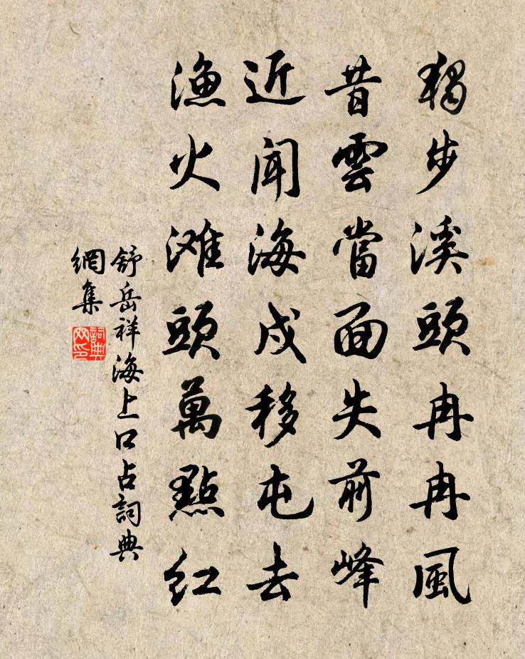 詩詞名句歷史字典書法欣賞書法字典國語詞典說文解字康熙字典古漢語字典標 題 作 者 詩 句 海上口占作者:舒岳祥 朝代:宋代海上口占原文獨步溪頭冉冉風,昔雲當面失前峰。近聞海戍移屯去,漁火灘頭萬點紅。詩詞問答問:海上口占的作者是誰?答:舒岳祥問:海上口占寫於哪個朝代?答:宋代舒岳祥海上口占書法欣賞海上口占書法作品詩詞推薦送王吉州宣子舍人,和明州二首楊萬里〔宋代〕碧海翻詞筆,清霜逼誼風。不應盛名下,未著玉堂中。剩欲公留此,其如帝望公。從今摩病眼,看到火城紅。送徐季公運乾罷任王之道〔宋代〕羈棲無奈老而窮,又見徐卿馬首東。快意一時荷葉雨,增明千里稻花風。高材合在雲霄上,勝處能忘澗壑中。法護題滄浪峽榜鄭仁表〔唐代〕分峽東西路正長,行人名利火然湯。路傍著板滄浪峽,真是將閒攪撩忙。題吳先生山居劉得仁〔唐代〕先生此幽隱,便可謝人群。潭底見秋石,樹間飛霽雲。山居心已慣,俗事耳憎聞。念我要多疾,開爐藥許分。早起周容〔宋代〕四海人同夢,雞聲忽起予。千秋心未已,一日事何如?酒趣劉伶減,年華鄧禹虛。憑欄空自笑,抱瓮灌園蔬。即事陸游〔宋代〕還鄉吳語熟,伏枕越吟悲。接客寒溫簡,過鄰几杖隨。獨嗟親舊少,不覺歲時移。陌上人爭看,風欹白接籬。船頭韓偓〔唐代〕兩岸綠蕪齊似翦,掩映雲山相向晚。船頭獨立望長空,日艷波光逼人眼。寄漢陽守王中甫劉克莊〔宋代〕自辭莫府徑歸耕,同舍分攜闕寄聲。帳下飛書空有草,軍中上緣獨無名。山深仆不聞時事,塞近君應得虜情。聞道而久交葉茵〔宋代〕彼哉市道交,出語指天日。未逢魏與裴,三嘆扁斯石。立春帖子皇后閣周必大〔宋代〕新年佳節喜相重,屈指元宵五日中。雪柳巧裝金勝綠,燈球斜映玉釵紅。室中三關釋原妙〔宋代〕杲日當空,無所不照,因甚被片雲遮卻。清平樂 聞雁姚燧〔元代〕春方北度。又送秋南去。萬里長空風雨路。誰汝冥鴻知處。朝朝舊所窺魚。由渠水宿林居。為問江湖苦樂,汝於白治圃雜書二十首方回〔宋代〕十載前初種,酴醾間木香。對花猶綠髮,攜酒有黃堂。忽起風雲陣,幾成鹿豕場。少陵憶嚴尹,非復舊春光。竹枝歌孫嵩〔宋代〕巴子城荒非昔人,公孫何處問遺民。千年惟有武侯磧,留與踏歌行早春。踏雲行 謝於公鞋馬鈺〔元代〕走入玄門,牽回白鯉。綴詞感謝吾儕履。從今步步出紅塵,無心著去觀桃李。採訪幽微,搜尋至理。因師大悟離鄉山中雜言吳錫疇〔宋代〕老作山翁行輩人,素衣曾不化京塵。只應猿鶴無驚怨,從自龍蛇有屈伸。奉和襲美太湖詩二十首入林屋洞陸龜蒙〔唐代〕知名十小天,林屋當第九。題之為左神,理之以天后。魁堆辟邪輩,左右專備守。自非方瞳人,不敢窺洞口。唯君和黃南嘉相賀曹勛〔宋代〕賊馬憑凌勢怒號,鐵衣夜掛映征袍。謹嚴甲士方超距,森索妖星絕繹騷。橫槊賦詩雖昔事,枕戈待旦取徒勞。公詩梅花喜神譜爛熳二十八枝宋伯仁〔宋代〕艤艇白鷗邊,寒雨敲青箬。駭浪不回頭,方識江湖樂。極相思令/極相思譚意哥〔宋代〕湘東最是得春先。和氣暖如綿。清明過了,殘花巷陌,猶見鞦韆。對景感時情緒亂,這密意、翠羽空傳。風前月下名句推薦雁盡書難寄,愁多夢不成。沈如筠《閨怨二首·其一》 聞善以相告也,見善以相示也戴聖《禮記·儒行》 年來腸斷秣陵舟,夢繞秦淮水上樓王士禎《秦淮雜詩二十首·其一》 聞道閶門萼綠華,昔年相望抵天涯李商隱《無題二首》 夫眾喣漂山,聚蚊成雷班固《漢書·傳·景十三王傳》 漫惹爐煙雙袖紫,空將酒暈一衫青。納蘭性德《浣溪沙·伏雨朝寒愁不勝》 四十年來家國,三千里地山河李煜《破陣子·四十年來家國》 聞名不如見面,見面勝似聞名。施耐庵《水滸傳·第三回》 且欲近尋彭澤宰,陶然共醉菊花杯。崔曙《九日登望仙台呈劉明府容》 無田似我猶欣舞,何況田間望歲心。曾幾《蘇秀道中》
