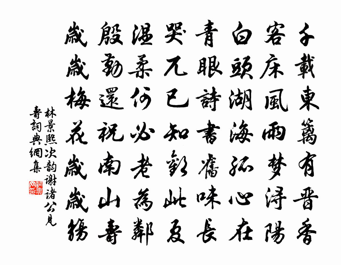 詩詞名句歷史字典書法欣賞書法字典國語詞典說文解字康熙字典古漢語字典標 題 作 者 詩 句 次韻謝諸公見壽作者:林景熙 朝代:宋代次韻謝諸公見壽原文千載東籬有晉香,客床風雨夢潯陽。白頭湖海孤心在,青眼詩書舊味長。哭兀已知歡此夏,溫柔何必老為鄰。殷勤還祝南山壽,歲歲梅花歲歲觴。詩詞問答問:次韻謝諸公見壽的作者是誰?答:林景熙問:次韻謝諸公見壽寫於哪個朝代?答:宋代林景熙次韻謝諸公見壽書法欣賞次韻謝諸公見壽書法作品詩詞推薦次韻毛君山房即事十首蘇轍〔宋代〕溪山付與醉中仙,美酒何曾斗十千。就得江邊賤魚稻,閒官未用苦相憐。織婦詞元稹〔唐代〕織夫何太忙,蠶經三臥行欲老。蠶神女聖早成絲,今年絲稅抽征早。早征非是官人惡。去歲官家事戎索。征人戰苦外廚遺火二首王安石〔宋代〕龜鬼何為便赫然,似嫌刀機苦無膻。圖書得免同煨燼,卻賴廚人凊不眠。又贈謂之司馬光〔宋代〕文藻兼名理,三吳第一賢。鄉心幾千里,飛雁滿秋天。白雲庵四首逍遙子〔宋代〕洞底草蒲綠作坡,松根況有茯苓多。自能飽飯太平日,不學式微歌浩歌。九月一日睡起錢時〔宋代〕帖帖冬窩眠正穩,剝地鐘聲忽敲醒。起來空堂一事無,日弄波紋滿窗影。東林寺贈宜上人董嗣杲〔宋代〕幽階苔蘚翠纖纖,屐齒沾濡逐步黏。曉澗迸泉迷杏塢,春風停雨暗茅檐。禪高何待音聲悟,詩好爭傳格律嚴。誰浼和壽岡楊先生上丁四首彭龜年〔宋代〕禮成綿蕝蕝固遐方,揭此威儀日月光。他日抗章論祀事,賢侯不減漢平當。寄潭州劉郎中張詠〔宋代〕當年心計此心知,忽忽逢人亦自疑。枉是憂公生白髮,有何長略謝清時。林僧已怪抽身晚,朝侶猶嫌到闕遲。多喜夜話贈華師陸游〔宋代〕少喜洛陽俠,今成衡岳僧。深培地爐火,明照佛龕燈。衰鬢晨霜白,禪心古澗澄。猶能遍參在,為我買行縢。戲詠文房四友劉克莊〔宋代〕昔可摧堅陣,今難作選鋒。自憐吾鬢禿,亦笑汝頭童。和答劉太博攜家游廬山見寄黃庭堅〔宋代〕緩轡松陰不起塵,嵐山經雨一番新。遙知數夜尋山宿,便是全家避世人。落日已 * 際路,飛花還報洞中春。可憐贈毛仙翁鄭浣〔唐代〕至道無名,至人長生。爰觀繪事,似挹真形。方口渥丹,濃眉刷青。松姿本秀,鶴質自輕。道德神仙,內蘊心靈。與長老夜話出故人俞宋護書予至山之日俞適至王洋〔宋代〕三十年餘病作魔,相思長恨隔關河。僧窗開讀君書至,丈室分龕我暫過。憶爾音容如會合,感與蹤跡念蹉跎。兩篇皇帝合春帖子六首蘇頌〔宋代〕西昴昏當午,諏訾旦在東。聖君南面治,常候四星中。梅窗李龍高〔宋代〕月射雲綃印玉腮,風穿罅隙度香埃。莫將易向花邊讀,惹得周公入夢來。臨江仙王哲〔元代〕吸取西江金浪水,朝朝用此盤纏。循環流轉復清泉。肌膚偏瑩淨。壽算得遷延。北斗自然拘姓籍,南辰生注長年。當斷吟邵雍〔宋代〕斷以決疑,疑不可緩。當斷不斷,反受其亂。對花邵雍〔宋代〕新花色鮮艷,故花色憔悴。明朝花更開,新花何有異。秋江四絕滕岑〔宋代〕十日江頭一向風,差差寒浪白吹空。漁舠輊小不如葉,信意低昂風浪中。名句推薦精於物者以物物,精於道者兼物物。荀子《荀子·解蔽》 天明登前途,獨與老翁別。杜甫《石壕吏》 養心莫善於誠。荀子《荀子·不苟》 嵩雲秦樹久離居,雙鯉迢迢一紙書。李商隱《寄令狐郎中》 看蓬門秋草,年年破巷,疏窗細雨,夜夜孤燈。鄭燮《沁園春·恨》 君問歸期未有期,巴山夜雨漲秋池。李商隱《夜雨寄北》 舍心腹而順手足羅貫中《三國演義·第二十三回》 入世冷挑紅雪去,離塵香割紫雲來。曹雪芹《訪妙玉乞紅梅》 昔人已乘黃鶴去,此地空餘黃鶴樓。崔顥《黃鶴樓 / 登黃鶴樓》 山無陵,江水為竭,冬雷震震,夏雨雪,天地合,乃敢與君絕。佚名《上邪》
