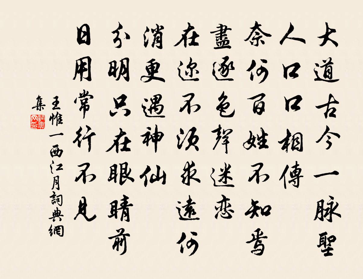 詩詞名句歷史字典書法欣賞書法字典國語詞典說文解字康熙字典古漢語字典標 題 作 者 詩 句 西江月作者:王惟一 朝代:元代西江月原文大道古今一脈,聖人口口相傳。奈何百姓不知焉。盡逐色聲迷戀。在邇不須求遠,何消更遇神仙。分明只在眼睛前。日用常行不見。詩詞問答問:西江月的作者是誰?答:王惟一問:西江月寫於哪個朝代?答:元代問:西江月是什麼體裁?答:詞王惟一西江月書法欣賞西江月書法作品詩詞推薦隱甫聖可子儀同游寶蓮分韻得郭字馮時行〔宋代〕海縣一廛市,天地一郛郭。跼蹐礙高厚,而況自羈絡。末俗競芒忽,訟紙霜葉落。平心作巨帚,一掃付清廓。無事書王定國所藏煙江疊嶂圖(王晉卿畫)蘇軾〔宋代〕江上愁心千疊山,浮空積翠如雲煙。山耶雲耶遠莫知,煙空雲散山依然。但見兩崖蒼蒼暗絕谷,中有百道飛來泉。奉和御製奉安聖像禮成夏竦〔宋代〕琳宮胥宇象清都,金閣叢楹閟寶符。昭假仙遊彰胄緒,范鎔真像極規模。精衷欽翼明威顯,近輔恭迎茂典敷。美應金縷曲/賀新郎劉辰翁〔宋代〕春入番江雨。滿湖山、鶯啼燕雨,前歌后舞。聞道行驄行且止,卻聽譙樓更鼓。正未卜,陰晴同否。老子胸中高小題竹石鄭燮〔清代〕咬定青山不放鬆,立根原在破岩中;千磨萬擊還堅韌,任爾東西南北風。紫虛觀方岳〔宋代〕小炷爐熏待瀹茶,瓦盆添水養蒲芽。江南地暖得春早,開盡雪籬無數花。行崧嶺將半下瞰山中一人家似不與世者凝佇久陳文蔚〔宋代〕幾曲青山一畝宮,前村惟有小溪通。雞鳴鳥宿知昏旦,水碓無人自在舂。齊天樂 夜宴楊元誠山樓,送陳子敬之三山,張翥〔元代〕闌乾十二東風外,春藏畫樓鴛瑣。蠟炬光濃,氍毹坐軟,寶鼎旋培沉火。玻璃*大。但有酒須傾,有歌須和。劇飲次山房見寄韻何夢桂〔宋代〕懷人夜寤擗,彼美天西方。世變急三峽,吾道蹇兩當。起坐觀列緯,翕箕正煌煌。游雲起碧落,反覆變白蒼。兩儀詠梅五十首呈史尚書釋紹嵩〔宋代〕再見山城石井邊,幽姿高韻獨翛然。要知不被梅花笑,更把前題改數聯。品令趙長卿〔宋代〕好事客。宮商內、吟得風清月白。主人幸有豪家意,後堂煞有春色。花壓金翹俏相映,酒滿玉纖無力。你若待我些九日使君席奉餞衛中丞赴長水岑參〔唐代〕節使橫行西出師,鳴弓擐甲羽林兒。台上霜風凌草木,軍中殺氣傍旌旗。預知漢將宣威日,正是胡塵欲滅時。為報謝提點刑獄李郎中贈扇宋祁〔宋代〕規裁珍素裂輕雲,柄剪春篁燥叢露。制以為扇持贈君,拂君懷袖袪君暑。蜀天六月苦炎歊,赤龍秋秋駐雲霧。火走藉田詩蕭衍〔南北朝〕寅賓始出日。律中方星鳥。千畝土膏紫。萬頃陂色縹。嚴駕佇霞昕。浥露逗光曉。啟行天猶暗。伐鼓地未悄。蒼龍城南偶題章碣〔唐代〕誰家朱閣道邊開,竹拂欄乾滿壁苔。野水不知何處去,遊人卻是等閒來。南山氣聳分紅樹,北闕風高隔紫苔。可惜再次韻王灼〔宋代〕岷江劍棧總寧居,聞道邊頭亦晏如。猛士雲屯方賈勇,胡兒莫送講和書。吳江岸(或為蘇舜欽作)蘇軾〔宋代〕曉色兼秋色,蟬聲雜鳥聲。壯懷銷鑠盡,回首尚心驚。失調名佚名〔宋代〕王孫去後多芳草。游張園陸游〔宋代〕冷局歸差早,名園得緩行。穿林山驟出,度硤路微平。霜近柳無色,風生蒲有聲。出門還戃怳,滿路夕陽明。詠漁父徐僑〔宋代〕占得江湖汗漫天,了無鄉縣掛民編。賣魚買酒醉日日,長是太平無事年。名句推薦從今若許閒乘月,拄杖無時夜叩門。陸游《游山西村》 肌玉暗消衣帶緩,淚珠斜透花鈿側。文天祥《滿江紅·和王夫人滿江紅韻以庶幾後山妾薄命之意》 雲山有意,軒裳無計,被西風吹斷功名淚劉致《山坡羊·燕城述懷》 君不見,黃河之水天上來,奔流到海不復回。李白《將進酒》 沉恨細思,不如桃杏,猶解嫁東風。張先《一叢花令·傷高懷遠幾時窮》 長江千里,煙淡水雲闊。李綱《六么令·次韻和賀方回金陵懷古鄱陽席上作》 月落烏啼霜滿天,江楓漁火對愁眠。張繼《楓橋夜泊 / 夜泊楓江》 揮手自茲去,蕭蕭班馬鳴。李白《送友人》 採得百花成蜜後,為誰辛苦為誰甜。羅隱《蜂》 西風滿天雪,何處報人恩。齊己《劍客》
