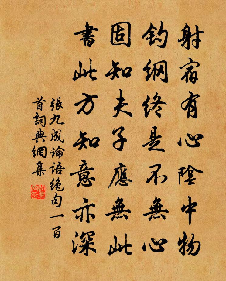 詩詞名句歷史字典書法欣賞書法字典國語詞典說文解字康熙字典古漢語字典標 題 作 者 詩 句 論語絕句一百首作者:張九成 朝代:宋代論語絕句一百首原文射宿有心陰中物,釣綱終是不無心。固知夫子應無此,書此方知意亦深。詩詞問答問:論語絕句一百首的作者是誰?答:張九成問:論語絕句一百首寫於哪個朝代?答:宋代張九成論語絕句一百首書法欣賞論語絕句一百首書法作品詩詞推薦謝世頌三首吳潛〔宋代〕生在湖州新市上,死在循州貢院中。一場雜劇也好笑,來時無物去時空。詠鵝駱賓王〔唐代〕鵝,鵝,鵝,曲項向天歌。白毛浮綠水,紅掌撥清波。望海朝(汪漕慶壽)史浩〔宋代〕煙濃柳徑,霞蒸花砌,春深特地芳辰。蝶侶斗狂,鶯雛弄巧,嬉嬉舞態歌唇。西鋪集簪紳。正桂薰蘭玉,天壽松椿傳言玉女 錢塘元夕汪元量〔宋代〕一片風流,今夕與誰同樂。月台花館,慨塵埃漠漠。豪華盪盡,只有青山如洛。錢塘依舊,潮生潮落。萬點燈光,一落索司馬遷〔兩漢〕蟬帶殘聲移別樹。晚涼房戶。秋風有意染黃花,下幾點、淒涼雨。渺渺雙鴻飛去。亂雲深處。一山紅葉為誰愁,供海中醉題時雷雨初霽天水相接也陸游〔宋代〕羈游那復恨,奇觀有南溟。浪蹴半空白,天梁無盡青。吐吞交日月,澒洞戰雷霆。醉後吹橫笛,魚龍亦出聽。題君子亭趙蕃〔宋代〕菊落淵明手,愛人仍及烏。荷花定好友,周子亦陶徒。黃羅{左衤右羅}宋祁〔宋代〕袁褚聲華約略同,到頭忠佞兩成功。先皇謾賜黃羅{左衤右羅},不識明眸有貫虹。嘉禾百詠村門口張堯同〔宋代〕昔日荒閒地,今聞市井喧。人情看促迫,無復似當年。寄贈長安宋澥逸人十韻魏野〔宋代〕家盛翻嘉遁,誰同物外情。徵君為密友,內翰是難兄。靜論儒宗服,狂歌俠少驚。道裝輕紫綬,酒旆勝紅旌。將相暮春即事魚玄機〔唐代〕深巷窮門少侶儔,阮郎唯有夢中留。香飄羅綺誰家席,風送歌聲何處樓。街近鼓鼙喧曉睡,庭閒鵲語亂春愁。安能初到漁滄溪陳宓〔宋代〕平生不到滄漁溪,邂逅相逢如有約。遠觀已得環岫奇,俯瞰未識游魚樂。倚欄初試一銖餌,便有纖鱗最先覺。須臾和王弱翁七首彭龜年〔宋代〕霜螯百鎰重,人世一身多。我意已悽慘,如君風味何。次致和韻王冕〔元代〕方見雲山出,忽然風雨來。暴生三尺水,推去一階苔。古意何能解?新詩止自裁。天時與人事,歷歷不須猜。秋江夜泊寄劉鈞正字李中〔唐代〕閒憶詩人思倍勞,維舟清夜泥風騷。魚龍不動澄江遠,雲霧皆收皎月高。潮滿釣舟迷浦嶼,霜繁野樹叫猿猱。此時郊廟歌辭。朝日樂章。雍和佚名〔唐代〕晨儀式薦,明祀惟光。神物爰止,靈暉載揚。玄端肅事,紫幄興祥。福履攸假,於昭允王。次韻范至能峽中見寄張栻〔宋代〕合綰絲綸對紫薇,卻捫青壁聽猿啼。只應許國心金石,蜀道如天亦可梯。次韻邢敦夫秋懷十首秦觀〔宋代〕蝮蛇初螫手,壯士斷其腕。豈不悲毀傷,所恤在軀幹。西羌沙鹵地,置戍或煩漢。雞肋不足雲,阿瞞妙思算。偶題因懷張王二諫議四錫〔宋代〕理郡三年政未聞,孤城僻在浙江濆。金門路遠書難奇,水國吟余日又曛。半夜啼猿千里客,數峰殘雪一谿雲。詩中車駕過重華宮和陳止齋韻袁說友〔宋代〕曉到觚稜簇仗齋,千官星拱馬無嘶。清塵警蹕來宮闕,夾道觀聲浹耄倪。孝治未應夸鄭隧,皇威今已竦邊鼙。小臣名句推薦君不見,黃河之水天上來,奔流到海不復回。李白《將進酒》 帝王之道,以寬仁為大。令狐德棻《周書·本紀·卷四》 自是相思抽不盡,卻教風雨怨秋聲。鄭燮《詠芭蕉》 念月榭攜手,露橋聞笛。周邦彥《蘭陵王·柳》 鳥下綠蕪秦苑夕,蟬鳴黃葉漢宮秋。許渾《鹹陽城東樓 / 鹹陽城西樓晚眺 / 西門》 珍重主人心,酒深情亦深。韋莊《菩薩蠻·勸君今夜須沈醉》 寒鴉飛數點,流水繞孤村。楊廣《失題》 滿腹詩書漫古今,頻年流落易傷心。宇文虛中《在金日作·選二》 離宮絕曠,身體摧藏,志念沒沉,不得頡頏。王昭君《怨詞》 善化不足,惡化有餘。佚名《增廣賢文·上集》