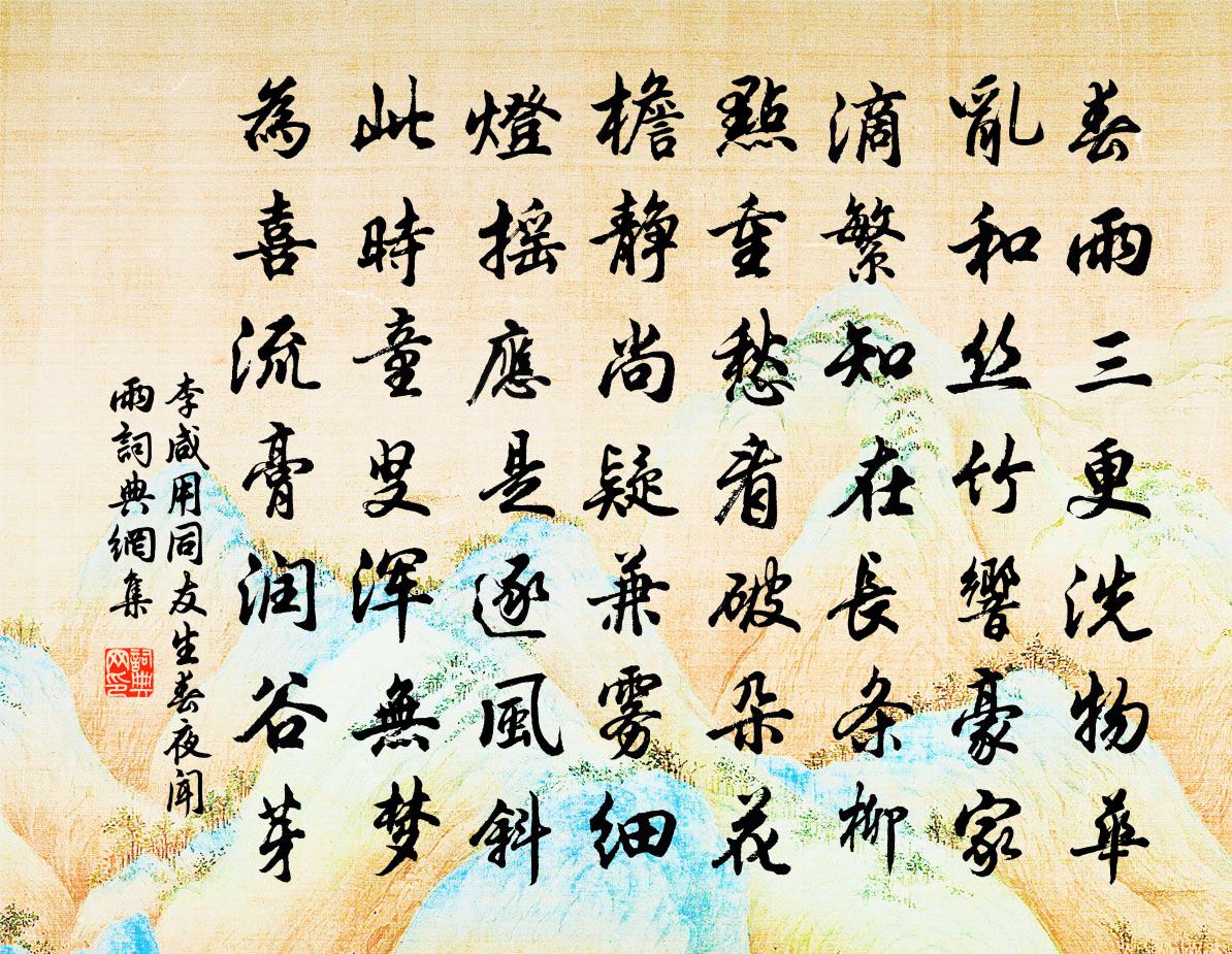詩詞名句歷史字典書法欣賞書法字典國語詞典說文解字康熙字典古漢語字典標 題 作 者 詩 句 同友生春夜聞雨作者:李鹹用 朝代:唐代同友生春夜聞雨原文春雨三更洗物華,亂和絲竹響豪家。滴繁知在長條柳,點重愁看破朵花。檐靜尚疑兼霧細,燈搖應是逐風斜。此時童叟渾無夢,為喜流膏潤谷芽。詩詞問答問:同友生春夜聞雨的作者是誰?答:李鹹用問:同友生春夜聞雨寫於哪個朝代?答:唐代問:同友生春夜聞雨是什麼體裁?答:七律李鹹用同友生春夜聞雨書法欣賞同友生春夜聞雨書法作品注釋全唐詩:卷646-51詩詞推薦登擬峴陸游〔宋代〕翠阜圍平野,朱樓壓繚牆。風回半汀雁,雲護一天霜。有地聊容拙,無方可療狂。白頭詩興在,吟罷意差強。從禮載酒要余及明叔游合普六首趙蕃〔宋代〕宦忙未抵作詩忙,九十春光自短長。三徑可歸誰是伴,若人風節慕求羊。一冬無雪立春後九日始有之次湯倅韻虞儔〔宋代〕冰花何事太遲開,肯傍春風腳底來。飛絮漫天輕認柳,落英滿地錯憐梅。玄冥莫恨空歸去,青帝從教倒載回。官冷所居三章章八句一章章十句洪皓〔宋代〕今我所居,圭竇蓽門。俯首折腰,如坐覆盆。終日譊譊,形弊神昏。死所未知,舊事誰諭。荷花盛開以病旬余不至亭上偶成二唐律岳珂〔宋代〕好在中孚澤,猶橫未濟舟。擲金隨柳舞,跳玉趁蓮謳。埽榻方思士,鉤簾也覓侯。病夫均一笑,此意本無求。歷代詩三國楊簡〔宋代〕兩漢四百載,分為魏蜀吳。曹操始居鄴,劉備據成都。孫權在金陵,鼎足互相圖。題碧蘚亭陳舜俞〔宋代〕瀟灑闌乾碧玉叢,頻來游賞似兒童。縈迴修竹撩清影,刻畫新詩繞翠筒。十載雪霜林色改,幾翻風月酒尊空。子猷奉陪武相公西亭夜宴陸郎中崔備〔唐代〕賓閣玳筵開,通宵遞玉杯。塵隨歌扇起,雪逐舞衣回。剪燭清光發,添香暖氣來。令君敦宿好,更為一裴回。五月一日薄暮至三水倚檣欹枕曾豐〔宋代〕皓月三江口,青苹四岸邊。風頭橫立海,水面上浮天。陰氣猶能雜,陽威不敢燃。夏行秋月令,造物相吾眠。涇州聽張處士彈琴項斯〔唐代〕邊州獨夜正思鄉,君又彈琴在客堂。仿佛不離燈影外,似聞流水到瀟湘。山居詩釋延壽〔宋代〕霧鎖煙霾宴寂堂,含虛凝綠水雲鄉。搜玄揭裹真風遠,招隱詩中野思長。真柏最宜堆厚雪,危花終怯下輕霜。滔滔過建陽二首劉克莊〔宋代〕白布裙襦雪滿顛。攜扶傴僂拜車前。皆言庾氏相因粟,猶是君侯不飲泉。自昔活民須有備,即今去客愧無權。愚公連日大雪獨坐有感虞儔〔宋代〕呼得蒼頭數橐金,旋沽村酒過牆陰。焦琴不鼓知音斷,凍筆頻呵作意吟。擾擾漫天空眩目,看看出日為寒心。憑君因雞鳴不響厲而作晁說之〔宋代〕腸斷之雞不解鳴,要須煩汝報昇平。故知二虜非劉石,只是中原無祖生。山台李呂〔宋代〕蠟屐恣幽尋,未能得其要。登臨一放目,千峰供俎豆。登張說樓袁說友〔宋代〕譙樓偉觀接城西,天遣公來重以詩。豈是江山與人助,江山元是以人知。除夜方岳〔宋代〕盡處生機袞袞新,花情柳思已精神。歲堂堂去誰能守,睡到明朝又是春。靜心堂史堯弼〔宋代〕曲士懷軒裳,銖寸較得失。紛紜戰寵辱,矛盾相撞抶。大方惟達人,天游寄虛室。卷舒儻由己,出處要無必。時來和子由木山引水二首蘇軾〔宋代〕蜀江久不見滄浪,江上枯槎遠可將。去國尚能三犢載,汲泉何愛一夫忙。崎嶇好事人應笑,冷淡為歡意自長。遙想織圖二十四首窖繭樓璹〔宋代〕盤中水晶鹹,井上梧桐葉。陶器固封泥,窖繭過旬浹。門前春水生,布穀催畚鍤。明朝蹋繅車,車輪纏白氎。名句推薦苦心中常得悅心之趣;得意時便一失意之悲。洪應明《菜根譚·概論》 稚子金盆脫曉冰,彩絲穿取當銀錚。楊萬里《稚子弄冰》 古今多少事,都付笑談中。楊慎《臨江仙·滾滾長江東逝水》 天地生君子,君子理天地。荀子《荀子·王制》 淒涼寶劍篇,羈泊欲窮年。李商隱《風雨》 起舞徘徊風露下,今夕不知何夕。蘇軾《念奴嬌·中秋》 好去不須頻下淚,老僧相伴有煙霞。金地藏《送童子下山》 宮中彩女顏如花,飄然揮手凌紫霞,從風縱體登鸞車。李白《飛龍引二首·其一》 仕宦當作執金吾,娶妻當得陰麗華。范曄《後漢書·本紀·皇后紀上》 薊城通漠北,萬里別吾鄉。李頎《古塞下曲》