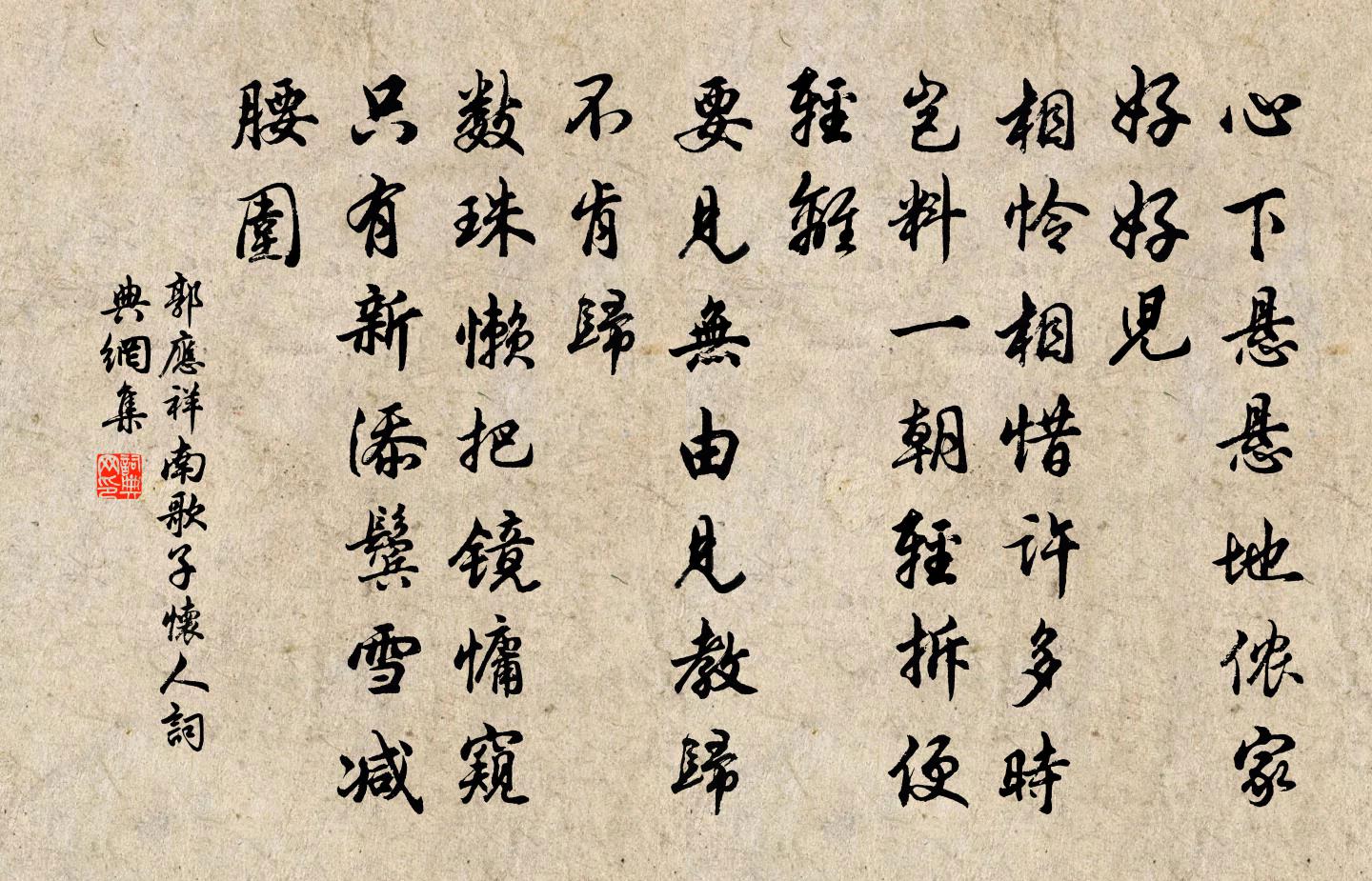 詩詞名句歷史字典書法欣賞書法字典國語詞典說文解字康熙字典古漢語字典標 題 作 者 詩 句 南歌子(懷人)作者:郭應祥 朝代:宋代南歌子(懷人)原文心下懸懸地,儂家好好兒。相憐相惜許多時。豈料一朝輕拆、便輕離。要見無由見,教歸不肯歸。數珠懶把鏡慵窺。只有新添鬢雪、減腰圍。詩詞問答問:南歌子(懷人)的作者是誰?答:郭應祥問:南歌子(懷人)寫於哪個朝代?答:宋代問:南歌子(懷人)是什麼體裁?答:詞郭應祥南歌子(懷人)書法欣賞南歌子(懷人)書法作品詩詞推薦湖上作貫休〔唐代〕我竟胡為者,嘮嘮但愛吟。身中多病在,湖上住年深。山溜穿苔壁,風鍾度雪林。近來心更苦,誰復是知音。聞衍孫恪得舉姜特立〔宋代〕慶事聯翩走四鄰,吾家門戶一番新。明年雙上青雲去,為汝山園作主人。和周仲嘉再示三篇王洋〔宋代〕長篇大軸勢如林,慰我窮愁正結陰。數首娛憂兼寓物,幾人對面便知心。多求筆吏供濡墨,乘買筠筒給浩吟。閒靜逸再為婺女之行既別出郭矣夜不能寐成六絕句趙蕃〔宋代〕去歲諸公祖敬之,我曾同席共委蛇。相逢儻復蒙相問,為道東歸鬢益絲。春日偶成王之道〔宋代〕餘生今赴邇英朝,似說夔龍許續貂。枯卉遂承新雨露,蒼鷹應識舊雲霄。廢興須信關時命,勞逸誰能問貫條。十載送昭遠兄歸陝司馬光〔宋代〕種種親頭白,帝城難少留。倚門應有望,列鼎本無求。清夜多歸夢,紅塵厭久游。此行殊捧檄,轅下五驊騮。送張明甫王安石〔宋代〕觥船一棹百分空,十五年前此會同。南去北來人自老,桃花依舊笑春風。正月十五日夜東林寺學禪偶懷藍田楊主簿因呈智禪師白居易〔唐代〕新年三五東林夕,星漢迢迢鍾梵遲。花縣當君行樂夜,松房是我坐禪時。忽看月滿還相憶,始嘆春來自不知。不覺初至廣平紀事言懷呈同事合使蘇頌〔宋代〕雙節同來朔漠邊,三冬行盡雪霜天,朝飧羶酪幾分飽,夜擁貂狐數鼓眠。光景不停如轉轂,歸心難遏似流煙。須將丙子重九二首蘇軾〔宋代〕三年瘴海上,越嶠真我家。登山作重九,蠻菊秋未花。唯有黃茅根,堆壠生坳窊。蜑酒櫱眾毒,酸甜如梨楂。何以寄遠曲趙汝鐩〔宋代〕君馬踏邊塵,繡帷妾一身。仰天無過雁,俯水無游鱗。酒難獨自酌,蟻樽空浮春。食亦不知味,駝峰徒薦珍。憶昔客有折秋香來桂隱者喜成七言呈以道張鎡〔宋代〕半紀移居野水旁,年年嘗為木樨忙。若非老樹從頭髮,安得西風徹骨香。數朵折來猶甚愛,滿林開後得無狂。今番舉葦航適安飲陳起〔宋代〕獻酬無算是杯行,午酌從容至四更。陶母侈於真率約,退思無倦若為情。頌古二首釋曇密〔宋代〕汲水僧歸林下寺,待船人立渡頭沙。澄江渺渺煙波窄,雲靜一天星斗斜。奉和御製暑中書懷徐鉉〔唐代〕浴殿晨開氣象新,虛亭金井轆轤鳴。陰成楊柳千絲密,冰入襟懷一扇輕。寒水乍沉朱李熟,薰綃長有好風生。高樓觀心釋文珦〔宋代〕坐石夜觀心,心明亡眾覆。一沼水涵秋,千山月如晝。題湘西廖次高水南真趣史彌寧〔宋代〕買他磐石作經鄰,誰道風煙不屬君。占斷好山猶可在,無端吞併一江雲。禪人並化主寫真求贊釋正覺〔宋代〕天庭寬而祖宗光,地閣闊而兒孫昌。中間鼻孔自家底,出氣通快渾不妨。坤六短,乾三長。飽叢林漢休雌黃,今年讀陳勝傳屈大均〔清代〕閭左稱雄日,漁陽適戍人。王候寧有種?竿木足亡秦。大義呼豪傑,先聲仗鬼神。驅除功第一,漢將可誰倫?題楊妃牙痛圖危稹〔宋代〕痛入香齦是不禁,三郎心痛亦何深。當時更有唇亡處,自是君王不動心。名句推薦疾風知勁草,板蕩識誠臣。李世民《賜蕭瑀》 君若清路塵,妾若濁水泥;曹植《明月上高樓》 秋空明月懸,光彩露沾濕。孟浩然《秋宵月下有懷》 假令風歇時下來,猶能簸卻滄溟水李白《上李邕》 鬢絲日日添白頭,榴錦年年照眼明;殷堯藩《端午日》 那堪好風景,獨上洛陽橋。李益《上洛橋》 東邊日出西邊雨,道是無晴卻有晴。劉禹錫《竹枝詞二首·其一》 倚竹不勝愁,暗想江頭歸路王之道《如夢令·一晌凝情無語》 浮雲遮月不分明,誰挽長江一洗放天青?董士錫《虞美人·韶華爭肯偎人住》 今日江頭兩三樹,可憐和葉度殘春。元稹《離思五首》