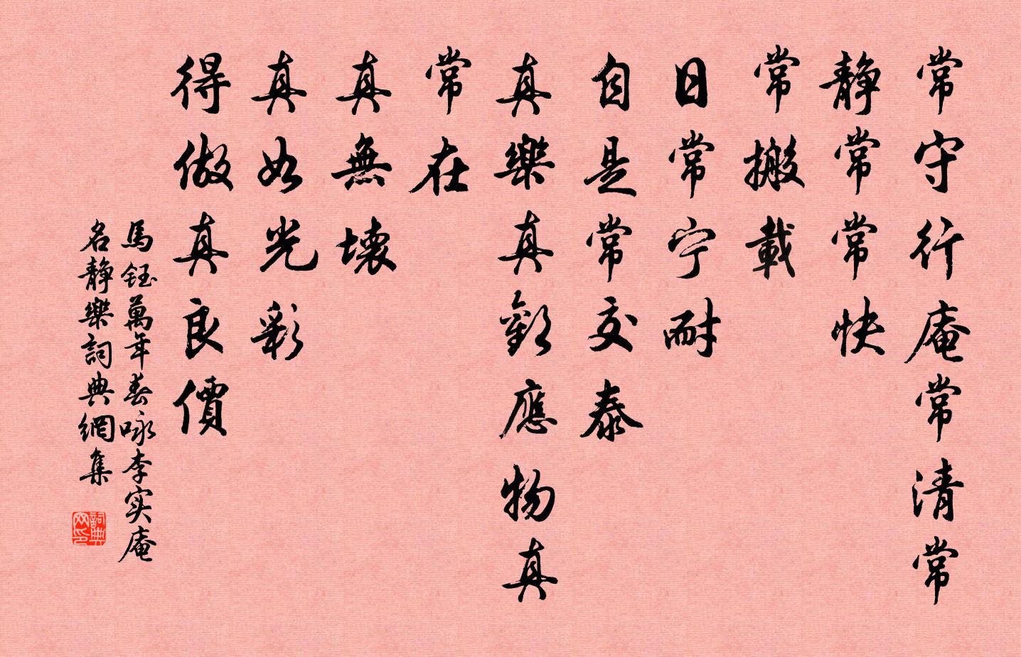 詩詞名句歷史字典書法欣賞書法字典國語詞典說文解字康熙字典古漢語字典標 題 作 者 詩 句 萬年春 詠李實庵名靜樂作者:馬鈺 朝代:元代萬年春 詠李實庵名靜樂原文常守行庵,常清常靜常常快。常搬載。日常寧耐。自是常交泰。真樂真歡,應物真常在。真無壞。真如光彩。得做真良價。詩詞問答問:萬年春 詠李實庵名靜樂的作者是誰?答:馬鈺問:萬年春 詠李實庵名靜樂寫於哪個朝代?答:元代問:萬年春 詠李實庵名靜樂是什麼體裁?答:詞馬鈺萬年春 詠李實庵名靜樂書法欣賞萬年春 詠李實庵名靜樂書法作品詩詞推薦雙桂詠陳陶〔唐代〕青冥結根易傾倒,沃洲山中雙樹好。琉璃宮殿無斧聲,石上蕭蕭伴僧老。攤破醜奴兒(冬日有感)趙長卿〔宋代〕又是兩分攜。憔悴損、看怎醫治。煙村一帶寒紅繞,悲風紅葉,殘陽暮草,還似年時。愁緒暗猶夷。謾屈指、數遍嘲丁大全林桂龍〔宋代〕移溪實壑誤明君,驚動沿江十十國。幸是不沈湘水死,有何面目見靈均。歌蜀酒閣道〔唐代〕尾閭不禁滄溟竭,九轉神丹都謾說。惟有班龍頂上珠,能補玉堂關下穴。石頭城任希夷〔宋代〕石頭只解著王蘇,漫說夷吾計亦疏。盡使西風能舉扇,可堪重見伯仁書。次韻酬王夢得西湖上見寄張鎡〔宋代〕一萼香紅未破塵,綠波驚眼自搖春。晴新策蹇湖邊去,供作他年畫裡人。蔡忠惠祀歌道邊松佚名〔宋代〕大義渡至漳泉東,問誰植之我蔡公。歲久廣蔭如雲濃,甘棠蔽芾安可同,委蛇夭矯騰蒼龍。行人六月不知暑,予昔作壺中九華詩其後八年復過湖口則石已為蘇軾〔宋代〕江邊陣馬走千峰,問訊方知冀北空。尤物已隨清夢斷,真形猶在畫圖中。歸來晚歲同元亮,卻掃何人伴敬通。賴有黃彥昭時思閣楊時〔宋代〕孤丘鎖千岑,層閣跨雲起。永懷霜露思,時未薦醪醴。欽宗貴收族,蟄蟄神亦喜。故令傲霜根,駢枝復連理。黃侯玉京軒黃庭堅〔宋代〕蒼山其下白玉京,五城十二樓,郁儀結鄰常杲杲。紫雲黃霧鏁玄關,雷驅不祥電揮掃。上有千年來歸之白鶴,下有池畔閒坐,兼呈侍中白居易〔唐代〕池畔最平處,樹陰新合時。移床解衣帶,坐任清風吹。舉棹鳥先覺,垂綸魚未知。前頭何所有,一卷晉公詩。鳳州柳曾極〔宋代〕蜀主函封遣使時,芳根元自鳳州移。柔荑醽醁今安在,唯有青絲拂地垂。浣溪沙毛滂〔宋代〕本是青門學灌園。生涯渾在亂山前。一犁春雨種瓜田。別後倩雲遮鶴帳,來時和月寄漁船。旁人莫做長官看。憶平泉雜詠憶茗芽李德裕〔唐代〕谷中春日暖,漸憶掇茶英。欲及清明火,能銷醉客酲。松花飄鼎泛,蘭氣入甌輕。飲罷閒無事,捫蘿溪上行。偈釋顯嵩〔宋代〕昨日羅剎心,今朝菩薩面。羅剎與菩薩,不隔一條線。罷劉岩酒庫姜特立〔宋代〕世事升沈侔蝶化,吾生來往更蠅營。歸心有愧陶元亮,家事當如尚子平。豈是木雞猶有變,故令鷗鳥尚相驚。老夫與王伯芻楊願〔宋代〕只今侍讀周夫子,屢說君詩似杜詩。速把冠塵盡彈卻,玉堂宵直伴王維。句鄭居中〔宋代〕自有薰風來解慍,更無箕舌巧為讒。贈歌人薛能〔唐代〕溫燠坐相侵,羅襦一水沉。拜深知有意,令背不無心。近住應名玉,前生約姓陰。東山期已定,相許便抽簪。偈頌四十一首釋普寧〔宋代〕一夏九十日,不覺已過半。管帶牯牛兒,切忌隨物轉。緊把鼻頭索,莫放令寬緩。如是十二時,時時無間斷。收得名句推薦所謂伊人,在水一方。佚名《蒹葭》 鳥去鳥來山色里,人歌人哭水聲中。杜牧《題宣州開元寺水閣閣下宛溪夾溪居人》 有情不管別離久。情在相逢終有。晏幾道《秋蕊香·池苑清陰欲就》 生而不有,為而不恃,功成而弗居。夫唯弗居,是以不去。老子《老子·道經·第二章》 邯鄲驛里逢冬至,抱膝燈前影伴身。白居易《邯鄲冬至夜思家》 強本而節用,則天不能貧。荀子《荀子·天論》 一苗露水一苗草,一朝天子一朝臣。佚名《增廣賢文·下集》 它山之石,可以攻玉。佚名《鶴鳴》 只言啼鳥堪求侶,無那春風欲送行。高適《夜別韋司士》 只應守寂寞,還掩故園扉。孟浩然《留別王侍御維 / 留別王維》