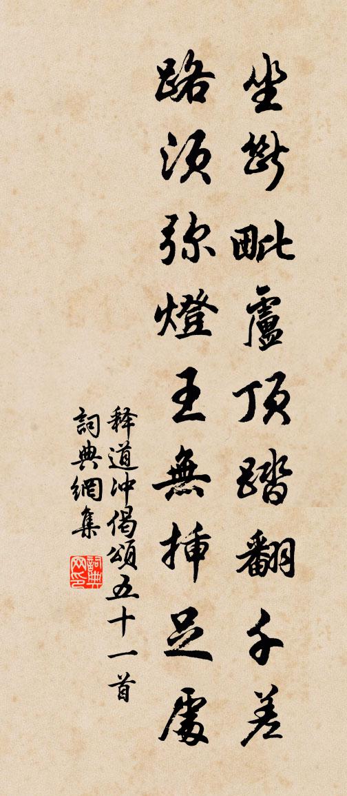 詩詞名句歷史字典書法欣賞書法字典國語詞典說文解字康熙字典古漢語字典標 題 作 者 詩 句 偈頌五十一首作者:釋道沖 朝代:宋代偈頌五十一首原文坐斷毗盧頂,踏翻千差路。須彌燈王,無插足處。詩詞問答問:偈頌五十一首的作者是誰?答:釋道沖問:偈頌五十一首寫於哪個朝代?答:宋代釋道沖偈頌五十一首書法欣賞偈頌五十一首書法作品詩詞推薦暉仲惠梅花數枝韓元吉〔宋代〕莫問南枝與北枝,幽香先與小春期。直從的皪寒梢數,看到飄零似雪時。過野翁亭因登岝崿山憩崇壽院僧軒共成四絕句張鎡〔宋代〕岩隈蕭寺得躋攀,數翠邀嵐不復難。已向城中專一壑,更須隨處款青山。三月三日適值清明會客江樓共觀並蒂魏紫偶成周必大〔宋代〕修禊歸來卻踏青,臨流謀野兩關情。不如省事遊春女,挑菜渚邊看水生。效古興施肩吾〔唐代〕金雀無舊釵,緗綺無舊裾。唯有一寸心,長貯萬里夫。南軒夜蟲織已促,北牖飛蛾繞殘燭。只言眾口鑠千金,誰信老病相仍以詩自解白居易〔唐代〕榮枯憂喜與彭殤,都似人間戲一場。蟲臂鼠肝猶不怪,雞膚鶴髮復何傷。昨因風發甘長往,今遇陽和又小康。[春一斛珠(十一月十日知郡宴吳府判坐中賦海棠)王質〔宋代〕風流太守。未春先試回春手。天寒修竹斜陽後。翠袖中間,忽有人紅袖。天香國色濃如酒。且教青女休﹀︽。梅花句劉卓〔宋代〕傍人未必知心事。書齋壁陸游〔宋代〕落魄人間不記年,晚營茆棟鏡湖邊。室空惟是四壁立,面瘦漸生雙頰顴。地僻門無殘客到,歲豐路有醉人眠。君看偈頌五首釋印肅〔宋代〕應目未嘗離左右,扣宗差別風馬牛。遲速不停俱滯學,個裹還須自肯休。游黃龍寺趙瑞〔宋代〕一到黃龍萬慮灰,豪吟勝賞喜追陪。幽蘭獨秀花香襲,宿雨初收霧氣開。湛湛冰池藏世界,悠悠梵唄隔塵埃。清風謂柔立兄方翥〔宋代〕雞犬還家自識村,重營生理長兒孫。時平戰地逢華屋,歲久他鄉是故園。別後塵埃如我老,歸來耆舊幾人存。雁行觀四種梅曾幾〔宋代〕斬新梅蕊破東風,一樹鵝黃一樹紅。不著鉛華元自好,未妨時世略相同。過富池水軍寨統轄姚子雄公廨略棲遲且有約同董嗣杲〔宋代〕春雲冷壓渡頭槎,春色晴翻浦際沙。並浴鵁鶄依水柳,成圍蝴蝶舞江花。富池軍額無全籍,治邑農功有幾家。指日道傍得熟人家曹彥約〔宋代〕舊雨留煙飾短垣,淺沙催水撼衡門。旗簾動眼新迎客,{禾罷}稏關心故弄孫。蝶戀花毛並〔宋代〕羅襪匆匆曾一遇。烏鵲歸來,怨感流年度。別袖空看啼粉污。相思待倩誰分付。殘雪江村回馬路。裊裊春寒,簾晚臨江仙蔡伸〔宋代〕繁杏枝頭蜂蝶亂,香風闔坐微聞。靚妝濃艷任東君。無情風雨,春事已平分。珍重主人留客意,夜闌秉燭開尊。何飛仙嶺張先〔宋代〕路接曉天人近月,真仙去後祇雲歸。嶺頭舊曰上升日,空有山禽自在飛。學易齋五邁〔宋代〕太極分陽陽,生生之謂易。易有乾之元,生意露沙息。先生易中行,日用而飲食。全體純是仁,本自玄中得。克己冬晴三首趙蕃〔宋代〕冰雪四十日,朝光開曉霜。短褐忘藍縷,茅檐失荒涼。緬思江南梅,安得置汝傍。明朝儻更晴,一葦柳可杭。吳淞江蔣堂〔宋代〕江人見我謂誰何,行李無羈野意多。六幅青帆趁潮去,一樽白酒扣舷歌。沙邊歷歷辨雲樹,島外濺濺弄月波。興盡名句推薦誰教歲歲紅蓮夜,兩處沉吟各自知。姜夔《鷓鴣天·元夕有所夢》 雷填填兮雨冥冥,猿啾啾兮狖夜鳴;屈原《九歌》 閨中少婦不知愁,春日凝妝上翠樓。王昌齡《閨怨》 借得山東煙水寨,來買鳳城春色施耐庵《念奴嬌·天南地北》 草秀故春色,梅艷昔年妝。李世民《元日》 故人入我夢,明我長相憶。杜甫《夢李白二首·其一》 夜聞歸雁生鄉思,病入新年感物華。歐陽修《戲答元珍》 午醉未醒紅日晚,黃昏簾幕無人卷。蘇軾《蝶戀花·蝶懶鶯慵春過半》 共敵不如分敵,敵陽不如敵陰。佚名《三十六計·圍魏救趙》 臨下以簡,御眾以寬;罰弗及嗣,賞延於世。佚名《尚書·虞書·大禹謨》