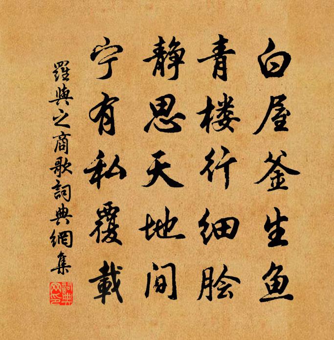 詩詞名句歷史字典書法欣賞書法字典國語詞典說文解字康熙字典古漢語字典標 題 作 者 詩 句 商歌作者:羅與之 朝代:宋代商歌原文白屋釜生魚,青樓行細膾。靜思天地間,寧有私覆載。詩詞問答問:商歌的作者是誰?答:羅與之問:商歌寫於哪個朝代?答:宋代問:商歌是什麼體裁?答:樂府羅與之商歌書法欣賞商歌書法作品詩詞推薦謝高機宜惠紙陳造〔宋代〕詩人百用皆草草,文房所儲備精好。君家此紙世上珍,肯分嘉惠及此老。女膚膩滑葭膜勻,溪叟搗冰舊疑神。何人煉丹砂 詠玄牝示眾李道純〔元代〕玄牝少人通。說與諸公。休言南北與西東。不在四維並上下,不在當中。闔*妙無窮。天地根宗。生生化化運神功秋思贈遠二首王涯〔唐代〕當年只自守空帷,夢裡關山覺別離。不見鄉書傳雁足,唯看新月吐蛾眉。厭攀楊柳臨清閣,閒采芙蕖傍碧潭。走馬偶侍郡侯游群玉浪吟二絕聊記歲月時淳佑乙巳趙與泳〔宋代〕玲瓏奇石繞林間,屈曲高低未易攀。非斧非斤誰運巧,偏來琢就此蓬山。洞仙歌 述懷王丹桂〔元代〕道家門戶,寂淡清虛好。榮耀矜誇自無擾。向午窗、披玩道德南華,除此外,閒弄絲桐一操。秋光未老。錦樹屏山郊廟歌辭。享太廟樂章。升和佚名〔唐代〕顧惟菲薄,纂歷應期。中外同軌,夷狄來思。樂用崇德,禮以陳詞。夕惕若厲,欽奉弘基。二毀陸游〔宋代〕茶杯得之久,石硯日在前,一朝忽墜地,質毀不復全。附著以膠漆,入用更可憐。杯猶奉飲啜,硯不廢磨研。向使奉和李相公題蕭家林亭(逢吉也)韓愈〔唐代〕山公自是林園主,嘆惜前賢造作時。岩洞幽深門盡鎖,不因丞相幾人知。瑞光亭丘葵〔宋代〕昔聞石幢寺,今見瑞光亭。一水東南碧,四榕冬夏青。往來多俗子,老病抱遺經。親冢招提北,回頭涕泗零。題晝寂軒徐壽仁〔宋代〕輕雲扶曲檻,少坐覺幽深。泛酒誰同話,敲詩獨寫心。竹聲流草榻,鳥語惹花陰。門外呼童掃,客彈月下琴。雪後寄崔二十六丞公韓愈〔唐代〕藍田十月雪塞關,我興南望愁群山。攢天嵬嵬凍相映,君乃寄命於其間。秩卑俸薄食口眾,豈有酒食開容顏。殿前寓壺源僧舍三絕吳儆〔宋代〕歸來閉戶還高枕,窗隙微通月影斜。風急忽驚烏鵲起,空階蔌蔌墮松花。以詩句詠梅要嘗雪月並明時方蒙仲〔宋代〕雪月是花非,但覺夜成旦。世事忌分明,朦朧差好看。題李德邵櫱庵仲並〔宋代〕懷抱如公政自嘉,衡門那復念京華。壯年底事已將老,作戲逢場新有家。此去車書應萬里,似聞廓廟屏群邪。時平蝶戀花葛長庚〔宋代〕樓上風光都占斷。樓下風光,還許詩人管。管領風光誰是伴。一堤楊柳開青眼。波面琉璃花影亂。玉筍持杯,畫舸松原山行七絕趙蕃〔宋代〕烏噪猿號古樹叢,亂青參倚更撐空。悠然到處皆詩本,須信山行不負公。散花樓張祜〔唐代〕錦江城外錦城頭,回望秦川上軫憂。正值血魂來夢裡,杜鵑聲在散花樓。次韻和正仲種菜種麥二首舒岳祥〔宋代〕賸欲栽蔬抵食魚,蠹繁骨立謾長吁。畦丁傴背揮叢篲,雞母將鶵啄淺蕪。菜字元修須雨長,菁名諸葛待霜腴。閉門招詩佚名〔先秦〕畜君何尤。張統制之子為父求詩蘄州城破匹馬打圍而出能戴復古〔宋代〕夜半金城破,身隨鐵馬飛。橫揮三尺劍,突出萬人圍。勇銳資神力,功名與願違。自能占氣數,終老著農衣。名句推薦終古閒情歸落照,一春幽夢逐遊絲。納蘭性德《浣溪沙·楊柳千條送馬蹄》 魯女東窗下,海榴世所稀。李白《詠鄰女東窗海石榴》 投我以桃,報之以李。佚名《抑》 思婦高樓上,當窗應未眠。徐陵《關山月》 遙看孟津河,楊柳郁婆娑。佚名《折楊柳歌辭五首》 忽見陌頭楊柳色,悔教夫婿覓封侯。王昌齡《閨怨》 和氣吹綠野,梅雨灑芳田。李世民《詠雨》 憶共人人睡魂蝶亂,夢鸞孤。趙長卿《更漏子·燭消紅》 孤鴻號外野,翔鳥鳴北林。阮籍《詠懷八十二首·其一》 天容水色西湖好,雲物俱鮮。歐陽修《採桑子·天容水色西湖好》