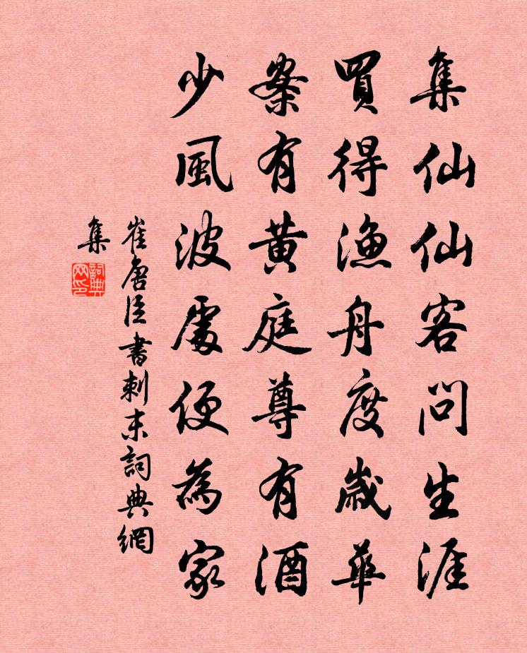 詩詞名句歷史字典書法欣賞書法字典國語詞典說文解字康熙字典古漢語字典標 題 作 者 詩 句 書刺末作者:崔唐臣 朝代:宋代書刺末原文集仙仙客問生涯,買得漁舟度歲華。案有黃庭尊有酒,少風波處便為家。詩詞問答問:書刺末的作者是誰?答:崔唐臣問:書刺末寫於哪個朝代?答:宋代崔唐臣書刺末書法欣賞書刺末書法作品詩詞推薦水調歌(題弩社頭籌簇)程節齋〔宋代〕都尉部千弩,舊事漢材官。連拳一臂三石,夜半破陰山。曾使中有捫足,造次摧堅挫銳,分白辱寵涓。省括一機耳讀陳蕃傳陸游〔宋代〕莫笑書生一卷書,唐虞事業正關渠。漢廷若有真王佐,天下何須費掃除。台城路/齊天樂張炎〔宋代〕清時樂事中園賦,怡情楚花湘草。秀色通簾,生香聚酒,修景常留池沼。閒居自好。奈車馬喧塵,未教閒了。把菊題王居士所藏王友畫桃杏花二首黃庭堅〔宋代〕凌雲見桃萬事無,我見杏花心亦如。從此華山圖籍上,更添潘閬倒騎驢。南柯子侯善淵〔元代〕煉質心猿退,焚真意馬疏。一靈圓覺頓真如。洞達淵玄,光鑒照元初。坎虎形如玉,離龍色似珠。雲奔電激貫虛無沁園春廖行之〔宋代〕直下承當,本來能解,莫遣乾休。算如今蹉過,崢嶸歲月,分陰可惜,一日三秋。鬧里偷聲,日中逃影,用盡機關雨師雷神七首佚名〔宋代〕霈兮隱兮,蹶其險威。相我有終,胡寧不知。我幣有陳,我邸斯珪。豈維有陳,於以奠之。題圖贈何炌唐寅〔明代〕青雲台殿泉聲隔,黃葉關河雁影來。別有詩人好懷抱,西風雙鬢一登台。詠史詩荊山胡曾〔唐代〕抱玉岩前桂葉稠,碧谿寒水至今流。空山落日猿聲叫,疑是荊人哭未休。贈觀妙道士釋道璨〔宋代〕妙處不可觀,可觀非是妙。杳杳無方所,冥冥無朕兆。我觀三十年,力盡不能透。及其會心時,忻然惟一笑。碧桃夏日遣懷俞桂〔宋代〕老大今無用,吟詩了白頭。百年如電景,萬事付沙鷗。性淡偏宜靜,居貧動是愁。人情難似舊,門外水長流。頌古二十一首釋正覺〔宋代〕即日貴人,舊家貧漢。兄弟相承,尊卑互換。向晚途中眼不開,夜明簾外機旋轉。騎牛載帽異中來,百鍊真金色不官舍阻雨十日湧出悶成五絕呈徐判部劉過〔宋代〕世間別有人才在,台閣招徠恐未多。半老江湖半岩穴,為公一賦草廬歌。舉季申信道自光化復入鄧書事四首陳與義〔宋代〕城西望城南,十日九相隔。何如三枝杖,共踏江上石。門前流水過,春意滿渠碧。遙知千頃江,如今好顏色。白石潭秋霽作周繇〔唐代〕潭心煙霧破斜暉,殷殷雷聲隔翠微。崖蹙盤渦翻蜃窟,灘吹白石上漁磯。陵風舴艋謳啞去,出水鸕鶿薄泊飛。秋霽立春帖子太上皇帝閣周必大〔宋代〕聚景園林花萬重,外家車騎極雍容。應譏漢戚多驕恣,馬後徒勞戒濯龍。寄陳同甫生日陳傅良〔宋代〕南國雨初潤,西風水微波。持酒欲勸君,奈此道阻何。天地自久長,日月良蹉跎。志士惜少年,用意矢靡他。豈無落第後贈同居友人顧非熊〔唐代〕有情天地內,多感是詩人。見月長憐夜,看花又惜春。愁為終日客,閒過少年身。寂寞正相對,笙歌滿四鄰。紹興祀大火十二首佚名〔宋代〕誰其祀神,知神嗜好。閈伯祀火,為神所勞。睠言配食,既興火俱。于樂旨酒,承神嘉虔。寄審知趙蕃〔宋代〕楓赤蘆花白,扁舟夜泊時。平生故人夢,細雨說相思。名句推薦惡之者眾則危。荀子《荀子·正論》 名無固實,約之以命實,約定俗成,謂之實名。荀子《荀子·正名》 與人善言,暖於布帛;傷人之言,深於矛戟。荀子《荀子·榮辱》 吃不了兜著走曹雪芹《紅樓夢·第二十三回》 夫天地者,萬物之逆旅也;光陰者,百代之過客也。李白《春夜宴桃李園序 / 春夜宴從弟桃花園序》 凡是人,皆須愛。天同覆,地同載。李毓秀《弟子規·泛愛眾》 君自故鄉來,應知故鄉事。王維《雜詩三首·其二》 朝作輕寒暮作陰,愁中不覺已春深。屈大均《壬戌清明作》 還始覺、留情緣眼,寬頻因春。吳文英《渡江雲三犯·西湖清明》 蛛絲暗鎖紅樓,燕子穿簾處。吳文英《荔枝香近·七夕》