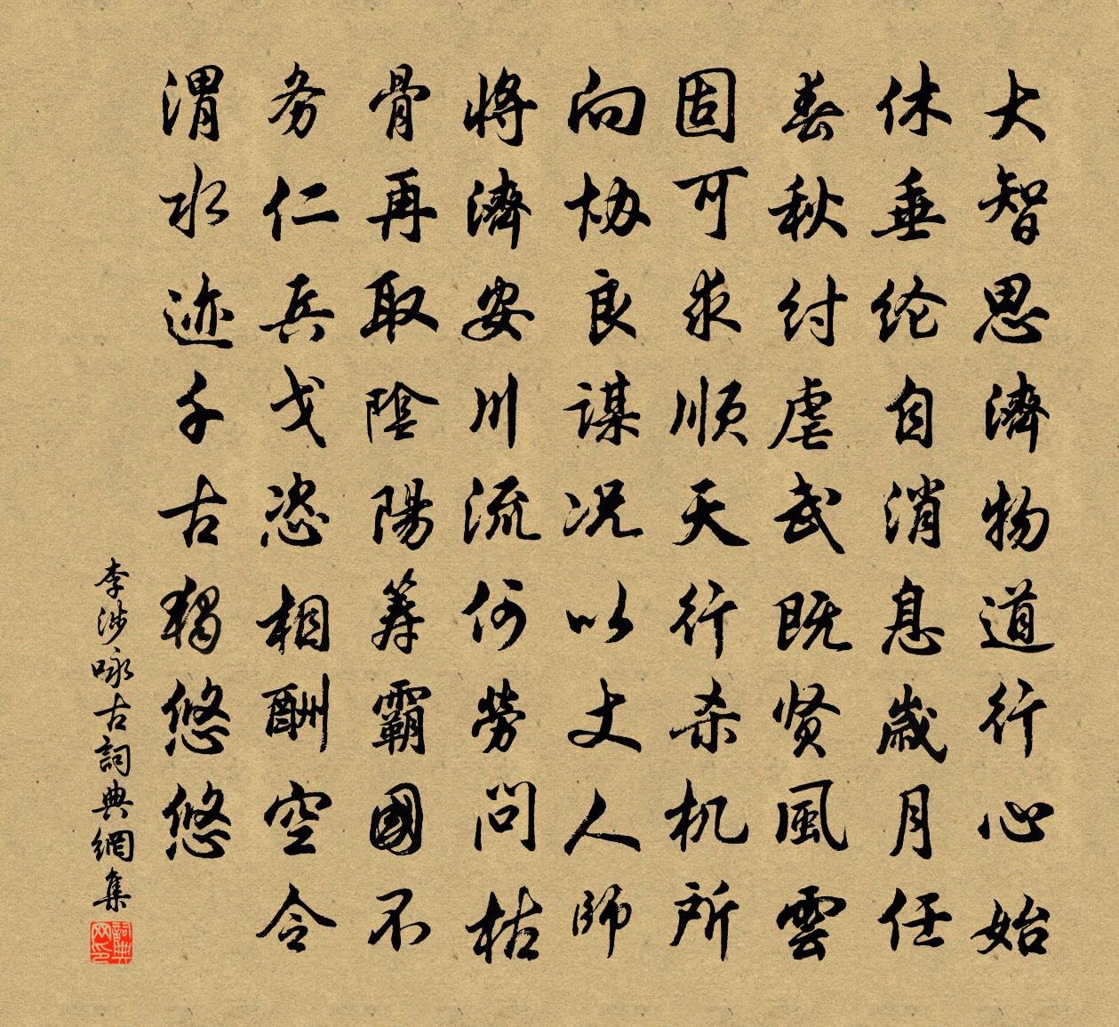 詩詞名句歷史字典書法欣賞書法字典國語詞典說文解字康熙字典古漢語字典標 題 作 者 詩 句 詠古作者:李涉 朝代:唐代詠古原文大智思濟物,道行心始休。垂綸自訊息,歲月任春秋。紂虐武既賢,風雲固可求。順天行殺機,所向協良謀。況以丈人師,將濟安川流。何勞問枯骨,再取陰陽籌。霸國不務仁,兵戈恣相酬。空令渭水跡,千古獨悠悠。詩詞問答問:詠古的作者是誰?答:李涉問:詠古寫於哪個朝代?答:唐代問:詠古是什麼體裁?答:五古李涉詠古書法欣賞詠古書法作品注釋全唐詩:卷477-2詩詞推薦仁宗皇帝輓詩十首文同〔宋代〕披袞才憑几,躋階忽受同。哀文鋪帝業,謚冊講仁功。竭蹷趨群後,號咷動兩宮。銘旌來鞏洛,萬里卷悲風。紹隆寺沈佺期〔唐代〕吾從釋迦久,無上師涅槃。探道三十載,得道天南端。非勝適殊方,起喧歸理難。放棄乃良緣,世慮不曾乾。香界和顏長官百詠邊庭朱繼芳〔宋代〕公主琵琶胡地秋,將軍刁斗漢關愁。相逢老病無依卒,未說沙場淚已流。墨君十詠雪梢王銍〔宋代〕第五橋邊一徑遙,滿林野竹立江郊。鴛鴦浮破水涵影,翡翠壓斜風舞梢。聽雁有感潘璵〔宋代〕怕聽雲間雁,新愁上客眉。尖風欺破褐,落日迫殘棋。菊花休賒酒,梅開又費詩。鴒原千里隔,誰與話心期。句張一齋〔宋代〕忘即蘆花業里宿,起來誤作雪天吟。陪范明府與諸同官飲新亭是夕以莞爾榜之因賦林亦之〔宋代〕把燭新亭下,迂疎聊爾歌。酒緣人品勝,官要野情多。燕豆客俱好,漁竿人亦過。誰知武城笑,深自惜蹉跎。除夕方岳〔宋代〕生菜春盤草八珍,燈前殊未覺家貧。幾從荼壘中間事,第一屠蘇最後人。衰病不圖今夕健,須臾又是隔年春。東風草釋智圓〔宋代〕淺碧與深綠,萋萋古岸傍。旅愁生暮色,吟思發清光。過雨侵閒徑,披煙上壞牆。更堪思往事,金谷舊年荒。天宮小閣邵雍〔宋代〕夏日到天宮,憑欄望莫窮。古人用心遠,天子建都雄。樓觀深雲里,山川暮靄中,行人漫來往,此意有誰同。呈李續韓弇〔唐代〕我有敵國讎,無人可為雪。每至秦隴頭,遊魂自嗚咽。讀福建謙廉訪輔大使遺事戴表元〔宋代〕臬官難稱是閩中,遺愛堂堂得比公。姓字丹青太史筆,歲時籩豆素王宮,一生薑桂那時辣,百死江湖必向東。從古光宅寺王安石〔宋代〕翛然光宅淮之陰,扶輿獨來止中林。千秋鍾梵已變響,十畝桑竹空成陰。昔人倨堂有妙理,高座翳繞天花深。紅葵木蘭花晏幾道〔宋代〕小蓮未解論心素,狂似鈿箏弦底柱。臉邊霞散酒初醒,眉上月殘人慾去。舊時家近章台住,盡日東風吹柳絮。生憎勤王第五十三文天祥〔宋代〕出師亘長雲,盡驅詣闕下。首唱恢大義,垂之俟來者。司馬相如琴台岑參〔唐代〕相如琴台古,人去台亦空。台上寒蕭條,至今多悲風。荒台漢時月,色與舊時同。嘲柳花劉克莊〔宋代〕吹去飛來似有情,禁菸時節遍春城。比氈鋪徑何其窶,擬雪因風得許清。閱武活殘兒命薄,章台走倦尹才輕。滿池和答劉習之見贈王文孫〔宋代〕先天奧學果何傅,造化機緘存闔闢。精微惝恍入神范,天地謂可俄而測。奧從二畫抉秘蘊,乾元庶物因首出。陽推和林丘二君會程坦之家二詩蘇頌〔宋代〕春晚寒不已,節候差季孟。木行怯初陽,水官恣餘橫。滂沱連月雨,愁嘆斯民病。已紊四時和,更傷群物性。園花漁父趙汝回〔宋代〕衡岳早來雨,湘江增綠波。小舟浮似屋,香草結為蓑。水定見魚影,夜清聞櫂歌。悠悠百年夢,醒少醉時多。名句推薦善者不辯,辯者不善。老子《老子·德經·第八十一章》 貧者士之常也,死者人之終也,處常得終,當何憂哉?列子及其弟子《列子·天瑞》 亭皋木葉下。隴首秋雲飛。柳惲《搗衣詩》 江畔何人初見月?江月何年初照人?張若虛《春江花月夜》 民為貴,社稷次之,君為輕。孟子《孟子·盡心章句下·第十四節》 東風楊柳欲青青。煙淡雨初晴。晏殊《訴衷情·東風楊柳欲青青》 佇立傷神。無奈輕寒著摸人。朱淑真《減字木蘭花·春怨》 甘受人欺,定非懦弱;自謂予智,終是糊塗。王永彬《圍爐夜話·第一二五則》 人家見生男女好,不知男女催人老。王建《短歌行》 昨日入城市,歸來淚滿巾。張俞《蠶婦》