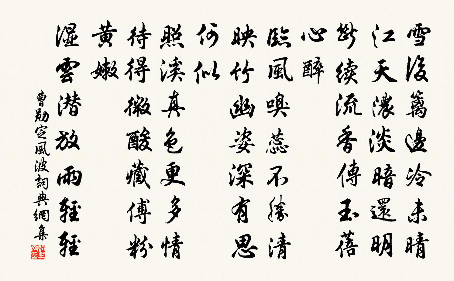 詩詞名句歷史字典書法欣賞書法字典國語詞典說文解字康熙字典古漢語字典標 題 作 者 詩 句 定風波作者:曹勛 朝代:宋代定風波原文雪後籬邊冷未晴。江天濃淡暗還明。斷續流香傳玉蓓。心醉。臨風嗅蕊不勝清。映竹幽姿深有思。何似。照溪真色更多情。待得微酸藏傅粉。黃嫩。濕雲潛放雨輕輕。詩詞問答問:定風波的作者是誰?答:曹勛問:定風波寫於哪個朝代?答:宋代問:定風波是什麼體裁?答:詞曹勛定風波書法欣賞定風波書法作品詩詞推薦禪人寫真求贊釋正覺〔宋代〕器宇潭潭,風骨岩岩。雲夢之氣吞 * ,嵩少之道落二三。守一爻生成之機紐,秉諸祖烹鍛之鎚鉗。捏聚放行也肖春日雜興陸游〔宋代〕乍晴乍雨忽經旬,半醉半醒還過春。春臥不知庵外事,閒吟聊適夢中身。雨後閒步丘葵〔宋代〕洗天風雨過,炎暑漠然收。偶爾掩門去,因之入寺游。農畦瓜蔓長,僧圃貝花稠。自笑生涯拙,空餘一髻秋。依韻酬智謙上人見寄李中〔唐代〕性拙才非逸,同心友亦稀。風昏秋病眼,霜濕夜吟衣。鶯谷期猶負,蘭陔養不違。吾師惠佳句,勝得楚金歸。岳之婦人多以白練蒙首俗傳馬伏波征蠻死於岳袁說友〔宋代〕將軍久已歸黃壤,江婦如何未黑頭。若使將軍知此意,素縑蒙首也應休。金蓮出玉花 繼酒同監韻聯珠馬鈺〔元代〕心數歲。久休心成妙最。好心磨。琢心開疾似梭。飛玉性。上無瑕真自淨。有何愁。惱吾官心不休。題義約方岳〔宋代〕向來祁山赭如天,邇來祁山翠如碧。祁山草木皆精神,祁山人材方氣魄。君不見癸丑諸賢奉親策,武成殿前天咫尺己卯夏憂雨偶作杜范〔宋代〕昨者憂不足,今者厭有餘。垂垂匝曉夕,灩灩平澮渠。苗事方用壯,過潦非所虞。但慮盈與虧,理或相乘除。它日句釋曉瑩〔宋代〕未厭長為客。觀音泉徐集孫〔宋代〕岩石留雲裛翠煙,古松知歷幾千年。淨瓶一滴楊枝水,涌作岩前大士泉。三用韻奉酬楊公遠〔宋代〕今日韶光滿九旬,浮生又了一年春。莫言虛度渾無補,學得先生句法新。生日吟邵雍〔宋代〕三萬五千日,伊予享此身。當時才作物,此際始為人。久負陰陽力,終虧父母恩。一杯為壽酒,床下列兒孫。巢陸游〔宋代〕昏昏霧雨暗衡茅,兒女隨宜治酒殽。便覺此身如在蜀,一盤籠餅是豌巢。高宗郊祀前廟朝享太廟三十首真宗〔宋代〕天命有開,維仁是依。迺睠冀邦,於以顧之。其顧伊何,發祥筆基。施於孫子,虔奉孝思。安晚偶成鄭清之〔宋代〕五物中間著一翁,園廛隨分可支筇。章施采服花妝露,戛擊鳴球竹嘯風。疏種密栽觀木漸,淺流深浚養泉蒙。眼前宮詞宋白〔宋代〕春賜千官宴喜錢,任從行樂太平年。三十六所 * 館,一一香風送管弦。李樹宋祁〔宋代〕曾見繁英出縹牆,更將朱實奉華堂。蹊桃得地偏相映,莫損清陰欲代僵。御街行(燈夕戲成)佚名〔宋代〕良宵無意貪遊玩。奈鄰友、閒呼喚。六街非是少人行,不似舊時風範。笙歌零落,綺羅銷減,枉了心情看。思量往河瀆神溫庭筠〔唐代〕銅鼓賽神來,滿庭幡蓋徘徊。水村江浦過風雷,楚山如畫煙開。離別櫓聲空蕭索,玉容惆悵妝薄。青麥燕飛落落,絕句陳與義〔宋代〕野鴨飛無數,桃花濕滿枝。竹輿鳴細雨,山客有新詩。名句推薦羅襟濕未乾,又是淒涼雪。張淑芳《滿路花·冬》 始於文而卒於武,天地之道也。佚名《黃帝四經·經法·論約》 懷君屬秋夜,散步詠涼天。韋應物《秋夜寄邱員外 / 秋夜寄丘二十二員外》 開軒面場圃,把酒話桑麻。孟浩然《過故人莊》 誰家玉笛暗飛聲,散入春風滿洛城。李白《春夜洛城聞笛 / 春夜洛陽城聞笛》 憶昔西池池上飲,年年多少歡娛。晁沖之《臨江仙·憶昔西池池上飲》 苦雨思白日,浮云何由卷。李白《玉真公主別館苦雨贈衛尉張卿二首》 飛來山上千尋塔,聞說雞鳴見日升。王安石《登飛來峰》 行人悵望王孫去,買斷金釵十二愁。俞紫芝《詠草》 長風萬里送秋雁,對此可以酣高樓。李白《宣州謝朓樓餞別校書叔雲 / 陪侍御叔華登樓歌》
