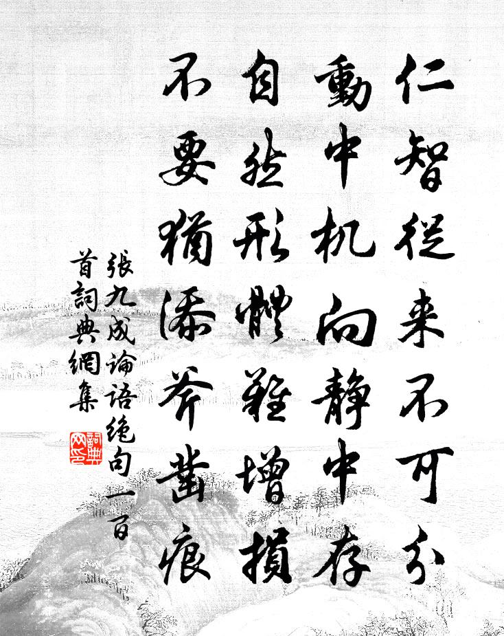 詩詞名句歷史字典書法欣賞書法字典國語詞典說文解字康熙字典古漢語字典標 題 作 者 詩 句 論語絕句一百首作者:張九成 朝代:宋代論語絕句一百首原文仁智從來不可分,動中機向靜中存。自然形體難增損,不要猶添斧鑿痕。詩詞問答問:論語絕句一百首的作者是誰?答:張九成問:論語絕句一百首寫於哪個朝代?答:宋代張九成論語絕句一百首書法欣賞論語絕句一百首書法作品詩詞推薦東亭蘇軾〔宋代〕仙山佛國本同歸,世路玄關兩背馳。到處不妨閒卜築,流年自可數期頤。遙知小檻臨廛市,定有新松長棘茨。誰道戲效屏山書齋十詠劉克莊〔宋代〕輕薄如蟬翼,擇兮風未休。煩勞汝威重,鎮壓彼輕浮。壽李雁湖吳泳〔宋代〕洶洶風濤卒未清,便提小隊按行營。一言刑省朝歌盜。單騎恩懷渤海兵。豐德自應通綠籍,長年何必飯黃精。勸公滿庭芳佚名〔宋代〕盡說煙消,皆言火滅,觸來總是無明。不知不覺,怎得離眾生。道本易行易曉,奈心迷、難曉難行。心魔障,未成秋日游合江戲題之亭上郭思〔宋代〕秋風錦水樂無涯,獨上亭軒四望嘉。橘子滿林金作塊,蘆梢拂岸雪飛花。酒旗高掛芙蓉港,漁棹斜趨菡萏家。描入蝶戀花(懷舊)俞克成〔宋代〕夢斷池塘驚乍曉。百舌無端,故作枝頭鬧。報導不禁寒料峭。未教舒展閒花草。盡日簾垂人不到。老去情疏,底事六年舉無字一日聞齊鼓有省釋慧開〔宋代〕 * 一聲雷,大地群生眼豁開。萬象森羅齊稽首,須彌{左足右孛}跳舞三台。答和呂侍讀歐陽修〔宋代〕昔日題輿媿屈賢,今來還見擁朱轓。笑談二紀思如昨,名望三朝老更尊。野徑冷香 * 秀,平湖斜照白鷗翻。此中潁上得鯉魚為膾懷餘姚謝師厚梅堯臣〔宋代〕青蓑潭上老,赬尾網中魚。買作秋盤膾,還思遠客書。越齏橙熟久,楚飯稻舂初。雖去故鄉遠,不嫌為饌疏。雜詩絕句十七首梅堯臣〔宋代〕燕立茅屋脊,燕銜芹岸泥。巢成同養子,薄暮亦同棲。眉州披風榭拜東坡先生遺像陸游〔宋代〕萬里橋邊白版扉,三年高臥謝塵鞿。半窗竹影棋僧去,滿棹苹風釣伴歸。看鏡已添新雪鬢,聽雞重拂舊朝衣。故人吊李羣玉周朴〔唐代〕羣玉詩名冠李唐,投詩換得校書郎。吟魂醉魄知何處,空有幽蘭隔岸香。送楊德潤赴禮部試王之道〔宋代〕雨意止還作,天容寒未舒。無聊懷劇論,何幸過窮居。舉白夜釃酒,剪黃朝薦蔬。新詩閒鼓吹,舊隱亂丘墟。軒冕重九前一日宿靈岩林季仲〔宋代〕馬上衰頹只自嗟,驚心那復見黃花。花如相問終羞澁,底甚重陽不在家。和權載之離合詩潘孟陽〔唐代〕詠歌有離合,永夜觀酬答。笥中操彩箋,竹簡何足編。意深俱妙絕,心契交情結。計彼官接聯,言初並清切。翔集琴調相思引趙彥端〔宋代〕曾躡姑蘇城上台。好山知有好人來。幾回徙倚,月里暮雲開。閒倚和風千步柳,倦臨殘雪一枝梅。暖香高燭,翻動偈頌七十六首釋師範〔宋代〕徑山今日結夏,不分上中下座。健則運瓦搬椽,因則橫眠倒臥。誰管你孔夫子李老君胡達磨,善賈者不停死貨。春晚五首曹勛〔宋代〕春過花飛不可尋,空餘新葉翠光深。爐香裊裊軒窗靜,時有珍禽囀好音。送馬廷評知康州梅堯臣〔宋代〕南去晉康郡,風帆幾千里。辭家上洞庭,落葉過湘水。瀧吏迎使君,壺漿出蠻壘。問俗言未通,觀風想先喜。曾非暑雨袁說友〔宋代〕獵獵蒲欹岸,斑斑蘚漬牆。檐低泣蛛網,葉落濺蜂房。西嶂暮凝色,北窗新送涼。晚來池上過,風擘藕花香。名句推薦但東望、故人翹首。戴復古《賀新郎·寄豐真州》 竹柏皆凍死,況彼無衣民。白居易《村居苦寒》 樹荊棘得刺,樹桃李得蔭馮夢龍《警世通言·卷十八》 黃鸝囀處誰同聽,白菊開時且剩過。司空圖《白菊雜書四首》 紫萸一枝傳賜,夢誰到、漢家陵。姚雲文《紫萸香慢·近重陽》 水是眼波橫,山是眉峰聚王觀《卜運算元·送鮑浩然之浙東》 無聊成獨臥,彈指韶光過。納蘭性德《菩薩蠻·新寒中酒敲窗雨》 竹馬踉蹡沖淖去,紙鳶跋扈挾風鳴。陸游《觀村童戲溪上》 好風朧月清明夜,碧砌紅軒刺史家。白居易《清明夜》 秋晚佳晨重物華,高台復帳駐鳴笳。宋祁《九日置酒》
