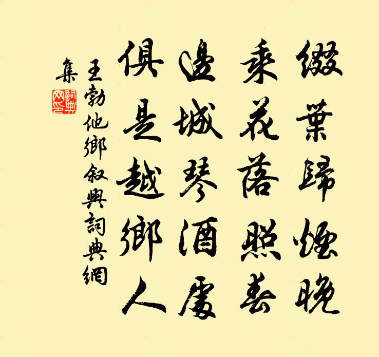 詩詞名句歷史字典書法欣賞書法字典國語詞典說文解字康熙字典古漢語字典標 題 作 者 詩 句 他鄉敘興作者:王勃 朝代:唐代他鄉敘興原文綴葉歸煙晚,乘花落照春。邊城琴酒處,俱是越鄉人。詩詞問答問:他鄉敘興的作者是誰?答:王勃問:他鄉敘興寫於哪個朝代?答:唐代問:他鄉敘興是什麼體裁?答:五絕問:王勃的名句有哪些?答:王勃名句大全王勃他鄉敘興書法欣賞他鄉敘興書法作品注釋全唐詩:卷56_42詩詞推薦小疾偶書陸游〔宋代〕書生本願致時康,自怪秋來疾在床。胸次豈無醫國策,囊中幸有活人方。但知元氣為根本,正使長生亦秕糠。豎子六月二十三日立秋喜聞賊平鎮將凱回歸府官俱方回〔宋代〕亂起杏花落,賊平梧葉飛。頓忘三伏暑,竟解萬山圍。大將傷流矢,諸軍曳血衣。先登不如此,焉得凱歌歸。金剛隨機無盡頌如法受持分第十三釋印肅〔宋代〕既剖塵中卷,三千及大千。□□□□□,鼓眾看喧天。頌古一百則釋正覺〔宋代〕不起一念須彌山,韶陽法施意非慳。肯來兩手相分付,擬去千尋不可攀。滄海闊,白雲閒,莫將毫髮著其間。假雞雪晴趙蕃〔宋代〕啟戶猶飛雪,披衣忽報晴。慵為踞爐坐,喜作出門行。草凍袍爭色,梅殘玉墮英。未能憂旱苦,聊復快詩情。劉侍讀見和山邸十篇重申此贈李嶠〔唐代〕神岳瑤池圃,仙宮玉樹林。乘時警天御,清暑滌宸襟。梁駕陪玄賞,淄庭掩翠岑。對岩龍岫出,分壑雁池深。檐迥寶鼎現(壽李端明)程珌〔宋代〕綠楊欲舞,紅杏微笑,春工漸侈。試僂指、自從嘉定,數到寶慶□□里。無一歲、不書年大有,問元功誰燮理。□寄李簡夫宮使五首蘇泂〔宋代〕歸來手接一封書,累幅春冰字字珠。便欲籃輿從此去,好風吹過燭溪湖。清平樂(壽某翁)劉辰翁〔宋代〕君詞為壽。絕妙孫辛婦。但恨杯無露添酒。空等待梅花久。喜君白首還玄。人間合信天緣。如此相從至老,我亦何上太師公相生辰詩十首佚名〔宋代〕談笑能令國勢強,一時忠閏凜秋霜。挽回騩馭遠長樂,直把鴻動紀太常。間寐東朝宮殿曉,來庭北使塞垣長。輔成同師道弟奉親游延平鳳山陳宓〔宋代〕我來一載強,再覿鳳山面。時當秋末垂,群木尚蔥倩。卓彼鸞停姿,清流潔於練。照影眩其儀,世治乃一見。伊予偈頌二十一首釋智愚〔宋代〕年垂九十礙叢林,歷心風霜歲月深。妙蘊豈能超佛祖,寸衷端可格天心。頌古十七首釋道行〔宋代〕江南江北勿同倫,疑了還疑笑 * 。誰信一盤油炸底,古今塞斷是非門。題范伯詩顧齋蔡沈〔宋代〕時人慾作聖賢歸,反己由來自不欺。談話每虞無十步,持循長恐有虛辭。砼砼固不為茲必,踽踽寧求可善斯。吃緊廢桑畦種花姜特立〔宋代〕課仆斸桑窠,從頭盡種花。莫教聶子見,怪我不栽禾。和蒲君刑曹佳什晁說之〔宋代〕獨步當年賢士關,青衫初試□官閒。好憐歸去龍鍾者,五世題名在道山。寄珂雪屋薛嵎〔宋代〕積雪覆茅屋,僧居清更清。浮生千劫盡,長日一燈明。野鳥呼能下,山靈避不行。舊時江月住,時聽誦經聲。送周晉叔李新〔宋代〕妙齡璧水興何窮,投筆幡然定遠功。寶伏初依金碧輅,鐵鞭閒靜海連風。萱堂歸去椒觴近,珠佩收來漢月空。明日和何倅游雁盪吳芾〔宋代〕何侯富詞藻,能賦兼能詩。百篇輩李白,十稔嗤左思。搜奇抉靈怪,造化不能私。每為山水游,錦囊隨所之。雁盪即事六絕王炎〔宋代〕焚香清坐對韋編,妙處懸知不可傳。三畫分明寄玄旨,誰將修綆汲深泉。名句推薦不道愁人不喜聽。空階滴到明。万俟詠《長相思·雨》 只有天在上,更無山與齊寇準《詠華山》 酷暑天,葵榴發,噴鼻香十里荷花。白樸《得勝樂·夏》 但責己,不責人,此遠怨之道也王永彬《圍爐夜話·第八五則》 魄依鉤樣小,扇逐漢機團。薛濤《月》 天下神器,不可為也,不可執也。為者敗之,執者失之。老子《老子·道經·第二十九章》 石壕村里夫妻別,淚比長生殿上多。袁枚《馬嵬》 我醉君復樂,陶然共忘機。李白《下終南山過斛斯山人宿置酒》 泥融飛燕子,沙暖睡鴛鴦。杜甫《絕句二首》 獨自下層樓,樓下蛩聲怨。程垓《卜運算元·獨自上層樓》