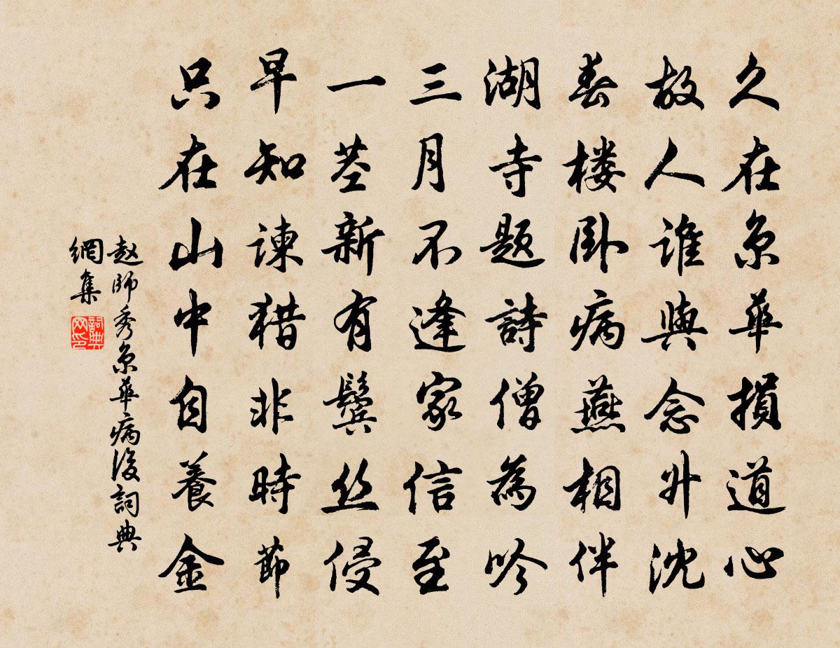 詩詞名句歷史字典書法欣賞書法字典國語詞典說文解字康熙字典古漢語字典標 題 作 者 詩 句 京華病後作者:趙師秀 朝代:宋代京華病後原文久在京華損道心,故人誰與念升沈。春樓臥病燕相伴,湖寺題詩僧為吟。三月不逢家信至,一莖新有鬢絲侵。早知諫獵非時節,只在山中自養金。詩詞問答問:京華病後的作者是誰?答:趙師秀問:京華病後寫於哪個朝代?答:宋代趙師秀京華病後書法欣賞京華病後書法作品詩詞推薦虎丘山蔣堂〔宋代〕虎丘鬼何為山,鯨波涌而顯。惟青鎮一隅,峙秀狀無限。遙峰乃眾陰,四望拱孤巘。上有梵王家,高壓長洲苑。游馬上口占三絕鄭剛中〔宋代〕秋陽未作結霜風,沙細堤平落日紅。客子何須念行役,馬蹄多在柳陰中。頌古四十四首釋法泰〔宋代〕風前露出無瑕璧,室內擎將如意珠。兩度獻渠渠不識,可憐流落在江湖。蝶戀花陳從古〔宋代〕日借輕黃珠綴露。困倚東風,無限嬌春處。看盡夭紅渾謾語。淡妝偏稱泥金縷。不共鉛華爭勝負。殿後開時,故欲孤山觀雪趙企〔宋代〕乘興尋幽不怕寒,喜將山水雪中看。等閒喔出西湖句,自有清新上筆端。潤卿魯望寒夜見訪,各惜其志,遂成一絕皮日休〔唐代〕世外為交不是親,醉吟俱岸白綸巾。清風月白更三點,未放華陽鶴上人。酒泉子·空磧無邊孫光憲〔唐代〕空磧無邊,萬里陽關道路。馬蕭蕭,人去去,隴雲愁。香貂舊制戎衣窄,胡霜千裏白。綺羅心,魂夢隔,上高樓。句陳從古〔宋代〕禮部又開南省傍,賣花羞聽叫文官。九日王越卿司法置酒要客始約登武安之塔為游趙蕃〔宋代〕登高有約乃相違,故遣村船逆上溪。寺與松篁元不隔,路經蓬萑卻成迷。數君放逸仍懷古,老我悲涼況哭妻。鄭重句葉廷珪〔宋代〕名字惟因佛書見,根苗應逐賈胡來。簡求心要書紳辭晃逈〔宋代〕以靜制動,靜為躁君。以虛受有,虛緣葆真。詳而後習,可書諸紳。得壽仁、壽俊二子中塗家書三首楊萬里〔宋代〕我昔如汝長,壯志在四方。集賢給筆札,秉燭促夜裝。平明出門去,振衣不傍徨。先君泫然泣,感我令我傷。先君雜曲歌辭行路難二首僧齊己〔唐代〕行路難,君好看,驚波不在黤黮間,小人心裡藏奔湍。七盤九折寒崷崪,翻車倒蓋猶堪出。未似是非唇舌危,暗中病柏杜甫〔唐代〕有柏生崇岡,童童狀車蓋。偃蹙龍虎姿,主當風雲會。神明依正直,故老多再拜。豈知千年根,中路顏色壞。出非古漁父詞十二首王銍〔宋代〕得即歡欣失卻憂,死生輪轉暗相仇。那知垂釣非真釣,只在絲綸不在鉤。晚過劉伯山趙蕃〔宋代〕晚向窮岡訪竹亭,竹間忽有打禾聲。凶年獨使詩人飽,可見天公非世情。望東湖五首袁燮〔宋代〕天上金波印水心,心中波浪亦成金。小舟蕩漾金波里,陡覺廣寒宮殿深。金陵雜興二百首蘇泂〔宋代〕艷杏夭桃日夜忙,雨餘啼損不成妝。元戎和氣春風似,又引笙歌看海棠。阮郎歸(梨花)趙文〔宋代〕冰肌玉骨淡裳衣。素雲翠枝。一生不曉摘仙詩。雪香應自知。微雨後,禁菸時,洗妝君莫遲。東風不解惜妍姿。吹次韻分生五首陳著〔宋代〕詩筒狎至補前疏,快似西風卷峽初。一片襟懷誰似友,曾從仙李跨鯨魚。名句推薦佳節久從愁里過,壯心偶傍醉中來。蘇洵《九日和韓魏公》 王粲登臨寥落際。雁飛不斷天連水。王庭筠《鳳棲梧·衰柳疏疏苔滿地》 以治氣養生則後彭祖,以修身自名則配堯、禹。宜於時通,利以處窮,禮信是也。荀子《荀子·修身》 日永如年愁難度,高城回首,暮雲遮盡,目斷人何處惠洪《青玉案·絲槐煙柳長亭路》 夜聞歸雁生鄉思,病入新年感物華。歐陽修《戲答元珍》 當場不論,過後枉然。佚名《增廣賢文·下集》 可憐青冢已蕪沒,尚有哀弦留至今。王安石《明妃曲二首》 萬壑樹參天,千山響杜鵑。王維《送梓州李使君》 數年來往鹹京道,殘杯冷炙謾消魂晏殊《山亭柳·贈歌者》 戰士軍前半死生,美人帳下猶歌舞。高適《燕歌行》