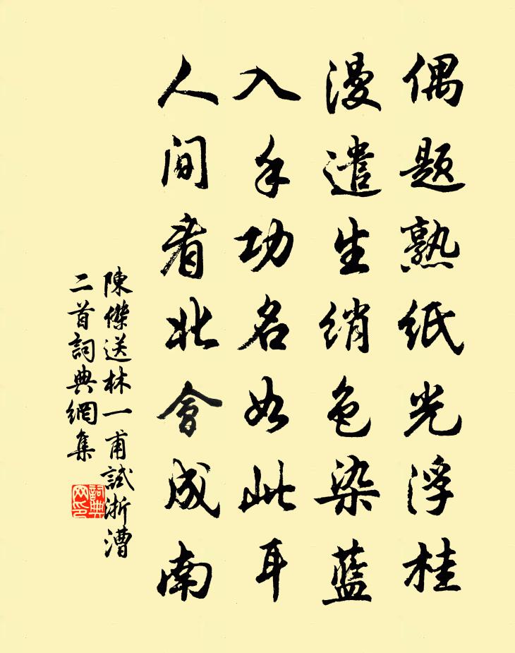 詩詞名句歷史字典書法欣賞書法字典國語詞典說文解字康熙字典古漢語字典標 題 作 者 詩 句 送林一甫試浙漕二首作者:陳杰 朝代:宋代送林一甫試浙漕二首原文偶題熟紙光浮桂,漫遣生綃色染藍。入手功名如此耳,人間看北會成南。詩詞問答問:送林一甫試浙漕二首的作者是誰?答:陳杰問:送林一甫試浙漕二首寫於哪個朝代?答:宋代陳杰送林一甫試浙漕二首書法欣賞送林一甫試浙漕二首書法作品詩詞推薦題政黃牛出山圖王灼〔宋代〕橋邊路欲迷,林外山猶見。長歌扣牛角,不讀項羽傳。戲書麻線堆下范成大〔宋代〕一身半世走奔波,疑是三生宿債多。折券已饒麻線嶺,責償難免竹竿坡。吉之南門外見木芙蓉爛開曾豐〔宋代〕小春催出傾城色,笑倚牆頭若招客。芬芳猶帯秋風殘,婀娜豈宜江路側。詩眼驚紅狂欲呼,熟看似細又似粗。花神滿江紅·題南京夷山驛王清惠〔宋代〕太液芙蓉,渾不似、舊時顏色。曾記得、春風雨露,玉樓金闕。名播蘭簪妃后里,暈潮蓮臉君王側。忽一聲、顰鼓和宋子京召還學士院晏殊〔宋代〕網索軒窗邃,鑾坡羽衛重。鷁舟還下瀨,星使出飛龍。賦待三英集,詞須五吏供。會看邊燧息,橫霈紫泥封。頌古九十八首釋印肅〔宋代〕信地無閒處,知心用不非。微塵佛國土,妙在一毫釐。應當知是見,所說但隨宜。古錐無做作,謾把布毛吹。吳王闔廬墓釋智愚〔宋代〕海涌通幽一徑深,怪來時作老龍吟。闔閭覿面無回跡,休向空山斷處尋。清溪釋心月〔宋代〕咫尺曹源有路通,游魚何事自迷蹤。有聲為利不平處,一點塵泥斷不容。宿業師山房期丁大不至 / 宿業師山房待丁大不至孟浩然〔唐代〕夕陽度西嶺,群壑倏已暝。松月生夜涼,風泉滿清聽。 樵人歸欲盡,煙鳥栖初定。之子期宿來,孤琴候蘿徑。逍遙詠宋太宗〔宋代〕飛騰自在莫教賒,坎女離男共一家。無礙逍遙通智慧,將求利樂勿須夸。靈根就看和春雪,神室之中有絳砂。彼是自遣陸游〔宋代〕蔬食任無魚,山行可借驢。指攣猶把釣,眼澀未捐書。客少勝紛若,家貧亦晏如。時時顧影嘆,頑似十年初。八月八日發潭州後得絕句四十首趙蕃〔宋代〕山驛雖荒亦可安,要眠杉月夜深寒。昨宵虛落才聞鼓,明夕江皋想枕湍。聲聲慢侯善淵〔元代〕公鄰煙水,我弊嵩峰。天涯杳隔難通。悟理非遙,目前不二清風。寶月孤高洞鑒,印千潭、普照玄洞。無彼我,混還舍陸游〔宋代〕剩欲銜杯樂太平,新愁還續舊愁生。出門始覺春來早,處處簾櫳笑語聲。論項賈似道〔宋代〕青項堆青鈿,白毛根閃青。硃砂火盆底,桃皮等類形。白腐冬瓜大,寬臊壘起星。毛丁有,入手不當輕。擬古納蘭性德〔清代〕美人臨殘月,無言若有思。含顰但斜睇,吁嗟憐者誰。予本多情人,寸心聊自持。浩歌幽蘭曲,援琴終不怡。私恨題八君子圖後真德秀〔宋代〕劉子出西江,訪我江之東。何人與偕來,銜袖八鉅公。韓歐開濟姿,如晴月生空。潞公山嶽重,文正霜檜同。玉立送喬布聖秦觀〔宋代〕鷃翔蓬蒿非所悲,鵬擊風雲非所喜。貴賤窮通盡偶然,回頭總是東海水。我思田文昔相齊,朱袍照日如雲霓。三千羅盞山張灝〔宋代〕道盞原非盞,言羅不是羅。只因山突起,個個盡如螺。次韻張仲通水軒王安石〔宋代〕池雨含煙暝不收,草根長見水交流。愛君古錦囊中句,解道今秋似去秋。名句推薦帝王之道,以寬仁為大。令狐德棻《周書·本紀·卷四》 日下壁而沉彩,月上軒而飛光。江淹《別賦》 四月南風大麥黃,棗花未落桐葉長。李頎《送陳章甫》 十五彩衣年,承歡慈母前。孟浩然《送張參明經舉兼向涇州覲省》 只願君心似我心,定不負相思意。李之儀《卜運算元·我住長江頭》 話不在多說,有理不在高聲!佚名《增廣賢文·下集》 懷春情不斷,猶帶相思舊子。吳文英《丁香結·夷則商秋日海棠》 求則得之,舍則失之,是求有益於得也,求在我者也。孟子《孟子·盡心章句上·第三節》 見人不正,雖貴不敬也;見人有污,雖尊不下也。司馬遷《史記·日者列傳》 世間花葉不相倫,花入金盆葉作塵。李商隱《贈荷花》