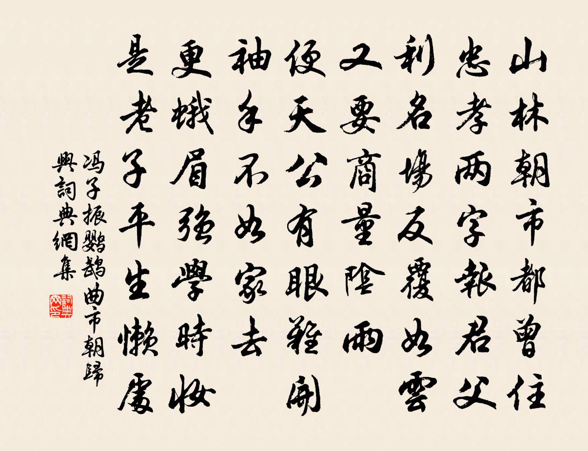 詩詞名句歷史字典書法欣賞書法字典國語詞典說文解字康熙字典古漢語字典標 題 作 者 詩 句 鸚鵡曲 市朝歸興作者:馮子振 朝代:元代鸚鵡曲 市朝歸興原文山林朝市都曾住。忠孝兩字報君父。利名場反覆如雲,又要商量陰雨。便天公有眼難開,袖手不如家去。更蛾眉強學時妝,是老子平生懶處。詩詞問答問:鸚鵡曲 市朝歸興的作者是誰?答:馮子振問:鸚鵡曲 市朝歸興寫於哪個朝代?答:元代問:鸚鵡曲 市朝歸興是什麼體裁?答:詞馮子振鸚鵡曲 市朝歸興書法欣賞鸚鵡曲 市朝歸興書法作品詩詞推薦醉落魄(海棠)范成大〔宋代〕馬蹄塵撲。春風得意笙歌逐。款門不問誰家竹。只揀紅裝,高處燒銀燭。碧雞坊里花如屋。燕王宮下花成谷。不須正月二十五日過真溪見桃花程公許〔宋代〕桃花簇簇有人家,寂歷炊煙晚照斜。滿眼芳春無處著,一機新錦濯煙霞。水調歌頭佚名〔宋代〕瑞溢飛猿嶠,秀毓鳳凰山。臘餘六日春到,人間世慶生賢。奉和九日登慈恩寺浮圖應制李適適〔唐代〕鳳輦乘朝霽,鸚林對晚秋。天文貝葉寫,聖澤菊花浮。塔似神功造,龕疑佛影留。幸陪清漢蹕,欣奉淨居游。和題蓮花壁間趙希逢〔宋代〕亂雲翠擁千層蓋,拳落時聽雨打聲。長笛隔江吹晚霽,水光月色兩分明。聞鶯袁燮〔宋代〕春曉園禽百族鳴,未知黃鳥可人心。閒中靜聽綿蠻語,絕勝歌喉要眇音。宴交代趙寺丞樂語口號牟巘五〔宋代〕帝教雲牧重雲山,柱輒清朝玉立班。八月星槎來海上,九天藜杖照人間。煩公政事文章手,開此江山父老顏。若到書齋壁陸游〔宋代〕幅巾短褐野人裝,洗盡黃塵早暮忙。地僻漁扉常隱翳,身閒靈府自清涼。雨中鬱郁垣衣綠,澗底纖纖石髮長。老憊淮南遊故居感舊,酬西川李尚書德裕王播〔唐代〕昔年獻賦去江湄,今日行春到卻悲。三徑僅存新竹樹,四鄰惟見舊孫兒。壁間潛認偷光處,川上寧忘結網時。更見李泌二首黎廷瑞〔宋代〕一副黃台話,離離詠種瓜。都來三十字,救得兩官家。寄隱靜山懷賢長老梅堯臣〔宋代〕山有枇杷樹,樹多獼猴群。高僧心不著,一似五峰雲。隨飈來溪口,石上起氤氳。果熟獼猴去,自向瀑澗分。清平樂(興國軍呈李司直)戴復古〔宋代〕今朝欲去。忽有留人處。說與江頭楊柳樹。系我扁舟且住。十分酒興詩腸。難禁冷落秋光。借取春風一笑,狂夫到自和徐潭二首劉克莊〔宋代〕從今快活安斯寢,那復辛勤陟彼岡。萬而路曾雙不借,四天下只一禪床。寬如馬驛名方丈,劣似雞棲即客房。自唱畫松元稹〔唐代〕張璪畫古松,往往得神骨。翠帚掃春風,枯龍戛寒月。流傳畫師輩,奇態盡埋沒。纖枝無蕭灑,頑乾空突兀。乃悟句折彥質〔宋代〕石橋步月公居後,橘井烹茶我在先。和程公辟游宿猿洞二首陳襄〔宋代〕幾年營此草堂棲,施飾名園百卉齊。曾學子真耕谷口,今容摩什老山西。龍台日上千峰出,雁塔雲生一徑迷。知有醉鄉張紹文〔宋代〕醉鄉詩筆是生涯,短短蠻箋字字斜。沉水一株煙未斷,半窗寒月上梅花。山居雜言王安石〔宋代〕法和衣缽過南華,正葉傳師萃一花。勝地霧迷淮水石,望星人指楚天涯。數千松倚西山老,七百僧悲去路賒。一片新晴讀樊川詩楊萬里〔宋代〕江妃瑟里芰荷風,淨掃痴雲展碧穹。嫩熱便嗔疏小扇,斜陽酷愛弄飛蟲。九千刻里春長雨,萬點紅邊花又空。不是謁夔門桂帥陽枋〔宋代〕志欲商伊學欲顏,尋師夢繞五湖間。不違誓至仁三月,親炙寧辭雪萬山。流海浪浮蝸戰角,排雲應許豹窺斑。還丹名句推薦幾硯昔年游,於今成十秋。司馬光《送龔章判官之衛州·新及第》 美人自古如名將,不許人間見白頭。袁枚《隨園詩話·卷四》 清鏡無雙影,窮泉有幾重。顧況《酅公合祔輓歌》 製法而自犯之,何以帥下?陳壽《三國志·魏書·武帝紀》 恐鳳靴,挑菜歸來,萬一灞橋相見。史達祖《東風第一枝·詠春雪》 恩威同施,才德相較,苟無功,得無天耶?來俊臣《羅織經·治下卷第三》 壽酒還嘗藥,晨餐不薦魚。錢起《送外甥懷素上人歸鄉侍奉》 蜀天常夜雨,江檻已朝晴。杜甫《水檻遣心二首》 風吹古木晴天雨,月照平沙夏夜霜。白居易《江樓夕望招客》 扁舟昨泊,危亭孤嘯,目斷閒雲千里。吳潛《鵲橋仙·扁舟昨泊》