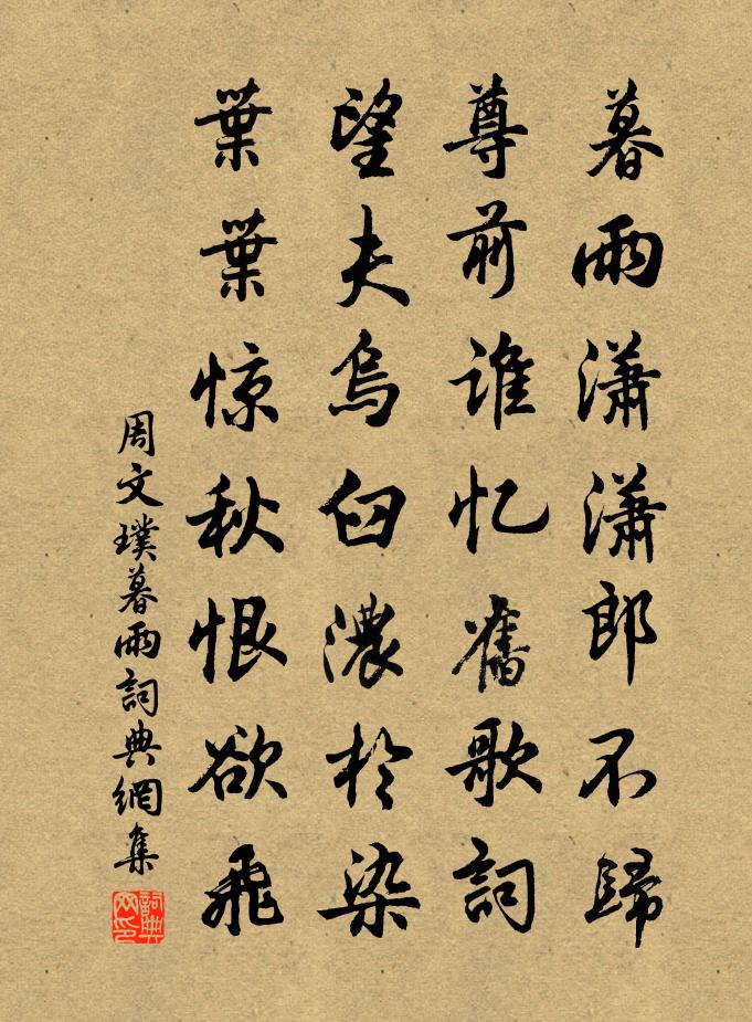 詩詞名句歷史字典書法欣賞書法字典國語詞典說文解字康熙字典古漢語字典標 題 作 者 詩 句 暮雨作者:周文璞 朝代:宋代暮雨原文暮雨瀟瀟郎不歸,尊前誰憶舊歌詞。望夫烏臼濃於染,葉葉驚秋恨欲飛。詩詞問答問:暮雨的作者是誰?答:周文璞問:暮雨寫於哪個朝代?答:宋代周文璞暮雨書法欣賞暮雨書法作品詩詞推薦偈頌一百零四首釋紹曇〔宋代〕虛空包不包,大地壞不壞。行腳不遇人,出語無賴聊。謾言密室不風,顯紙如何裹大蟲。自嘆晁公溯〔宋代〕巴蜀久雕敝,傷哉遠朝廷。大道舞狐狸,嘉穀困蝗螟。我嘗行其野,所在聞惟腥。嘆息莫能救,熟視涕淚零。今年怨王孫/憶王孫佚名〔宋代〕夢斷漏悄。愁濃酒惱。寶枕生寒,翠屏向曉。門外誰掃殘紅。夜來風。玉簫聲斷人何處。春又去。忍把歸期負。此和前人韻王柏〔宋代〕屢作家書欲寄人,姓名愁墮軟紅塵。眼邊忽見傷春句,屈指別來猶是春。宿疏山釋紹嵩〔宋代〕竹輿穿雨上疏山,寒涕重頤獨掩關。病客欲眠渾不寐,白猿啼在白雲間。喬木張耒〔宋代〕舍北參天喬木長,依憑清蔭護高堂。鳥啼杳杳重陰合,風到翩翩翠葉涼。已許孤高凌夏日,不妨堅老要秋霜。投身過商山戎昱〔唐代〕雨暗商山過客稀,路傍孤店閉柴扉。卸鞍良久茅檐下,待得巴人樵採歸。寒食日同婦子輩東園小宴張耒〔宋代〕寒食無與樂,攜孥宴小園。青春積雨霽,白日萬花繁。時節悲江國,窮愁泥酒尊。故鄉終在眼,樂不得重論。雜記五言十首劉克莊〔宋代〕履霜行於野,絕糧厄於陳。伯奇父逐子,仲尼天戮民。使東川。望驛台(三月盡)元稹〔唐代〕可憐三月三旬足,悵望江邊望驛台。料得孟光今日文,不曾春盡不歸來。送程給事知越州馮京〔宋代〕才毫無地展經綸,白首歸來萬里身。持節氣凌沙漠使,懷章榮動會稽人。平湖翠岫千家月,落日西風一箸蓴。南海旅中送遷客吳融〔唐代〕天南不可去,君去吊靈均。落日青山路,秋風白髮人。言危無繼者,道在有明神。滿目盡胡越,平生何處陳。秋庭夜月有懷李澄之〔唐代〕遊客三江外,單棲百慮違。山川憶處近,形影夢中歸。夜月明虛帳,秋風入搗衣。從來不慣別,況屬雁南飛。過松源晨炊漆公店楊萬里〔宋代〕莫言下嶺便無難,賺得行人空喜歡。正入萬山圈子裡,一山放過一山攔。(放過 一作:放出)南樓令(次陳君衡韻)周密〔宋代〕開了木芙蓉。一年秋已空。送新愁、千里孤鴻。搖落江蘺多少恨,吟不盡、楚雲峰。往事夕陽紅。故人江水東。翠爇心香 詠香馬鈺〔元代〕不*沉香。閒*心香。布仁風、處處聞香。人人向善,個個崇香。願處無為,常清淨,自然香。妙洞雲香。虎嘯噴次翁秀峰林景熙〔宋代〕花柳湖西別此翁,十年鬢雪忽重逢。唐陵愁問永和帖,楚水夢聞長樂鍾。黃妳秋燈余舊癖,素侯野服拜新封。世情回謁藍主簿道傍見梅偶成蒲壽宬〔宋代〕誰家一樹鐵斜欹,的皪疏花出短籬。黃葉久隨風捲地,幽姿當與雪同時。白頭朔漠窮蘇武,瘦骨西山餓伯夷。三嗅贈仙茅道士裘萬頃〔宋代〕茅齋高臥日將午,自起鉤簾試香縷。門前剝啄誰叩門,杖履蕭然顏貌古。亟呼兒童延入座,餉以清風滌袢暑。論醫贈閭丘處士李白〔唐代〕賢人有素業,乃在沙塘陂。竹影掃秋月,荷衣落古池。閒讀山海經,散帙臥遙帷。且耽田家樂,遂曠林中期。野酌名句推薦冰,水為之,而寒於水。荀子《勸學》 南北山頭多墓田,清明祭掃各紛然。高翥《清明日對酒》 牛靿咤咤,田確確,旱塊敲牛蹄趵趵。元稹《田家詞 / 田家行》 來如春夢幾多時?去似朝雲無覓處。白居易《花非花》 劍外忽傳收薊北,初聞涕淚滿衣裳。杜甫《聞官軍收河南河北》 水天清話,院靜人銷夏。項鴻祚《清平樂·池上納涼》 夜來幽夢忽還鄉,小軒窗,正梳妝。相顧無言,惟有淚千行。蘇軾《江城子·乙卯正月二十日夜記夢》 霜降碧天靜,秋事促西風。葉夢得《水調歌頭·九月望日與客習射西園余偶病不能射》 昨日春如,十三女兒學繡。辛棄疾《粉蝶兒·和趙晉臣敷文賦落花》 夫尚賢者,政之本也。墨子《墨子·08章 尚賢(上)》