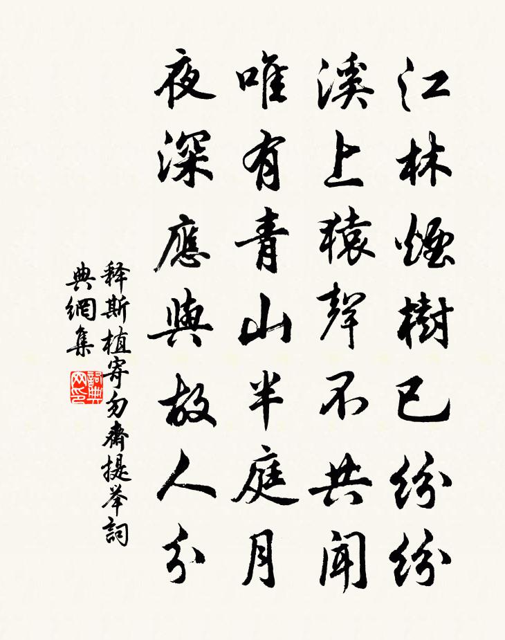 詩詞名句歷史字典書法欣賞書法字典國語詞典說文解字康熙字典古漢語字典標 題 作 者 詩 句 寄勿齋提舉作者:釋斯植 朝代:宋代寄勿齋提舉原文江林煙樹已紛紛,溪上猿聲不共聞。唯有青山半庭月,夜深應與故人分。詩詞問答問:寄勿齋提舉的作者是誰?答:釋斯植問:寄勿齋提舉寫於哪個朝代?答:宋代釋斯植寄勿齋提舉書法欣賞寄勿齋提舉書法作品詩詞推薦戲答史應之三首黃庭堅〔宋代〕甑有輕塵釜有魚,漢庭日日召嚴徐。不嫌藜藿來同飯,更展芭蕉看學書。居厚弟示和詩複課十首劉克莊〔宋代〕自與浮名了不關,騰空豈若抱珠蟠。浪雲史學三劉後,敢道詩名二宋間。青帝縱然回暖律,蒼官安得有韻顏。日晡幽居歲暮陸游〔宋代〕古井年年浚,荒疇日日犁。刈茅苫鹿屋,插棘護雞棲。閒賴書遮眼,愁須酒到臍。斜陽有常課,緩步上湖堤。句鷗陽凱士〔宋代〕冰姿元住藐姑山。枕上四首呈子景舒劉宰〔宋代〕弦歌容與倦將迎,五斗看來一羽輕。若也兒曹如此意,可容千載擅清名。中秋陪熙用學士禁中玩月吳融〔唐代〕月圓年十二,秋半每多陰。此夕無纖靄,同君宿禁林。未高知海闊,當午見宮深。衣似繁霜透,身疑積水沈。遭逢荷花盛開以病旬余不至亭上偶成二唐律岳珂〔宋代〕病襟傭策杖,天鏡恰開奩。青蓋迷前浦,紅妝間曲檐。藻窺知鷺上,萍破識魚潛。會看吳公陣,宮蛙奏曉嚴。題光風霄月樓方鳳〔宋代〕人間底處無風月,知用何時最佳絕。芳播崇樓淑氣浮,影涵古桂清輝發。向來雅重無極翁,灑落襟懷與此同。去之鑿山為墳貽侄有詩公韻方岳〔宋代〕著書無復可藏山,朽骨何堪定眠觀。從左右旋天倚蓋,哉生死魄月循環。虛空身亦為吾患,見在心誰乞汝安。試問和答劉慶遠姜特立〔宋代〕夙昔何嘗卑小官,已將富貴等閒看。余名不上韓公榜,事業難登漢將壇。念舊詎能忘里社,避喧終欲掛朝冠。故人游金山潘景良〔宋代〕嵌岩穹窿,屹立乎江中。崩湍下瞰不見底,巨石崛出高摩空。混沌破來到今幾萬歲,雄奇秀麗胡為乎此山兮夕鍾。雜詠一百首何蕃劉克莊〔宋代〕城去曾聯疏,宣收亦舉幡。向令無太學,安得有何蕃。燭影搖紅 松窗午夢初覺毛滂〔宋代〕一畝清陰,半天瀟灑松窗午。床頭秋色小屏山,碧帳垂煙縷。枕畔風搖綠戶。喚人醒、不教夢去。可憐恰到,瘦石字耕顧逢〔宋代〕此田無水旱,只在硯池中。善作諸家體,能成八 * 。墨痕生夏雨,筆潁熟秋風。蓑笠辛勤者,常憂歲不豐。贈樊著作白居易〔唐代〕陽城為諫議,以正事其君。其手如屈軼,舉必指佞臣。卒使不仁者,不得秉國鈞。元稹為御史,以直立其身。其心秋日泊平望驛寄太常裴郎中羅隱〔唐代〕蘋洲重到杳難期,西倚郵亭憶往時。北海尊中常有酒,東陽樓上豈無詩。地清每負生靈望,官重方升禮樂司。聞說題零陵石屏舒岳祥〔宋代〕大浪所簸搖,青山為俯仰。云何峰外雪,亦與相下上。思九江舊居三首李中〔唐代〕結茅曾在碧江隈,多病貧身養拙來。雨歇汀洲垂釣去,月當門巷訪僧回。靜臨窗下開琴匣,悶向床頭潑酒醅。遊宦金剛隨機無盡頌淨心行善分第二十三釋印肅〔宋代〕我人訊息盡,忘軀失卻命。參方不遇人,卻乃成心病。玉交枝/憶秦娥劉燾〔宋代〕念誰伴、茜裙翠袖。名句推薦弟妹蕭條各何在,干戈衰謝兩相催!杜甫《九日五首·其一》 可憎者,人情冷暖;可厭者,世態炎涼。程登吉《幼學瓊林·卷一·歲時》 人情反覆,世路崎嶇。洪應明《菜根譚·概論》 父母在,不遠遊,遊必有方。孔子弟子《論語·里仁篇》 宦情羈思共淒淒,春半如秋意轉迷柳宗元《柳州二月榕葉落盡偶題》 風雨滿城,何幸兩重陽之近;文天祥《回董提舉中秋請宴啟》 大丈夫生居天地間,豈能鬱郁久居人下!羅貫中《三國演義·第九回》 教人無處寄相思,落花芳草過前期,沒人知。孫光憲《虞美人·好風微揭簾旌起》 不近人情,舉世皆畏途;不察物情,一生俱夢境。陳繼儒《小窗幽記·集醒篇》 渭城朝雨浥輕塵,客舍青青柳色新。王維《渭城曲 / 送元二使安西》