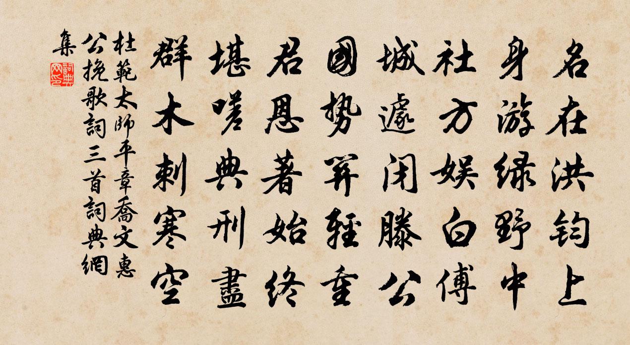 詩詞名句歷史字典書法欣賞書法字典國語詞典說文解字康熙字典古漢語字典標 題 作 者 詩 句 太師平章喬文惠公輓歌詞三首作者:杜范 朝代:宋代原文名在洪鈞上,身游綠野中。社方娛白傅,城遽閉滕公。國勢關輕重,君恩著始終。堪嗟典刑盡,群木刺寒空。詩詞問答問:《太師平章喬文惠公輓歌詞三首》的作者是誰?答:杜范問:該詩寫於哪個朝代?答:宋代書法欣賞太師平章喬文惠公輓歌詞三首書法作品詩詞推薦唐禪社首樂章。太和賀知章〔唐代〕肅我成命,於昭黃祇。裘冕而祀,陟降在斯。五音克備,八變聿施。緝熙肆靖,厥心匪離。送友入關李端〔唐代〕聞君帝城去,西望一沾巾。落日見秋草,暮年逢故人。非才長作客,有命懶謀身。近更嬰衰疾,空思老漢濱。和龔翠岩雨中述懷韻陳深〔宋代〕風流翰墨傅千古,議論文章自一家。靜愛雲林披白苧,懶趙閨闔草黃麻。江山故國閒停櫂,風雨僧窗自淪茶。甚欲薌林五十詠瓜田楊萬里〔宋代〕獨酌聖賢酒,新嘗子母瓜。丁寧林下友,莫道故侯家。讀介庵集題其上趙蕃〔宋代〕風前舊揖青綺帔,老去今披古錦囊。千古未忘圖像拜,也知風骨類文章。為徐企題趙子昂所畫二馬方回〔宋代〕相馬有伯樂,畫馬有伯時。伯樂永已矣,伯時猶見之。長林之下無茂草,此馬得無半飽飢。一疋背樹似揩癢,一疋和固道韻問谹父小疾三首王洋〔宋代〕惆悵休尋舊事,酣歌且數前山。待君蒼蘚重拂,相逐寧率興闌。奉和入潼關許敬宗〔唐代〕曦馭循黃道,星陳引翠旗。濟潼紆萬乘,臨河耀六師。前旌彌陸海,後騎發通伊。勢逾回地軸,威盛轉天機。是節【中呂】朝天曲張養浩〔元代〕掛冠,棄官,偷走下連雲棧。湖山佳處屋兩間,掩映垂楊岸。滿地白雲,東風吹散,卻遮了一半山。嚴子陵釣灘,崇勝寺後,有竹千餘竿,獨一根秀出,人呼惠洪〔宋代〕高節長身老不枯,平生風骨自清癯。愛君修竹為尊者,卻笑寒松作大夫。未見同參木上座,空餘聽法石於菟。戲將八聲甘州(壽張尚書)詹玉〔宋代〕從黃石容履,一編書,曾佐漢王關。甚殷勤佳約,茹芝人共,引鶴差鸞。藉手便成羽翼,方略正如閒。說道赤松去句黃裳〔宋代〕障塞應縣隔,崇敬塘謾太高。聽琴白玉蟾〔宋代〕聲出五音表,彈超十指中。鳥啼花落處,曲罷對春風。生雲軒姜夔〔宋代〕在山長與雲同齋,出山憶云云不來。千金買得太湖石,數峰相對寒崔嵬。朝來忽覺青苔濕,靉靉如炊石間出。白雲雪沈說〔宋代〕凍項縮如龜,茅檐諷雪詩。冷於初下日,好是未消時。樹重高枝折,窗明晚色遲。忽思溪上路,擬借蹇驢騎。野步即事釋文珦〔宋代〕疊巘復平原,行行足力煩,野程難較里,旅食暫依村。棗熟兒童聚,禾收鳥鵲喧。徘徊顧風景,不覺念丘園。聞杜宇寇準〔宋代〕曾為深冤無處雪,長年江上哭青春。平林雨歇殘陽後,愁殺天涯去國人。春日鄭剛中〔宋代〕朝來弄日花頭密,暗裡窺春柳眼多。任是老人情意薄,個般時節奈愁何。次韻沖卿上元從架至集禧觀偶成王安石〔宋代〕昭陵持橐從遊人,更見熙寧第四春。寶稱中開移玉座,華燈錯出映朱塵。輦前時看新歌舞,仗外還如舊徼巡。投老子平棋負茶墨小章督之文同〔宋代〕睡憶建茶斟瀲灩,畫思兗墨潑淋漓。可憐二物俱無有,記得南堂棋勝時。名句推薦聖人之為國也,觀俗立法則治,察國事本則宜。商鞅《商君書·算地》 身未升騰思退步,功成應憶去時言。只因先主丁寧後,星落秋風五丈原。羅貫中《三國演義·第三十八回》 多謝月相憐,今宵不忍圓。朱淑真《菩薩蠻·山亭水榭秋方半》 巧笑倩兮,美目盼兮。佚名《碩人》 人情若比初相識,到底終無怨恨心。馮夢龍《醒世恆言·卷一》 愛民者強,不愛民者弱荀子《荀子·議兵》 下附上以成志,上恃下以成名。來俊臣《羅織經·治下卷第三》 白下有山皆繞郭,清明無客不思家。高啟《清明呈館中諸公》 一夕輕雷落萬絲,霽光浮瓦碧參差。秦觀《春日》 想邊鴻孤唳,砌蛩私語。王沂孫《掃花游·秋聲》