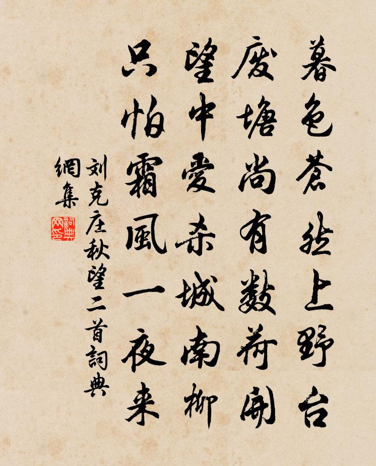 詩詞名句歷史字典書法欣賞書法字典國語詞典說文解字康熙字典古漢語字典標 題 作 者 詩 句 秋望二首作者:劉克莊 朝代:宋代秋望二首原文暮色蒼然上野台,廢塘尚有數荷開。望中愛殺城南柳,只怕霜風一夜來。詩詞問答問:秋望二首的作者是誰?答:劉克莊問:秋望二首寫於哪個朝代?答:宋代問:劉克莊的名句有哪些?答:劉克莊名句大全劉克莊秋望二首書法欣賞秋望二首書法作品詩詞推薦頌古九十八首釋印肅〔宋代〕箇中須得意,□□又生疑。本不假修造,識破現圓如。雨淋鈴杜龍沙〔宋代〕窗影瓏璁,畫樓平曉,翳柳啼鴉。門巷漸有新煙,東風定、人掃桐花。峭寒斗減,看旅雁、爭起蒹葭。溯斷雲,多歲晏晁公溯〔宋代〕歲晏天益寒,短景殊未長。曉日出愈遲,翳翳迷扶桑。微陽不破霧,仿佛光有芒。開門視屋瓦,北風吹朝霜。起坐再用才子富文華校讎天祿閣韻贈周教授陳造〔宋代〕步屧城腳園,蒼官拱綠士。向來錦打圍,轉首就紛妄。流光不貸客,感喟中夜起。肝腸舊輪囷,言賦子虛子。次韻吳僧魁一山十絕方回〔宋代〕筠溪四十三歲殀,師弟與兄傳夜衣。國手棋高更有著,百年政恐疾于飛。金人捧露盤 淨業寺觀蓮,有懷蓀友納蘭性德〔清代〕藕風輕,蓮露冷,斷虹收,正紅窗、初上簾鉤。田田翠蓋,趁斜陽魚浪香浮。此時畫閣垂楊岸,睡起梳頭。舊遊蹤秋晚雜興陸游〔宋代〕昔遇高皇起眾材,姓名曾得廁鄒枚。年踰八十猶賒死,卻伴鄰翁斸芋魁。舟中作陸游〔宋代〕晤語無人與遣愁,出門聊復弄輕舟。山穿煙雨參差出,水赴陂塘散漫流。隔葉雄雌鳴谷鳥,傍林子母過吳牛。數家畫堂春姜特立〔宋代〕故園二月正芳菲。紅紫團枝。一番草綠謝郎池。人醉如泥。底事江鄉風物,年年獨殿芳時。無情燕子背人飛。似愧菩薩蠻(代贈)毛滂〔宋代〕端端正正人如月。孜孜媚媚花如頰。花月不如人。眉眉眼眼春。沈香添小炷。共挹熏爐語。香解著人衣。君心蝴蝶重別薛華王勃〔唐代〕明月沉珠浦,秋風濯錦川。樓台臨絕岸,洲渚亘長天。旅泊成千里,棲遑共百年。窮途唯有淚,還望獨潸然。宮詞三十三首曹勛〔宋代〕潮隨春漲雪千尋,南越山藏暗浪深。欲識錢塘兩回汛,便如萬國奉君心。春暮吟邵雍〔宋代〕禽不通人情,唯知春已暮。亦或叫提壺,亦或叫歸去。句釋洪英〔宋代〕喜得狼煙息,弓弰壁上懸。鳳山古祠文同〔宋代〕林木摧折堂廡傾,其中塑像猶縱橫。狂巫騰踏野老拜,瘦雞薄酒邀神明。形容詭怪蛇{尷監換蟲}亂,聲音醜惡鴟小酌以詩招道祖分葛立方〔宋代〕寶胯開緗葉,香塵墮柘羅。湯鳴檐雨細,盞占隴雲多。連日伊蒲塞,今朝熱洛河。春風入詩腹,五字與君喔。題金碧山水卷錢選〔宋代〕江南北苑出奇才,千里溪出筆底回。不管六朝興廢事,一樽且向畫圖開。雪賦謝惠連〔南北朝〕歲將暮,時既昏。寒風積,愁雲繁。梁王不悅,游於兔園。乃置旨酒,命賓友。召鄒生,延枚叟。相如末至,居客蜀國偶題錢〔唐代〕忽憶明皇西幸時,暗傷潛恨竟誰知。佩蘭應語宮臣道,莫向金盤進荔枝。句陳丕〔宋代〕春禽得意千般語,澗草無名百種香。名句推薦怒髮衝冠,憑欄處、瀟瀟雨歇。岳飛《滿江紅·寫懷》 君家何處住,妾住在橫塘。崔顥《長干行·君家何處住》 楚水辭魚窟,燕山到雁家裴說《塞上曲》 曲終人醉。多似潯陽江上淚。朱敦儒《減字木蘭花·劉郎已老》 木落雁南度,北風江上寒。孟浩然《早寒江上有懷 / 早寒有懷 / 江上思歸》 更落盡梨花,飛盡楊花,春也成憔悴。汪元量《鶯啼序·重過金陵》 休說鱸魚堪膾,盡西風,季鷹歸未?辛棄疾《水龍吟·登建康賞心亭》 瓜熟蒂落,水到渠成。佚名《增廣賢文·下集》 飛龍御天,故資雲雨之勢;帝王興運,必俟股肱之力。房玄齡《晉書·列傳·第三十五章》 江天一色無纖塵,皎皎空中孤月輪。張若虛《春江花月夜》