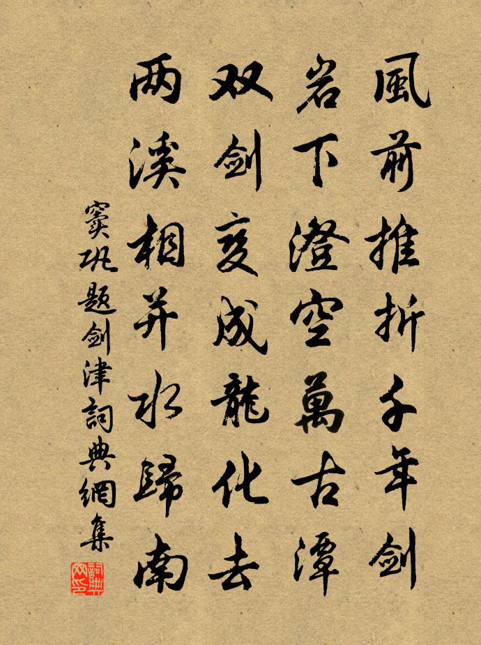 詩詞名句歷史字典書法欣賞書法字典國語詞典說文解字康熙字典古漢語字典標 題 作 者 詩 句 題劍津作者:竇鞏 朝代:唐代題劍津原文風前推折千年劍,岩下澄空萬古潭。雙劍變成龍化去,兩溪相併水歸南。詩詞問答問:題劍津的作者是誰?答:竇鞏問:題劍津寫於哪個朝代?答:唐代問:題劍津是什麼體裁?答:七絕竇鞏題劍津書法欣賞題劍津書法作品注釋全唐詩:卷271_134詩詞推薦白雲道中鄭獬〔宋代〕翠璧連環三百里,行人不奈愛山何。莫辭下馬尋雲徑,前到淮西塵已多。妙峰寺王古〔宋代〕修徑轉岩阿,危亭臨木杪。清明江練直,紫翠山屏繞。林蠻獻廳秀,圖畫極天巧。松杉韻輕風,笙簫奏雲表。心知穆陵大禮圖艾性夫〔宋代〕丹青百丈鵝溪絹,縹軸南郊大禮圖。官隸威儀猶是漢,山河風景已非吳。秋陰汾水年年雁,月黑連昌夜夜狐。輦路挽侍讀龍圖學士周公汪應辰〔宋代〕四海聲名久,中朝德齒優。金華方入侍,琳館遽歸休。全福人皆仰,孤風世莫留。老成零落盡,不獨為吾州。明招雜詩四首呂祖謙〔宋代〕牆竹生夏陰,風荷留宿露。解衣一盤礴,此豈不足付。奉和御製讀隋書夏竦〔宋代〕思仁懷遠度,大雅擅嘉名。製禮通時變,求書贊治平。推心清選舉,從儉化黎氓。終始承恩遇,芳猷冠老成。曹娥堰打船潘璵〔宋代〕曹娥廟前路,平日幾經行。浦淺舟難入,月斜潮始生。牛隨堰索轉,犬吠燎盆明。上得官河去,心安睡可成。點絳唇(次張伯修韻)洪咨夔〔宋代〕花事無多,笙歌綰取東風住。玉彝雕俎,樓外更籌屢。醉喚驪駒,催上天梯去。君知否。半邊銅虎。鄧艾經行路。冬晚書事文同〔宋代〕倚杖立亭皋,寒威向曉豪。雪乾山色老,風烈樹聲高。殘日千鴉舞,孤雲一雁號。自然成感物,不覺首重搔。題潘氏山水壁王柏〔宋代〕疊巘雲煙表,茅檐竹樹中。起予深隱趣,筆底有高風。殘花(一作楊發詩)羅隱〔唐代〕已嘆良時晚,仍悲別酒催。暖芳隨日薄,輕片逐風回。黛斂愁歌扇,妝殘泣鏡台。繁陰莫矜衒,終是共塵埃。沁園春 贈鄭松溪李道純〔元代〕若拙性若愚,若性慵若懶,性若呆若痴性。只這底便是,造玄日用,果行得去,密應神機。學解見知,聲聞圓覺,題鹽倉壁葛立方〔宋代〕破賊須緡錢,箕斂困郡縣。孰若嚴矩矱,溟海恣煎煉。僚寀課惰勤,息入計虧羨。連艘走群商,金帛委神甸。小人李羽處士故里溫庭筠〔唐代〕柳不成絲草帶煙,海槎東去鶴歸天。愁腸斷處春何限,病眼開時月正圓。花若有情還悵望,水應無事莫潺湲。終知贈轉運陸中丞孟郊〔唐代〕掌運職既大,摧邪名更雄。鵬飛簸曲雲,鶚怒生直風。投彼霜雪令,翦除荊棘叢。楚倉傾向西,吳米發自東。帆影飲中題一首劉克莊〔宋代〕曾從莊列問端倪,俗學區區等甕雞。佛法須償蚯蚓債,帝魂化作杜鵑啼。安知丞相嗔如屋,但見山公醉似泥。它日東園小飲陸游〔宋代〕入東又見幾春風?茆屋蘆藩寂寞中。道業雖如詩不進,世緣已與夢俱空。高枝濯濯辛夷紫,密葉深深躑躅紅。村巷蜀中將歸留辭韓相公貫之歐陽詹〔唐代〕寧體即雲構,方前恆玉食。貧居豈及此,要自懷歸憶。在夢關山遠,如流歲華逼。明晨首鄉路,迢遞孤飛翼。次韻之秋日雨後韻王隱〔宋代〕洺州秋雨後,幽勝可供間。白首留他縣,歸心繞故山。野泉來竹底,危磴入雲間。尚記登高會,重岩細菊斑。龍池春草李洞〔唐代〕龍池花清禁里,花芳草傍池花春。旋長花方遮岸,全生不染塵。和風輕動色,湛露靜流津。淺得承天步,深疑繞御名句推薦人之過誤宜恕,而在己則不可恕洪應明《菜根譚·概論》 兵家勝敗真常事,卷甲重來未可知。羅貫中《三國演義·第十二回》 傷心莫語,記那日旗亭,水嬉散盡,中酒阻風去。納蘭性德《摸魚兒·午日雨眺》 暗暗淡淡紫,融融冶冶黃。李商隱《菊花》 見世人可取者多,則德日進矣。王永彬《圍爐夜話·第五六則》 今年歡笑復明年,秋月春風等閒度。白居易《琵琶行 / 琵琶引》 狂風吹我心,西掛鹹陽樹。李白《金鄉送韋八之西京》 有兼聽之明,而無矜奮之容;有兼覆之厚,而無伐德之色。荀子《荀子·正名》 風波不信菱枝弱,月露誰教桂葉香李商隱《無題·重幃深下莫愁堂》 青天蜀道難,紅葉吳江冷。張可久《普天樂·秋懷》