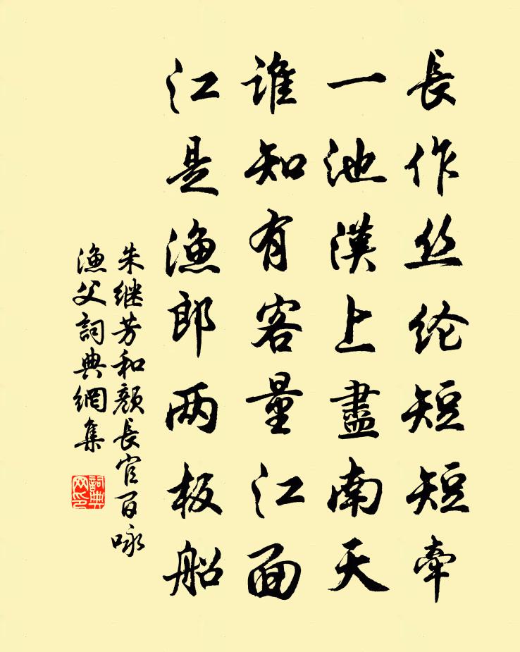 詩詞名句歷史字典書法欣賞書法字典國語詞典說文解字康熙字典古漢語字典標 題 作 者 詩 句 和顏長官百詠漁父作者:朱繼芳 朝代:宋代和顏長官百詠漁父原文長作絲綸短短牽,一池漢上盡南天。誰知有客量江面,江是漁郎兩板船。詩詞問答問:和顏長官百詠漁父的作者是誰?答:朱繼芳問:和顏長官百詠漁父寫於哪個朝代?答:宋代朱繼芳和顏長官百詠漁父書法欣賞和顏長官百詠漁父書法作品詩詞推薦春雪廖行之〔宋代〕臘尾春風不著忙,雪花先壓百花香。試為天上玉妃舞,欲遣人間越犬狂。萬里冰壺塵不染,一番瓊輔日初長。東皇句張道洽〔宋代〕早緣服玉肌能白,不為薰衣骨亦香。長安正月十五日白居易〔唐代〕喧喧車騎帝王州,羈病無心逐勝游。明月春風三五夜,萬人行樂一人愁。閻子常攜琴入村晁補之〔宋代〕閻夫子,通古今。家徒四壁猶一琴,今年二月雨霖霪。喜君壟麥如人深,屋間幽默鹹池音。高山流水我非聽,聽我頌古四十五首釋慧遠〔宋代〕膏肓未必兩邊尋,好是良醫雙下針。死活不能全忌口,喪車背後念觀音。亭前柳朱雍〔宋代〕養就玄霜圃,問東君、曾放瑤英。回首藍橋路,遍瓊城。橫斜影,照人明。飄香信、玉溪仙佩晚,同新月、步入西傳上人之吳釋惟一〔宋代〕達磨西來有底傳,賺人掘地覓青天。況今楓落吳江冷,去去休容易泊船。寄題望湖樓蔣堂〔宋代〕城上危樓勢孤峙,樓頭盡見湖中水。水色澄明游者多,古來雅以鑒為比。家家畫舫日斜歸,處處菱歌煙際起。清漣望蓬萊 八日馬鈺〔元代〕來朝九,今日訪龍山。預賞黃花先落帽,免教鄭谷嘆多端。終要久長難。馬風子,別話一般般。性結重陽花馥郁,十七日過無住庵,因留題簽上人半雲軒楊維楨〔元代〕我訪東山丞相譜,因過南墅半雲竂。雉棲薜荔都蒼墓,鰲補天容大士橋。萬歲藤枝神蛻杖,三花樹子癭為瓢。老僧過慈感知者黎為童行落髮留飯偶已食不果留王洋〔宋代〕曉沖輕浪遠煙迷,聞道方為訓導師,綠髮小童辭俗日,白頭老子泛舟時。自緣旅客蔬盤早,不是者黎鍾飯遲。欲別嘆逝賦陸機〔魏晉〕昔每聞長老追計平生同時親故,或凋落已盡,或僅有存者。餘年方四十,而懿親戚屬,亡多存寡;昵交密友,亦不櫂歌九章寄彭鶴林白玉蟾〔宋代〕碧潭藏老龍,夜半水底吟。激飛寒空露,淒動幽人心。贈卜者丁生任希夷〔宋代〕誰識遼東丁令威,眼看世事熟興衰。百年判我天休問,一笑相逢酒共持。一落索仇遠〔宋代〕盡日西闌憑醉。新寒難睡。袖爐煙冷帳雲寬,倩倩倩、先溫被。空對短屏山水。清清無寐。卻思十里小紅樓,應不丐外得括蒼東歸侍次喻良能〔宋代〕一家滿載扁舟里,兩槳春風去似飛。漸識路人鄉樹出,世間樂事莫如歸。訴衷情侯善淵〔元代〕一天秋色翠如描。鴻雁囀聲高。山秀水明相照,煙樹映溪橋。傾雪浪,泛雲濤。拂輕袍。歸來沈醉,直到黃昏,月題梅嶺雲封四絕戴復古〔宋代〕鑿破青山兩壁開,石頭路上踏成埃。梅花自與白雲笑,幾見夷齊出嶺來。送崔吉甫外刺安康分韻得客字程公許〔宋代〕崔郎神駿如天馬兮來西極,霜蹄蹴踏汗流赤。不令長楸嘶風扈屬車,亦合交河涉冰摧蔽敵魄。世無善御如王忍受,偈頌十八首釋師體〔宋代〕不宗師承不會禪,飢來吃飯困來眠。平常肯恃拳頭大,冷地乾贏空劫前。名句推薦卷旗夜劫單于帳,亂斫胡兒缺寶刀。馬戴《出塞詞》 夜寒茅店不成眠,殘月照吟鞭。吳激《訴衷情·夜寒茅店不成眠》 曲徑穿花尋蛺蝶,虛闌傍日教鸚鵡。岳珂《滿江紅·小院深深》 雨中百草秋爛死,階下決明顏色鮮。杜甫《秋雨嘆三首》 今夫飛蓬遇飄風而行千里,乘風之勢也。商鞅《商君書·禁使》 歲夜高堂列明燭,美酒一杯聲一曲。李頎《聽安萬善吹觱篥歌》 喃喃教言語,一一刷毛衣。白居易《燕詩示劉叟》 常恐秋風早,飄零君不知。盧照鄰《曲池荷》 愁絕行人天易暮,行向鷓鴣聲里住納蘭性德《菊花新·用韻送張見陽令江華》 草草興亡休問,功名淚、欲盈掬。黃機《霜天曉角·儀真江上夜泊》