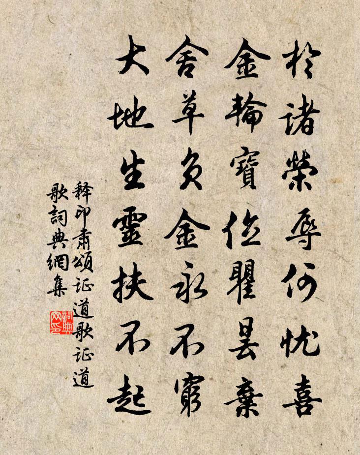 詩詞名句歷史字典書法欣賞書法字典國語詞典說文解字康熙字典古漢語字典標 題 作 者 詩 句 頌證道歌證道歌作者:釋印肅 朝代:宋代頌證道歌證道歌原文於諸榮辱何憂喜,金輪寶位瞿曇棄。舍草負金永不窮,大地生靈扶不起。詩詞問答問:頌證道歌證道歌的作者是誰?答:釋印肅問:頌證道歌證道歌寫於哪個朝代?答:宋代釋印肅頌證道歌證道歌書法欣賞頌證道歌證道歌書法作品詩詞推薦和吳叔永見寄韻李曾伯〔宋代〕詩懷今古浩無垠,誰寄梅花隴首人。芻豢悅心文字趣,筌蹄忘象性情真。相望夜月袁宏渚,一洗西風庚亮塵。我欲景德中朝會十四佚名〔宋代〕德水湯湯,發源靈長。皎鑒澄入,千年效祥。積厚流濕,資生阜昌。朝宗潤下,善利無疆。覽古四十二首 其五楊維楨〔元代〕韓厥戮趙仆,不以私害公。後人援此義,往往為逄蒙。曲逆不背本,事主可移忠。偉哉劉公論,呂布真難容。游永慶寺舒岳祥〔宋代〕慘澹蕪城暮,蕭疏野樹寒。登山不憚遠,反恐下山難。代文宣王答羅隱〔唐代〕三教之中儒最尊,止戈為武武尊文。吾今尚自披蓑笠,你等何須讀典墳。釋氏寶樓侵碧漢,道家宮殿拂青雲。若教夜遊曲鄭愔〔唐代〕漢室歡娛盛,魏國文雅遒。許史多暮宿,應陳從夜遊。西園宴公子,北里召王侯。詎似將軍獵,空嗟亭尉留。柳梢青佚名〔宋代〕曉星明滅。白 * 、秋風落葉。故址頹垣,荒煙衰草,溪前宮闕。長安道上行客,念依舊、名深利切。改變容顏,和少章喜晴李彌遜〔宋代〕日暮馬行疾,峰巒過眼頻。雨階長苦夜,晴谷似逢春。風月起歸恨,江天思故人。機心常已盡,唯有白頭新。雨晴陸游〔宋代〕山川炳煥似辟國,風雨退收如解嚴。老子真成無一事,抱孫負日坐茆檐。獻陳陶處士蓮花妓〔唐代〕蓮花為號玉為腮,珍重尚書遣妾來。處士不生巫峽夢,虛勞神女下陽台。朝飢賈島〔唐代〕市中有樵山,此舍朝無煙。井底有甘泉,釜中乃空然。我要見白日,雪來塞青天。坐聞西床琴,凍折兩三弦。飢莫登西樓憶行簡白居易〔唐代〕每因樓上西南望,始覺人間道路長。礙日暮山青簇簇,漫天秋水白茫茫。風波不見三年面,書信難傳萬里腸。早晚句傅彥濟〔宋代〕千里江山供眺望,四圍天地入簾櫳。海陵書事晁說之〔宋代〕今古悠悠嘉上同,徒令客子恨無窮。竹椽泥壓清虛節,葦爨香殊忠厚風。騰倚百年麋鹿外,波瀾一日鳳凰中。可憐和周仲容春日二律句楊萬里〔宋代〕今晨晴頗嬾,時夜雨猶聲。欲社燕先覺,半春鶯未嗚。詩非一家苦,句豈十分清。參透江西社,無燈眼亦明。又和曾秘丞見贈王禹偁〔宋代〕非才誤受帝恩深,報國空存一片心。命薄任從官進退,道孤難與眾浮沉。日邊信斷無歸夢,滁上公餘且醉吟。勞寄南樓懷古五首周弼〔宋代〕幸際清時息五兵,舌頑無處說縱橫。蟻封一夢難分別,蝸角千年強鬥爭。丹壁郵亭新蜀道,白樓烽戍古邾城。自知送從弟郎中赴浙西劉禹錫〔唐代〕銜命出尚書,新恩換使車。漢庭無右者,梁苑重歸歟。又食建業水,曾依京口居。共經何限事,賓主兩如初。送張匠臨以秘閣知贛州魏了翁〔宋代〕西南間氣忠獻公,一生心事天與通。才高志廣無處著,獨倚衡疑望關洛。九州風露方漫漫,卷回殘夢歸餘乾。惟將從驛次草堂復至東屯二首杜甫〔唐代〕峽內歸田客,江邊借馬騎。非尋戴安道,似向習家池。峽險風煙僻,天寒橘柚垂。築場看斂積,一學楚人為。短景名句推薦煙柳畫橋,風簾翠幕,參差十萬人家。柳永《望海潮·東南形勝》 郎騎竹馬來,繞床弄青梅。李白《長干行二首》 喜怒不形於色。房玄齡《晉書·列傳·第十九章》 強整繡衾,獨掩朱扉,枕簟為誰鋪設。阮逸女《花心動·春詞》 一畦春韭綠,十里稻花香。曹雪芹《菱荇鵝兒水》 情之所鍾,雖醜不嫌。沈復《浮生六記·閨房記樂》 何處秋風至?蕭蕭送雁群。劉禹錫《秋風引》 三五明月滿,四五蟾兔缺。佚名《孟冬寒氣至》 空山新雨後,天氣晚來秋。王維《山居秋暝》 路出大梁城,關河開曉晴。謝榛《渡黃河》