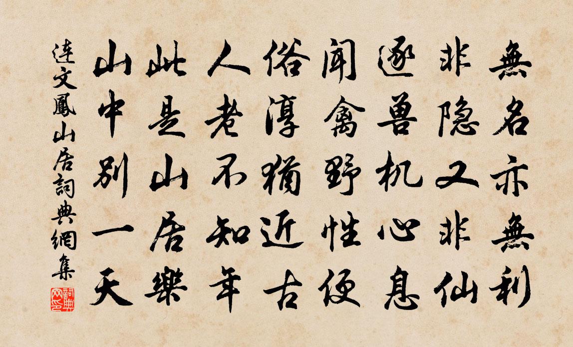 詩詞名句歷史字典書法欣賞書法字典國語詞典說文解字康熙字典古漢語字典標 題 作 者 詩 句 山居作者:連文鳳 朝代:宋代山居原文無名亦無利,非隱又非仙。逐獸機心息,聞禽野性便。俗淳猶近古,人老不知年。此是山居樂,山中別一天。詩詞問答問:山居的作者是誰?答:連文鳳問:山居寫於哪個朝代?答:宋代連文鳳山居書法欣賞山居書法作品詩詞推薦又題草衣岩胡寅〔宋代〕攜手童烏三尺強,已知經術勝文章。可憐不見凌雲日,迸灑西風淚幾行。答推官李珪李復〔宋代〕吾族柯條茂,人稱孝子賢。新游思我共,舊學欲誰傳。每愛鸞鴻志,徒嗟犬馬年。青雲如得路,驤首看揚鞭。送董稼山二首陳著〔宋代〕三年一去西山雲,一見欲別心知熏。勸君且為更上酒,何時得與細論文。句黃元夫〔宋代〕葦村風下鴉千點,麥隴天垂月一梳。呈知鄜州何士宗向敏中〔宋代〕勛將鐘鼓堪銘鏤,業為皇王致太平。貔虎有威開玉帳,犬戎無戰臥金鉦。天馬歌李白〔唐代〕天馬來出月支窟,背為虎文龍翼骨。嘶青雲,振綠髮,蘭筋權奇走滅沒。騰崑崙,歷西極,四足無一蹶。雞鳴刷燕贈宋相士謝枋得〔宋代〕墮甑看無益,乘軒計亦疏。忍貧吾自解,過論子姑徐。但得耆而艾,飽觀詩與書。時乎一杯酒,此外盡從渠。謫嶺南道中作李德裕〔唐代〕嶺水爭分路轉迷,桄榔椰葉暗蠻溪。愁沖毒霧逢蛇草,畏落沙蟲避燕泥。五月畬田收火米,三更津吏報潮雞。不堪送李殿院知防州夏竦〔宋代〕屈草聯芳映法冠,亭亭風度聳朝端。一麾出守秦城近,千里班春漢詔寬。引道畫旗迎馬重,褰帷霜簡照人寒。都門絕句歐陽鈇〔宋代〕為憐紅杏亞枝斜,看到斜陽送亂鴉。又是一春窮不死,天教留眼看鶯花。登清涼台寺劉過〔宋代〕江南江北許多山,到處登臨得憑欄。老木漸丹青有信,怒濤沖岸水生寒。倦遊半世烏三匝,往事千年指一彈。落日吟春文同〔宋代〕春工運潛巧,是處有行跡。庭梢發新潁,岩溜融暖脈。晴湖影撥刺,曉樹音格磔。須知玉峰下,日有尋芳客。和萬元亨舍人送芡實虞儔〔宋代〕吳興魚稻鄉,來視刺史印。適丁饑饉後,倉廩無餘蘊。當饋下不嚥,寧望饌中雋。年來稻如雲,便覺搖其吻。豐年異服王陶〔宋代〕辛有嘆被發,趙靈喜胡服。遂成陸渾戎,終有沙丘辱。用夷反變夏,亡禮以從俗。先王仁義術,詎用此求福。齊桓王維吳道子畫蘇軾〔宋代〕何處訪吳畫,普門與開元。開元有東塔,摩詰留手痕。吾觀畫品中,莫如二子尊。道子實雄放,浩如海波翻。當其瑞香花胡仲弓〔宋代〕生處多應散紫芝,清香端的與梅期。梅花剛被人描畫,卻是清香人不知。中峰林逋〔宋代〕中峰一徑分,盤折上幽雲。夕照前村見,秋濤隔嶺聞。長松含古翠,衰藥動微薰。自愛蘇門嘯,懷賢思不群。閒居即事劉學箕〔宋代〕山水縈洄處士家,春林環合翠交加。行吟溪岸牽垂柳,坐倚欄桿數落花。萬卉萬葩天長養,一丘一壑我生涯。長瓶句釋曉瑩〔宋代〕發興真成繼庾公。春貼子詞皇太后閣六首周麟之〔宋代〕曉箭催蓮漏,君王問寢時。光風浮玉琯,瑞靄映雲旗。名句推薦桑柘影斜春社散,家家扶得醉人歸。王駕《社日》 曾把梨花,寂寞淚闌乾朱淑真《江城子·賞春》 波面澄霞,蘭艇采香去。高觀國《祝英台近·荷花》 記曉葉題霜,秋燈吟雨,曾系長橋過艇。吳文英《十二郎·垂虹橋》 易其田疇,薄其稅斂,民可使富也。孟子《孟子·盡心章句上·第二十三節》 桃花潭水深千尺,不及汪倫送我情。李白《贈汪倫》 曉窗移枕,酒困香殘,春陰簾卷。吳文英《燭影搖紅·元夕雨》 大哉,時之相生也!達者可與幾矣。王通《中說·卷五·問易篇》 已忍伶俜十年事,強移棲息一枝安。杜甫《宿府》 參橫斗轉欲三更,苦雨終風也解晴。蘇軾《六月二十日夜渡海》