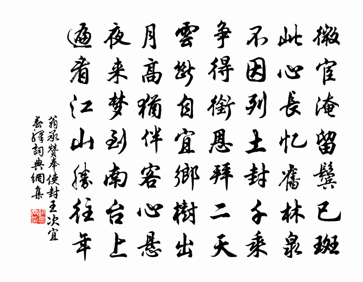 詩詞名句歷史字典書法欣賞書法字典國語詞典說文解字康熙字典古漢語字典標 題 作 者 詩 句 奉使封王次宜春驛作者:翁承贊 朝代:唐代奉使封王次宜春驛原文微宦淹留鬢已斑,此心長憶舊林泉。不因列土封千乘,爭得銜恩拜二天。雲斷自宜鄉樹出,月高猶伴客心懸。夜來夢到南台上,遍看江山勝往年。詩詞問答問:奉使封王次宜春驛的作者是誰?答:翁承贊問:奉使封王次宜春驛寫於哪個朝代?答:唐代問:奉使封王次宜春驛是什麼體裁?答:七律翁承贊奉使封王次宜春驛書法欣賞奉使封王次宜春驛書法作品注釋全唐詩:卷703-12詩詞推薦答元郎中、楊員外喜烏見寄 四十四字成。白居易〔唐代〕南宮鴛鴦地,何忽烏來止?故人錦帳郎,聞烏笑相視。疑烏報訊息,望我歸鄉里。我歸應待烏頭白,慚愧元郎誤歡送陳戶曹之官襄陽二首劉克莊〔宋代〕幕府秋風事日生,參軍匹馬去兼程。起為楚舞何其壯,吟退胡兵在此行。且喜峴山碑有跋,不愁江表傳無名。老儒幽居述事陸游〔宋代〕舴艋東歸喜遂初,頻拈枯筆賦幽居。細燒柏子供清坐,明點松肪讀道書。蒼爪嫩芽開露茗,紅根小把瀹煙蔬。年來青玉案黃公度〔宋代〕之。及泉幕任滿,始以故事召赴行在,公雖知非當路意,而迫於君命,不敢俟駕,故寓意此詞。道過分水嶺,復題寓嘆陸游〔宋代〕五福惟無富,嗟予得已多。禪房時托宿,酒市每酣歌。詩瘦慵看鏡,棋鏖恐爛柯。殘年猶有幾,切莫負漁蓑。過楊德逢莊王安石〔宋代〕攜僧出西路,日晏昧所投。循河望積穀,一飽覺易謀。稚子舉桉出,咄嗟見盤羞。飯新秔有香,煮菜旨且柔。暮從詠懷文天祥〔宋代〕陰陽相烹然,天地一釜鬵。人生居其間,便同肉在砧。熱猶以火燎,濕猶以湯潯。一歲一煅煉,老形忽駸駸。吾生臨江仙(和陳德公)王之道〔宋代〕紅樓縹緲光風裡,熙熙和氣歡聲。遏雲餘韻最關情。春山閒淡淡,秋水醉盈盈。老去自憐心尚在,相逢殊慰勞生。次前韻寄子由蘇軾〔宋代〕我少即多難,邅回一生中。百年不易滿,寸寸彎強弓。老矣復何言,榮辱今兩空。泥丸尚一路,(古語云,十方薄夜懷鄭獬〔宋代〕獨倚青桐聽鼓聲,參旗歷落上三更。涼風卷雨忽中斷,明月背雲還倒行。賴有清吟消意馬,豈無美酒破愁城。是非和汝霖三首胡寅〔宋代〕桃李無言春事深,便看園樹欲交陰。永懷北固吹長笛,一 * 典破衾。金羽喜從幽谷出,錦鱗貪引翠竿沉。好傳罷徐州,往南京,馬上走筆寄子由五首蘇軾〔宋代〕卜田向何許,石佛山南路。下有爾家川,千畦種粳稌。山泉宅龍蜃,平地走膏乳。異時畝一金,近欲為逃戶。逝將江城子(一名水晶簾)韋莊〔唐代〕恩重嬌多情易傷,漏更長,解鴛鴦。朱唇未動,先覺口脂香。緩揭繡衾抽皓腕,移鳳枕,枕檀郎。髻鬟狼藉黛眉長昭君怨 詠荷上雨楊萬里〔宋代〕午夢扁舟花底,香滿西湖煙水。急雨打篷聲,夢初驚。卻是池荷跳雨,散了真珠還聚。聚作水銀窩,泛清波。浣溪沙李氏〔宋代〕無力薔薇帶雨低。多情蝴蝶趁花飛。流水飄香乳燕啼。南浦魂銷春不管,東陽衣減鏡仙知。小樓今夜月依依。題鑒止軒陳棣〔宋代〕安身南北皆吾里,勿較使行兼尼止。心猶泥絮吹不起,豈有顏甲生微泚。方塘淨綠含真理,與我娛嬉聊爾爾。佳處題義門胡氏華林書院師禎〔宋代〕滿架高峰隱史書,英儒冠蓋會仙居。雲霞滿屋光難掩,松柏數庭景有餘。累世子孫傳孝義,一時旌表在門閭。要知廣亡徙海唐涇〔宋代〕箕冠如櫛擁茅旌,誰執騂旄歃晉盟。遵海而南關氣數,渡江以北少功名。火旗晻靄雲藏闕,水陣周遭雪壓城。一榻觀書吟邵雍〔宋代〕吁嗟四代帝王權,盡入區區一舊編。或讓或爭三萬里,相因相革二千年。唐虞事業誰能繼,湯武功夫世莫傳。時既寄題浮梁縣豐樂亭金君卿〔宋代〕百流桃南瀉昌江桃潯,涵光桃吐潤生良桃金。從前良令固無幾,矧復惠政留於今。四十年來耆舊語,李謝劉楊遺愛名句推薦無錢休入眾,遭難莫尋親。佚名《增廣賢文·上集》 秋風生渭水,落葉滿長安。賈島《憶江上吳處士》 浮雲一別後,流水十年間。韋應物《淮上喜會梁川故人 / 淮上喜會梁州故人》 人生一世,草長一春。佚名《增廣賢文·上集》 力微休負重,言輕莫勸人。佚名《增廣賢文·上集》 狗馬飾雕文,土木被緹繡。范曄《後漢書·列傳·宦者列傳》 獨憐幽草澗邊生,上有黃鸝深樹鳴。韋應物《滁州西澗》 花谷依然,秀靨偷春小桃李。吳文英《荔枝香近·送人游南徐》 榮螈,蜥蜴。佚名《爾雅·釋魚》 菊花何太苦,遭此兩重陽?李白《九月十日即事》
