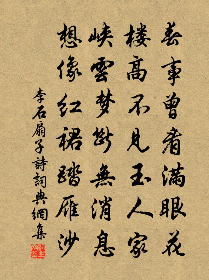 詩詞名句歷史字典書法欣賞書法字典國語詞典說文解字康熙字典古漢語字典標 題 作 者 詩 句 扇子詩作者:李石 朝代:宋代扇子詩原文春事曾看滿眼花,樓高不見玉人家。峽雲夢斷無訊息,想像紅裙踏雁沙。詩詞問答問:扇子詩的作者是誰?答:李石問:扇子詩寫於哪個朝代?答:宋代李石扇子詩書法欣賞扇子詩書法作品詩詞推薦燈花舒岳祥〔宋代〕眾花皆可喜,最好是燈花。好結無風屋,偏生有慶家。案頭生瑞菌,火里養丹妙。清夜開樽看,山人被詔加。歐陽永叔寄琅琊山李陽冰篆十八字並永叔詩一梅堯臣〔宋代〕我坐許昌塵土中,山翠泉聲違眼耳。公雖被謫守滁陽,日少郡事窮山水。東南有風西北來,忽得書詩連數紙。並寄讀劉靖君碑薛師石〔宋代〕儒生身上事皆成,身外浮華亦堪輕。種竹滿山門徑小,掛冠當路樹枝橫。幾於顏子三生壽,分得陶潛一字名。何處和詣岩祈雨皇甫韶〔宋代〕路盡山尤勝,溪深水愈豪。寺樓今不見,依舊五峰高。卜運算元劉克莊〔宋代〕東甽寧馨兒,南國循良守。先把爐熏祝帝堯,次祝君侯壽。廣致米商船,多釀兵廚酒。客有鬚眉似蓋延,許至華堂贈張公賁張耒〔宋代〕我昔為諸生,春書諫議公。後來辱稱獎,禮數賓客同。決科甫弱冠,年少氣如虹。歸來陪後乘,不責醉後恭。孤舟櫻桃張祜〔唐代〕石榴未拆梅猶小,愛此山花四五株。斜日庭前風裊裊,碧油千片漏紅珠。坦老求題真歇宏智竹庵同游雁山酬唱真跡軸後釋紹曇〔宋代〕天生三個老冤魔,狹路相逢沒柰何,□把肚腸摟抉看,曲於四十九盤多。和秉國芙蓉五章司馬光〔宋代〕平昔低頭避桃李,英華今發歲雲秋。盛時已過渾中我,醉舞狂歌插滿頭。蝶戀花陳允平〔宋代〕樓上鍾殘人漸定。庭戶沉沉,月落梧桐井。悶倚瑣窗燈炯炯。獸香閒伴銀屏冷。淅瀝西風吹雁影。一曲胡笳,別後南柯子 與背道者劉志淵〔元代〕久靜還思動,情甘愛海迷。仙凡兩路似雲泥。從此相分,不顧上天梯。莫學鷦鷯志,營營戀小枝。北溟鯤量願君為聞雁高啟〔明代〕江寒月黑夜,定宿蒹葭里。叫叫過燈前,卻是誰驚起?簡豎儒劉兼〔唐代〕蹄涔豈信有滄浪,螢火何堪並太陽。淵奧未曾探禹穴,矜誇便擬越丘牆。小巫神氣終須怯,下里音聲必不長。近日罷縣解歸途中聞子規三首曾豐〔宋代〕黎侯無補邑之民,業已言歸豈誑人。中露泥中非所戀,子規何用更諄諄。乙巳邵武建寧夜坐書呈諸公陳普〔宋代〕一合乾坤貯鬼神,入虛何敢謂無人。暗中射鮒誰知見,繞市青衣說與人。傷舊遊孟郊〔唐代〕去春會處今春歸,花數不減人數稀。朝笑片時暮成泣,東風一向還西輝。過閶門溪二首楊萬里〔宋代〕中通翠浪才容線,仰看青天細似盆。艷澦瞿唐姑未問,秖經此險已銷魂。和子瞻次韻陶淵明停雲詩蘇轍〔宋代〕欣然而笑,是無枯榮。手足相依,所鍾則情。情忘意消,神凝不征。可以安身,可以長生。九月十日即事陳羽〔唐代〕漢江天外東流去,巴塞連山萬里秋。節過重陽人病起,一枝殘菊不勝愁。贈東皋恭行人陳允平〔宋代〕重門臨驛路,幾向月中開。殿勢江山合,鐘聲雲水來。長吟松濺瀑,久定石生苔。九品金沙觀,青蓮次第栽。名句推薦池塘生春草,園柳變鳴禽。謝靈運《登池上樓》 缺月掛疏桐,漏斷人初靜。蘇軾《卜運算元·黃州定慧院寓居作》 大者不能,小者不為,是棄國捐身之道也。荀子《荀子·大略》 天與短因緣,聚散常容易。晏幾道《生查子·狂花頃刻香》 淅淅西風淡淡煙,幾點疏疏雨。葛立方《卜運算元·席間再作》 小荷才露尖尖角,早有蜻蜓立上頭。楊萬里《小池》 細雨春蕪上林苑,頹垣夜月洛陽宮。陸游《書憤五首·其二》 舉目山河異,偏傷周顗情。李白《金陵新亭》 清水出芙蓉,天然去雕飾。李白《經亂離後天恩流夜郎憶舊遊書懷贈江夏韋太守良宰》 雪裡溫柔,水邊明秀,不借春工力。辛棄疾《念奴嬌·梅》