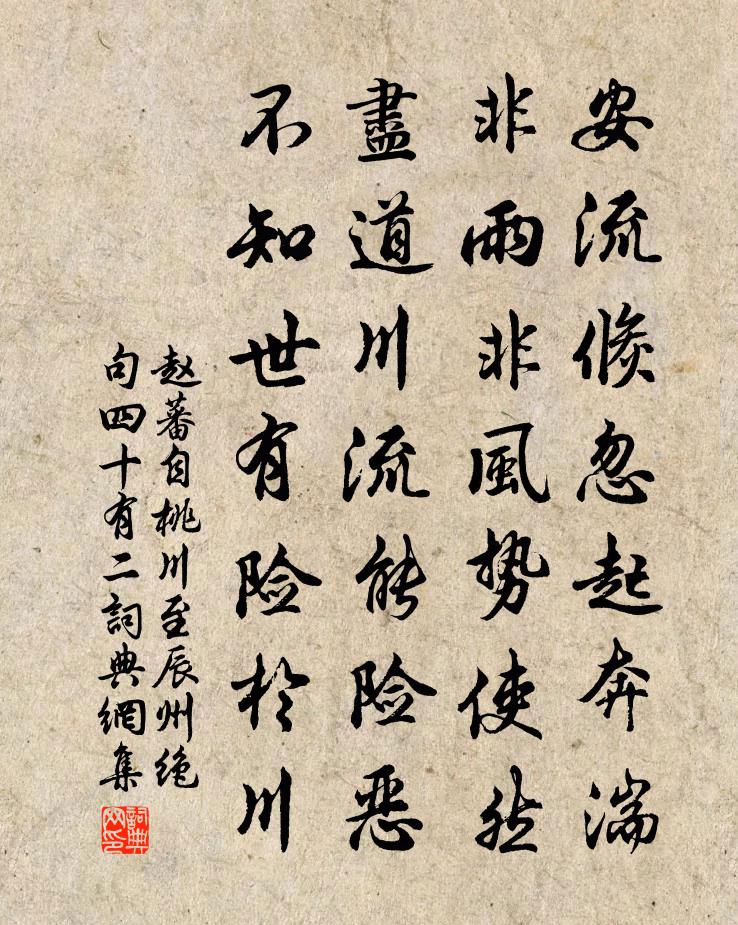 詩詞名句歷史字典書法欣賞書法字典國語詞典說文解字康熙字典古漢語字典標 題 作 者 詩 句 自桃川至辰州絕句四十有二作者:趙蕃 朝代:宋代自桃川至辰州絕句四十有二原文安流倏忽起奔湍,非雨非風勢使然。盡道川流能險惡,不知世有險於川。詩詞問答問:自桃川至辰州絕句四十有二的作者是誰?答:趙蕃問:自桃川至辰州絕句四十有二寫於哪個朝代?答:宋代趙蕃自桃川至辰州絕句四十有二書法欣賞自桃川至辰州絕句四十有二書法作品詩詞推薦朝中措(戲贈鄭乾)韓淲〔宋代〕扁舟撐月轉江湖。煙水湛金鋪。篷底曉涼歌罷,肌膚冰雪初扶。詩人自是風塵表,佳處句能摹。屬玉一雙飛去,荷水龍吟周紫芝〔宋代〕楚山千疊浮空,楚雲只在巫山往。鸞飛鳳舞,當時空記,夢中奇語。曉日瞳曨,夕陽零亂,裊紅縈素。問如今依舊贈謝敞王博喻黃庭堅〔宋代〕高哉孔孟如秋月,萬古清光仰照臨。千里特來求驥馬,兩生於此敵南金。文章最怨隨人後,道德無多隻本心。廢軫羅子琳來就廣漕試予以檄出至西江峽口懷古感曾豐〔宋代〕摹寫閒泉石,雕鎪病肺肝。得無縻歲月,終不補饑寒。上固詔求上,誰將詩得官。何如經學熟,隨計上長安。偈頌二百零五首釋正覺〔宋代〕端公問處來,徑直勿迂迴。善財處處逢彌勒,彈指作聲樓閣開。搗練子王哲〔元代〕一為人。做凡身。四般假合怎生真。*哩,哩*。搜玄路,出迷津。靜中調養氣精神。*哩,哩*。周祀方澤歌 皇夏庾信〔南北朝〕司筵撤席。掌禮移次。回顧封壇。恭臨坎位。瘞玉埋俎。藏芬斂氣。是曰就幽。成斯地意。贊歷代天師第七代諱仲回字德昌白玉蟾〔宋代〕當年辟穀煉仙丹,召雨呼雷譬似閒。四海有人膺寶籙,笑攜筇去鶴鳴山。滁上間日陰晴聯句刁繹〔宋代〕陰晴淮海氣何殊,一昔風光互慘舒。大塊養春裨造化,繁雲間日蔽居諸。暖回沙磧催來雁,寒徹冰池怯上魚。山色對月寄雍陶劉得仁〔唐代〕圓明寒魄上,天地一光中。臨水通宵坐,知君此興同。華凝衣有露,靜極樹無風。若向湘江見,湘江徹底空。和懷英雪詩李處權〔宋代〕路迷應有誤隨車,望眼樓高莫可涯。鶴駕鷺濤來浩渺,瑤林瓊樹出交加。廣寒玉兔翻羞縮,上蔡蒼鷹正怒拏。得句早朝十絕趙子潚〔宋代〕門門閶闔早春初,恭構龍飛御太虛。聖德巍巍隆譽望,坐令四海誦唐虞。和僧長吉湖居五題其四風笛范仲淹〔宋代〕風引湖邊笛,焉知非隱淪。一聲裂雲去,明月生精神。無為落梅調,留寄隴頭人。武帝徐鈞〔宋代〕休道君王學苦空,要知積善福無窮。二梁猶僅存遺號,八相與唐同始終。贈王君詔道人郭印〔宋代〕潤屋金多笑不居,卻從象罔索玄珠。千年古鏡心長靜,萬里飛雲身自孤。空里結空空復有,夢中占夢夢元無。休將次張學錄韻十首陳造〔宋代〕廣文無酒錢,到官倏改火。清譚坐蕭齋,惟子屢過我。次伯仁善利閣小室韻裘萬頃〔宋代〕山林吾所廬,夜月但對影。焉知江上人,一日了萬境。褰裳步崇台,有室妍且靜。徘徊不能去,坐見四山暝。合溪水漲寄敬山人劉商〔唐代〕共愛碧谿臨水住,相思來往踐莓苔。而今卻欲嫌溪水,雨漲春流隔往來。偶吟白居易〔唐代〕里巷多通水,林園盡不扃。松身為外戶,池面是中庭。元氏詩三帙,陳家酒一瓶。醉來狂發詠,鄰女映籬聽。風雨陸游〔宋代〕風雨連三日,衰翁不下堂。弄書聊自適,與世已相忘。坼栗經霜飽,搓橙帶露香。地爐供小飲,亦足慰淒涼。名句推薦試問閒愁都幾許?賀鑄《青玉案·凌波不過橫塘路》 身既死兮神以靈,魂魄毅兮為鬼雄。屈原《國殤》 東君也不愛惜,雪壓霜欺。晁沖之《漢宮春·梅》 不如歸去下簾鉤,心兒小,難著許多愁吳淑姬《小重山·謝了荼蘼春事休》 若言琴上有琴聲,放在匣中何不鳴?蘇軾《琴詩》 讀書須用意,一字值千金。佚名《增廣賢文·上集》 士君子立言,貴平正,尤貴精詳。王永彬《圍爐夜話·第二五則》 錦江春色來天地,玉壘浮雲變古今。杜甫《登樓》 秋至搗羅紈,淚滿未能開。江淹《悼室人》 蕭蕭梧葉送寒聲,江上秋風動客情。葉紹翁《夜書所見》