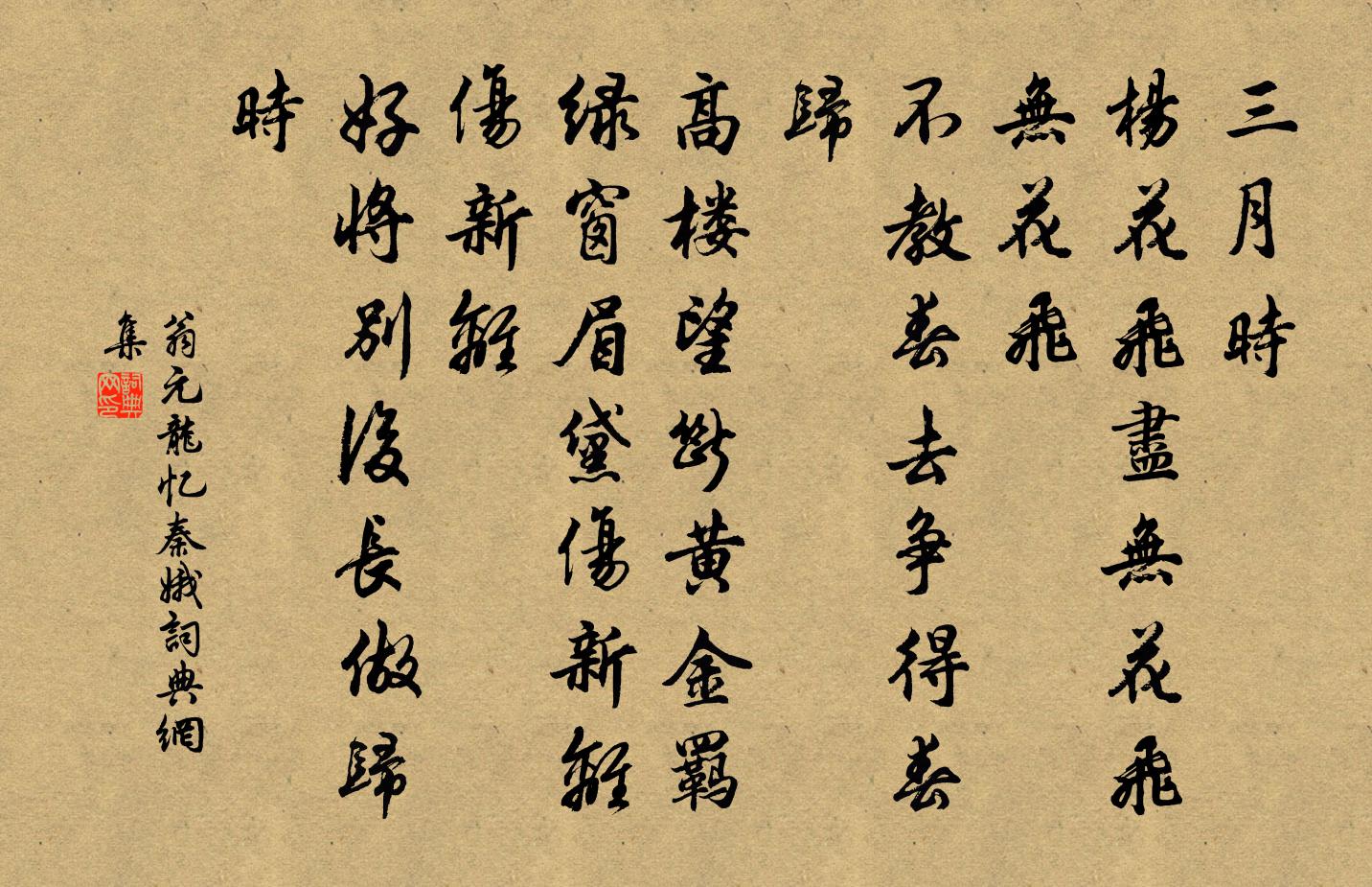 詩詞名句歷史字典書法欣賞書法字典國語詞典說文解字康熙字典古漢語字典標 題 作 者 詩 句 憶秦娥作者:翁元龍 朝代:宋代憶秦娥原文三月時。楊花飛盡無花飛。無花飛。不教春去,爭得春歸。高樓望斷黃金羈。綠窗眉黛傷新離。傷新離。好將別後,長做歸時。詩詞問答問:憶秦娥的作者是誰?答:翁元龍問:憶秦娥寫於哪個朝代?答:宋代問:憶秦娥是什麼體裁?答:詞翁元龍憶秦娥書法欣賞憶秦娥書法作品詩詞推薦客中二絕李流謙〔宋代〕角聲定自與誰語,月色不應無為明。已作楊花著泥久,無多心事惹愁生。次韻答陳之方秘丞蘇轍〔宋代〕南山李將軍,疋馬獨行獵。田中射虎豹,後騎不容躡。丈夫貴自遂,老大饒驚懾。飄搖天地間,自視如一葉。故人初及第歸題淨慈寺壁二絕劉渙〔宋代〕彤扉新授紫皇宣,品作蓬壺二等仙。今日訪師無限意,應憐憔悴勝當年。寄龔漕六首吳芾〔宋代〕貢院門前並北湖,有田百畝卻荒蕪。願君種取花千樹,付與邦人作畫圖。七夕詩江總〔隋代〕漢曲天榆冷。河邊月桂秋。婉孌期今夕。霰颻渡淺流。輪隨列宿動。路逐彩雲浮。橫波翻瀉淚。束素反緘愁。此時回愚方回〔宋代〕人云回也樂,愚亦定何如。瘠產今無幾,荒園尚有餘。離騷香草木,爾雅古蟲魚。名數誰能記,年來懶著書。送水雲歸吳林順德〔宋代〕歸舟夜泊西興渡,坐看潮來又潮去。江草江花春復春,山青水綠原如故。自平杜甫〔唐代〕自平宮中呂太一,收珠南海千餘日。近供生犀翡翠稀,復恐征戎干戈密。蠻溪豪族小動搖,世封刺史非時朝。蓬萊自諷薛能〔唐代〕千題萬詠過三旬,忘食貪魔作瘦人。行處便吟君莫笑,就中詩病不任春。送客入蜀楊凝〔唐代〕劍閣迢迢夢想間,行人歸路繞樑山。明朝騎馬搖鞭去,秋雨槐花子午關。【中呂】粉蝶兒_集曲名題秋王仲元〔元代〕集曲名題秋怨雙雁兒聲悲,景瀟瀟楚江秋意,勝陽關刮地風吹。滿庭芳,梧桐樹,全蕉葉墜。慶東原金菊香滴滴金王伯厚以詩招伯渾次韻同往邀之晁公溯〔宋代〕憶昨歸來萬里遙,不能對策未央朝。山林得計成長往,松石為朋是久要。痛飲肯來同榼挈,小詩聊遣當弓招。請君孟夏雩祀二首佚名〔宋代〕龍見而雩,神之來格。牲象精良,威靈赫奕。題靈山寺行堅師院許渾〔唐代〕西岩一徑不通樵,八十持杯未覺遙。龍在石潭聞夜雨,雁移沙渚見秋潮。經函露濕文多暗,香印風吹字半銷。應笑酹江月/念奴嬌葛長庚〔宋代〕漢江花北瀉,下花長淮、洗花盡胸中今花古。樓櫓橫波征雁遠,誰見魚龍夜舞。鸚鵡洲雲,鳳凰池月,付與沙頭鷺夜枕張埴〔宋代〕春風陳榻下,夜月庾樓前。疊疊鳴檛落,翻翻警枕眠。祗能欹待旦,何有夢飛天。此意誰能解,如流二十年。甫里王令〔宋代〕甫里先生得古風,放身全入隱淪中。足磨漢榻星辰動,筆挫吳天物象空。往事欲尋人寂寂,舊田安在雨濛濛。當時和音宋祁〔宋代〕危弦度曲汎孤鉤,一世知音未易求。直把將雛為陌上,主人猶復自搖頭。東風王令〔宋代〕東風來幾日,窮巷不見春。不知得花由,只見插花人。東風能幾時,聽爾多歡欣。徒恐春風歸,汝我同悲辛。燒藥不成命酒獨醉白居易〔唐代〕白髮逢秋王,丹砂見火空。不能留奼女,爭免作衰翁。賴有杯中綠,能為面上紅。少年心不遠,只在半酣中。名句推薦靡蕪盈手泣斜暉,聞道鄰家夫婿歸。魚玄機《閨怨》 念故人,千里至此共明月。寇準《踏莎行·寒草煙光闊》 昨日入城市,歸來淚滿巾。張俞《蠶婦》 歌聲未盡處,先淚零周邦彥《綺寮怨·上馬人扶殘醉》 亞夫營畔柳濛濛,隋主堤邊四路通。汪遵《楊柳》 綠竹入幽徑,青蘿拂行衣。李白《下終南山過斛斯山人宿置酒》 人生不可安閒,有恆業,才足收放心王永彬《圍爐夜話·第八三則》 年時俯仰過,功名宜速崇。張華《壯士篇》 眉尖早識愁滋味,嬌羞未解論心事。黃公度《菩薩蠻·眉尖早識愁滋味》 萬里平湖秋色冷,星辰垂影參然。牛希濟《臨江仙·洞庭波浪颭晴天》